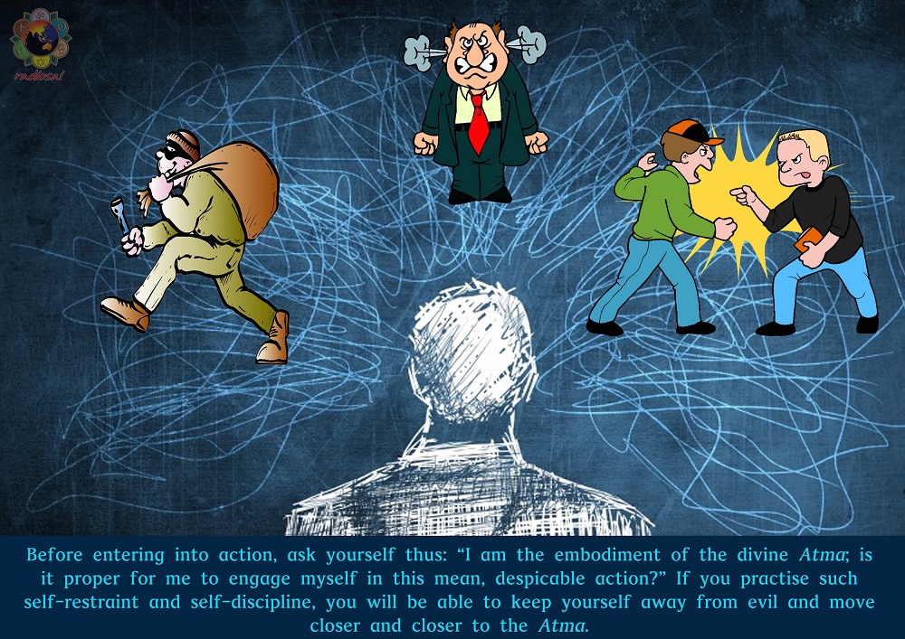• “Atma is the conscience residing inside. Whatever activity one does, it must please the conscience. One’s conscience tells the mistake made. One may cover up one’s defects and argue with others, but if his conscience tells, “Yes there are defects”, then argumentation and covering up is futile. Conscience always speaks the truth. This is the inner voice, internal talk and internal connection.”
