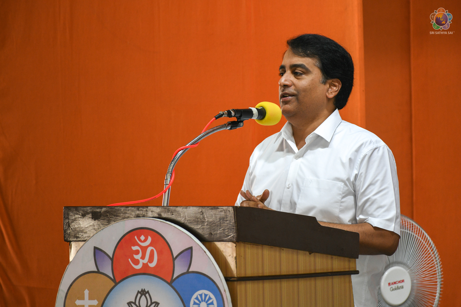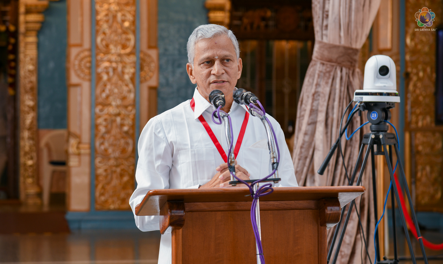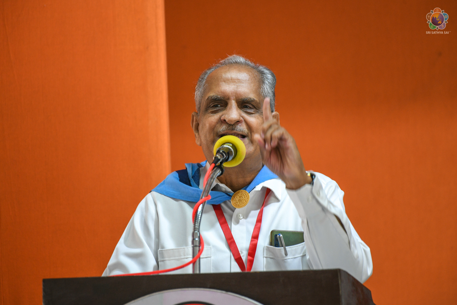 The Managing Trustee of SSSCT, Sri RJ Rathnakar, who addressed the gathering next on the topic 'Sri Sathya Sai Mission'. Speaking about how unique the Organisation is, in his analogy of river Ganga & Organisation, he mentioned that people who take a dip in it benefit from it and get sanctified by it, and it is not the other way around. Laying emphasis on the importance of collective decision-making in the organisation, he urged that the loyalty and integrity should be committed to Bhagawan alone in the Organisation.