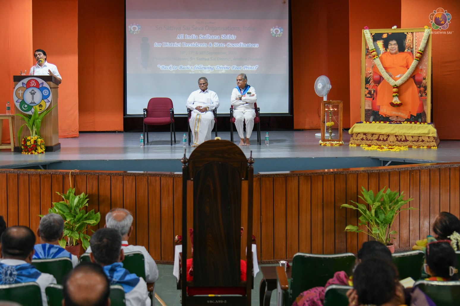 The inaugural proceedings began with a traditional lamp-lighting ceremony by the Trustees of the Sri Sathya Sai Central Trust and dignitaries from SSSSO at the Sai Kulwant Hall. This was followed by an introductory talk by National Seva Co-ordinator Sri Koteswara Rao who presented the idea behind the Sadhana camp, reminding the participants that Swami's spiritual vision behind the Seva Organisation was the sole purpose for which He allowed His Divine Name to be used for it. The motive of the Organisation is 'To enable individuals to take up Seva as a means of Spiritual Sadhana'.