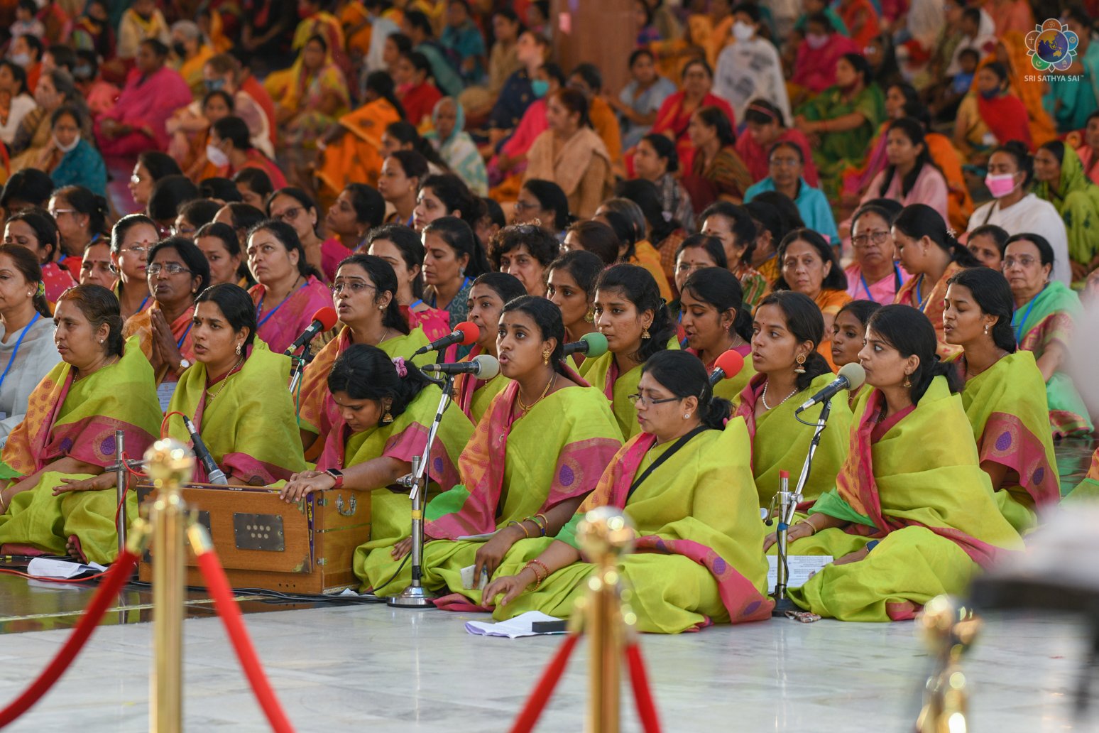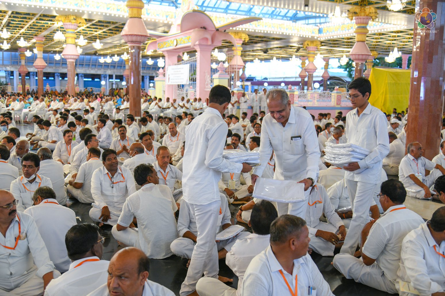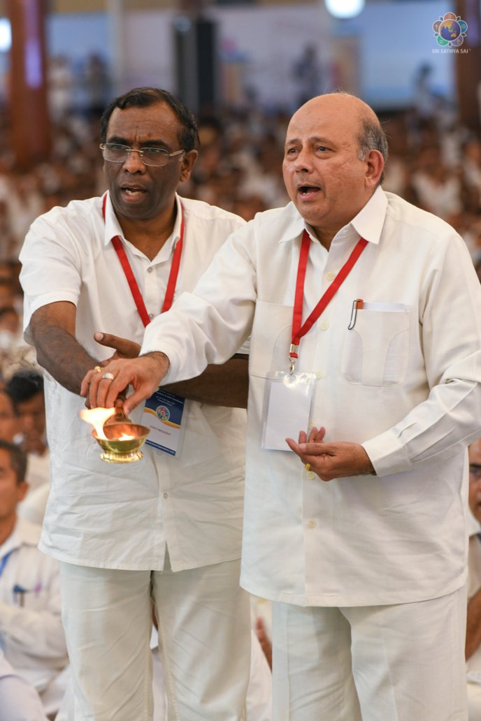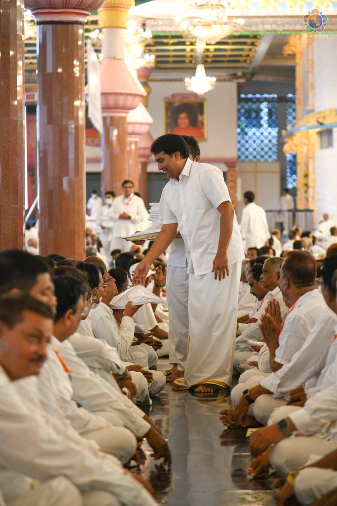 Swararchana | Devotional Music Program | Sep 17, 2022 Loving Sai Ram and Greetings from Prasanthi Nilayam. More than 700 Office Bearers from Sri Sathya Sai Seva Organisations, India have gathered here as part of the three day Sadhana Camp for the District Presidents & State Level Convenors. The evening proceedings began with Vedam Chanting by the National Gents Vedam group followed by a Devotional Music Program offered by the Sundaram Bhajan Group. Swami’s Prasadam in the form of sarees and safaris were given to the delegates who participated in the conference.