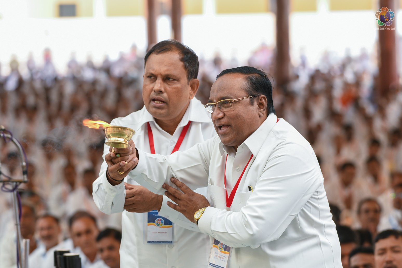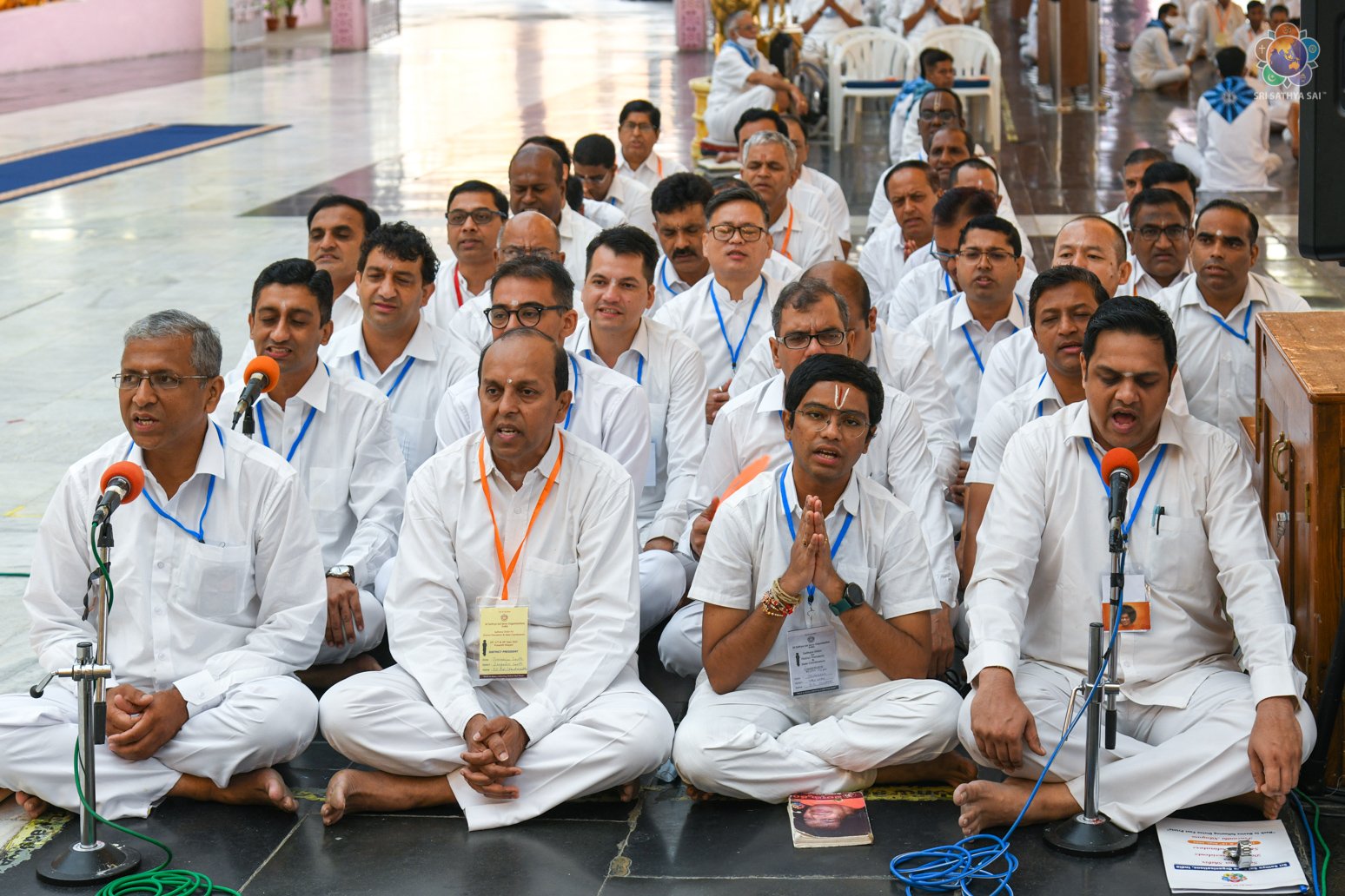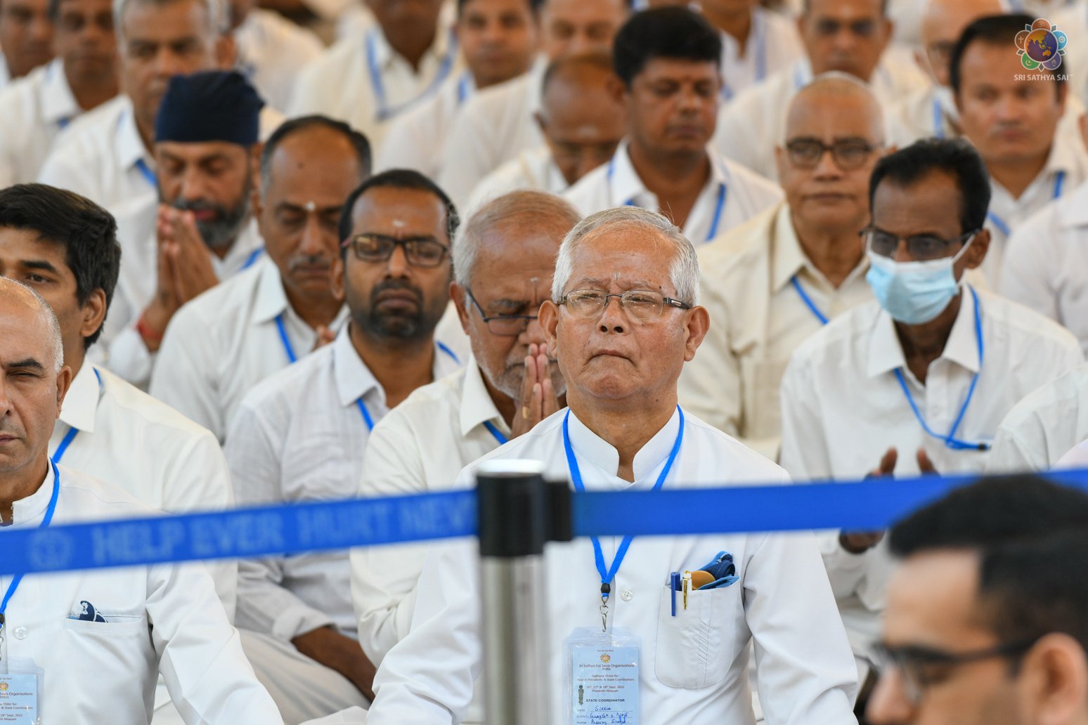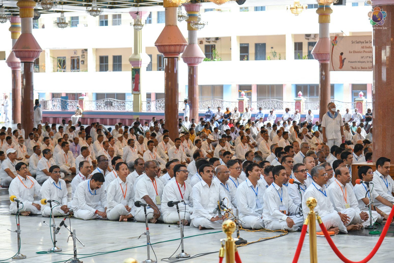 Concluding Session | Sadhana Camp | Sep 18, 2022 Loving Sai Ram and Greetings from Prasanthi Nilayam. The concluding session of the three-day Sadhana Camp for the District Presidents, State Level Convenors and Office Bearers of the Sri Sathya Sai Seva Organisations, India, started with the ceremonial Vedam Chanting by National Gents Vedam Group. Sri Nimish Pandya, President, SSSSO - India addressed the gathering on the theme, 'Way Forward with Back to Basics on Bhagawan’s Teachings’. Thanking all the delegates for the participation, he emphasised on how blessed and chosen each office bearer is in Swami’s Mission. All the office bearers, in their pledge, then prayed to Bhagawan to guide them in taking forward HIS Mission in the way Bhagawan envisioned.