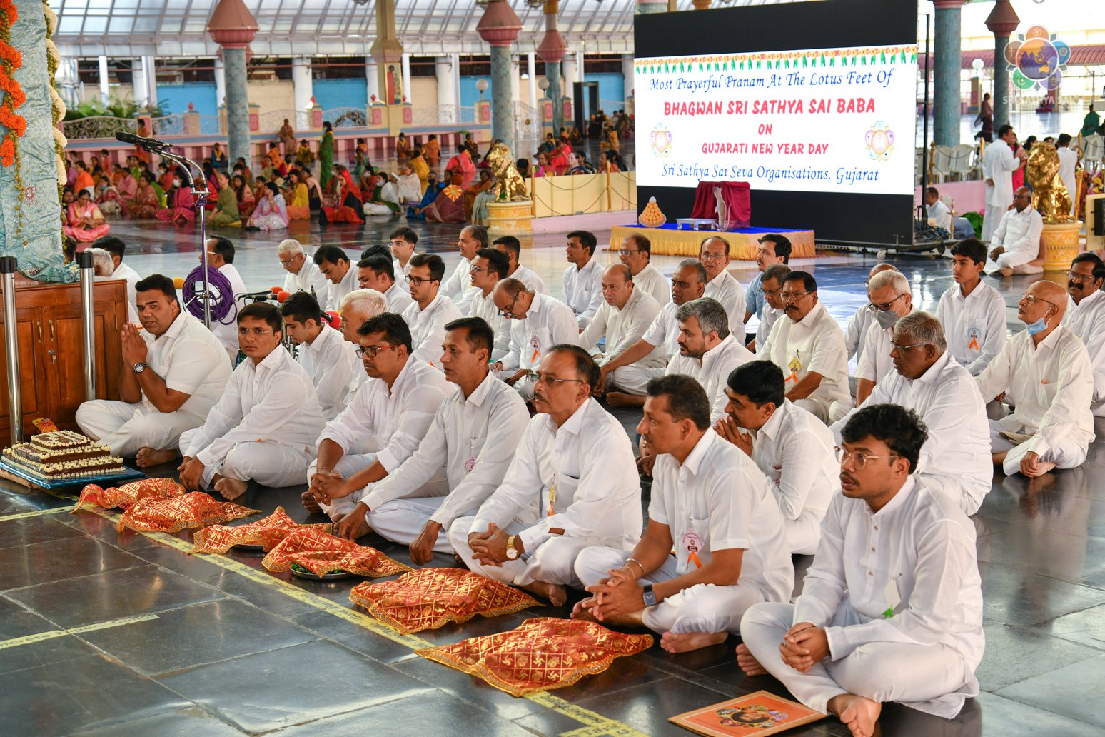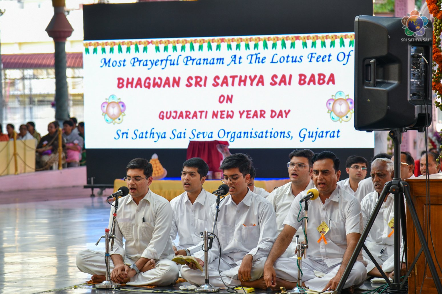 Loving Sai Ram and Greetings from Prasanthi Nilayam. More than 500 devotees from Gujarat have gathered here to celebrate their New Year in the Divine Presence of Bhagawan Sri Sathya Sai Baba. Extending the warm greetings, Sri Hemant Bhai Patel, State President, SSSSO, Gujarat presented the seva activities report. The devotees from Sai Ojas Group then offered a devotional music program. Please find below the glimpses of the same below.