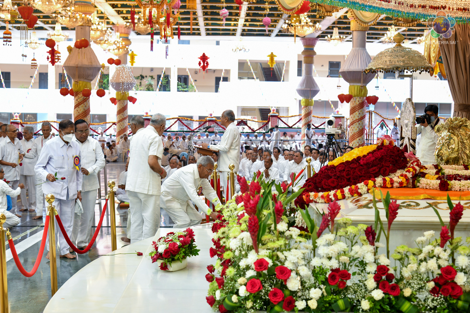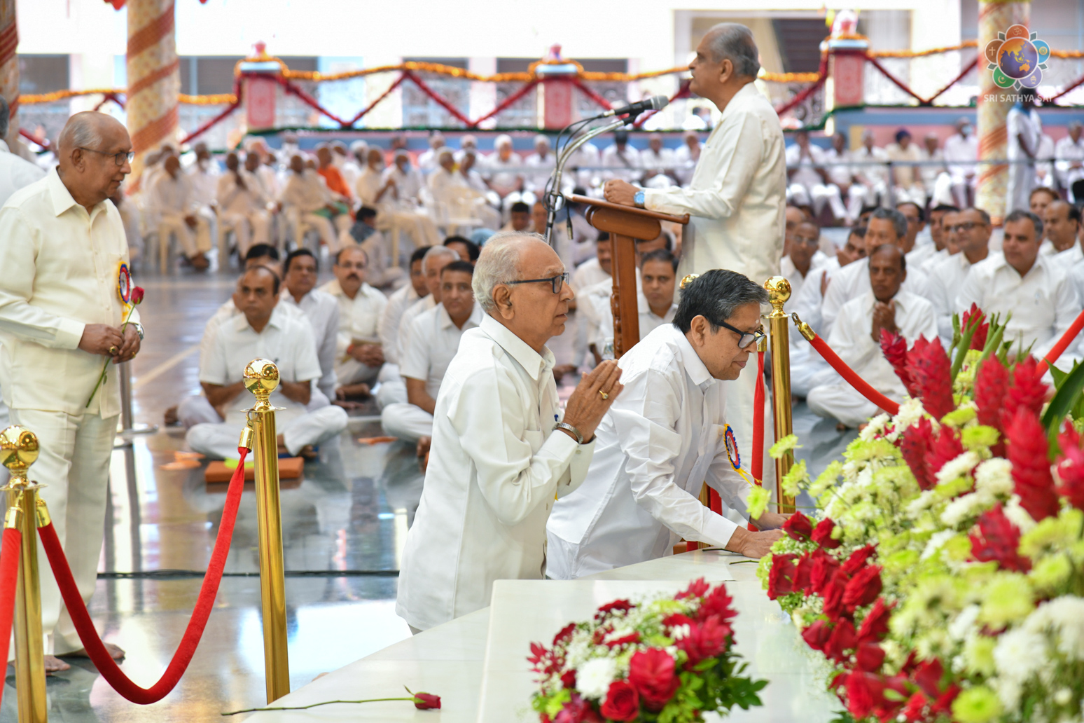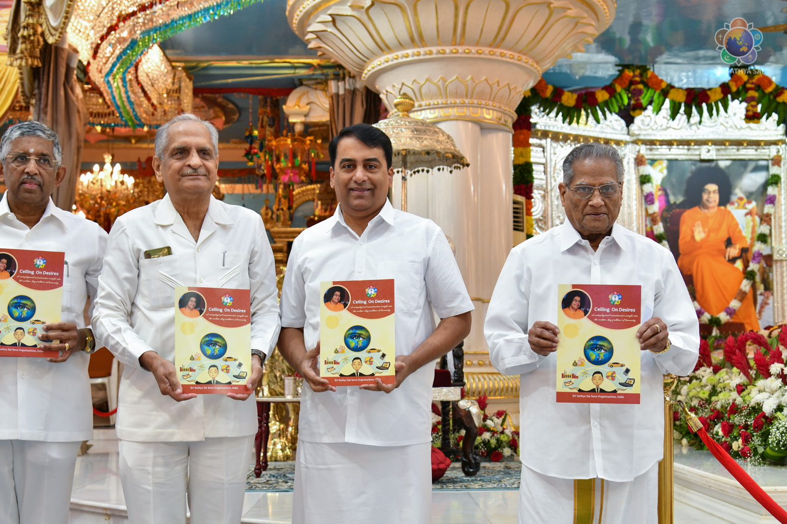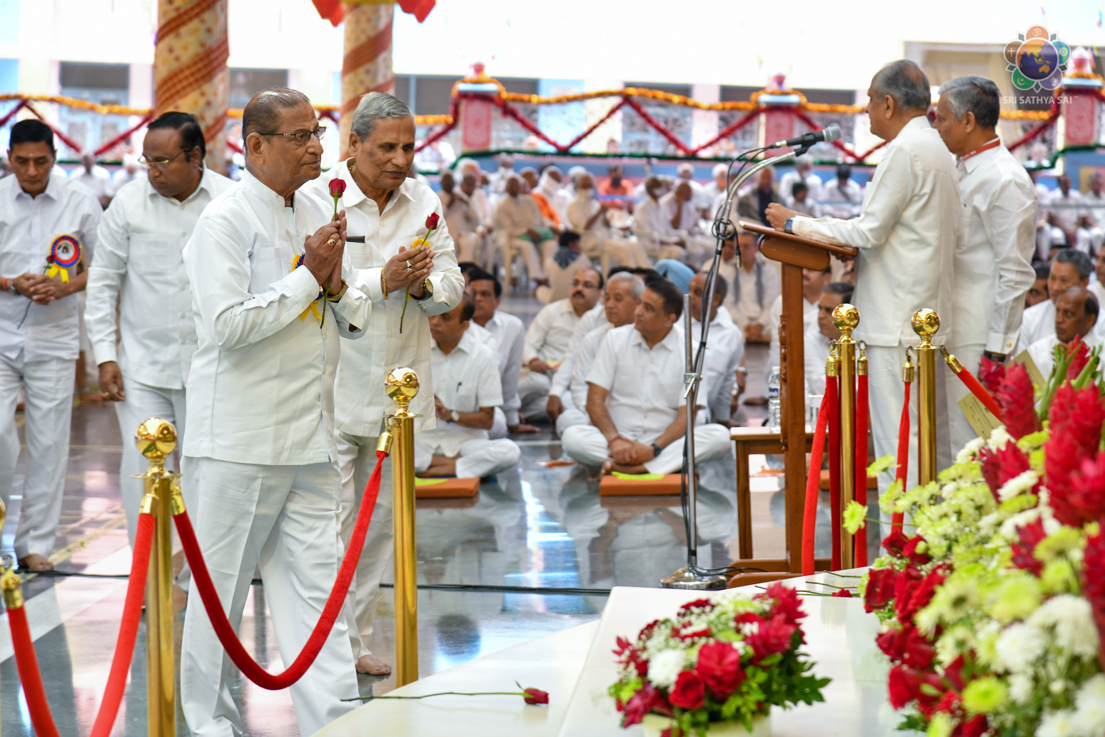 Loving Sai Ram and Greetings from Prasanthi Nilayam. Bhagawan would often remind us that the purpose of Seva is to realise the Truth that Divinity is to be found in one's own self by serving the Divine in others. In His immense love, He initiated devotees into the 'Ceiling on Desires' program to aid in this supreme journey. As we approach the centenary celebrations, SSSSO-India reaffirmed its commitment to this program, taking a vow to practice this command as an offering to Swami. After the launch of a brochure on ‘Ceiling on Desires' by Sri K Chakravarthi (Chairman, SSSGC), Sri RJ Rathnakar (Managing Trustee, SSSCT), Dr V Mohan (Trustee, SSSCT) and Sri Nimish Pandya (AIP, SSSSO-India), Sri Pandya addressed the gathering on the topic. This was followed by a heartfelt gesture of gratitude where those who have served Bhagawan over the years by holding senior positions in the SSSSO-India (State Presidents, State Convenors and so on) were remembered and felicitated for their inspiring service. Those present with us came forward and offered a flower at Bhagawan's Sannidhi, while the others were represented by their family members. Please find glimpses of the event below.