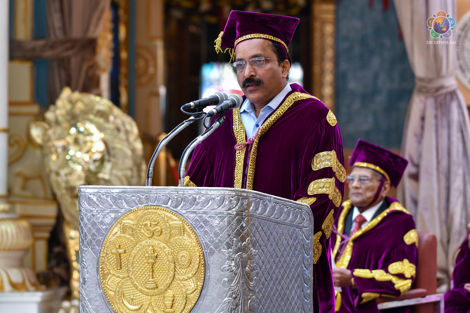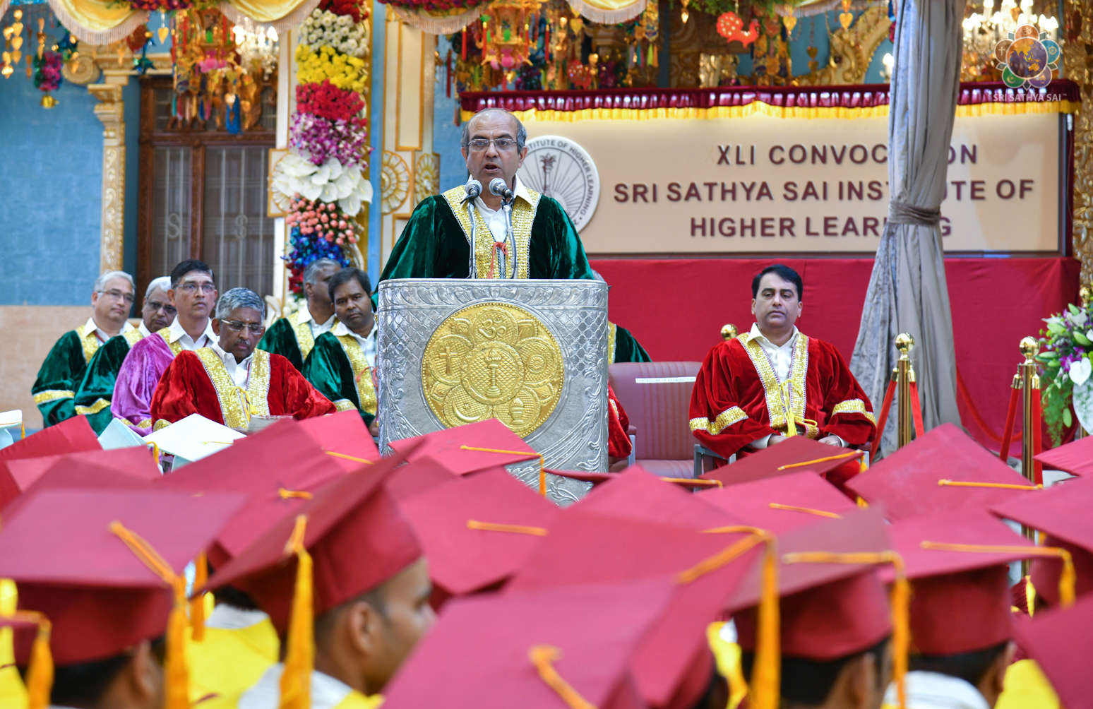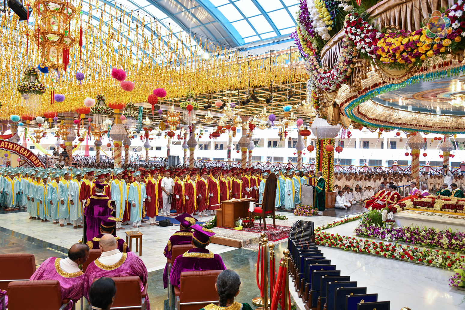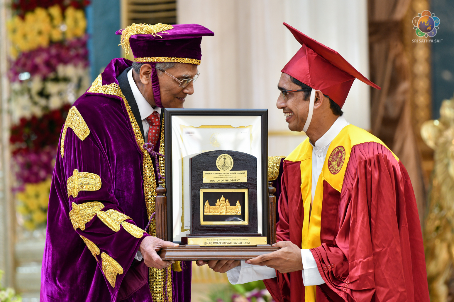Loving Sai Ram and Greetings from Prasanthi Nilayam. The Sri Sathya Sai Institute of Higher Learning conducted its 41st convocation this morning in the Divine Presence of Bhagawan Sri Sathya Sai Baba. Sri Sreedhara Panicker Somanath, Secretary & Chairman, Indian Space Research Organisation was the chief guest this morning. In his address, he lauded SSSIHL as a modern Gurukula & appreciated the residential system of the campuses wherein the teachers stay along with the students. Congratulating the students for the integral education that they have received in the Sri Sathya Sai Institutions, he urged them to be ever passionate about learning and develop a strong moral fibre to serve society and make India the leader among nations. Around 17 Research Scholars were awarded Doctorate of Philosophy this year.