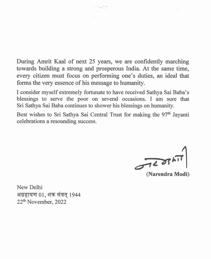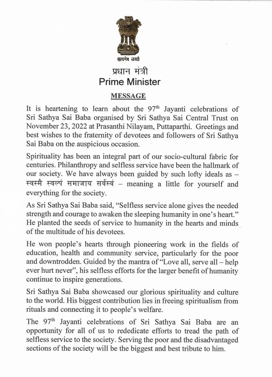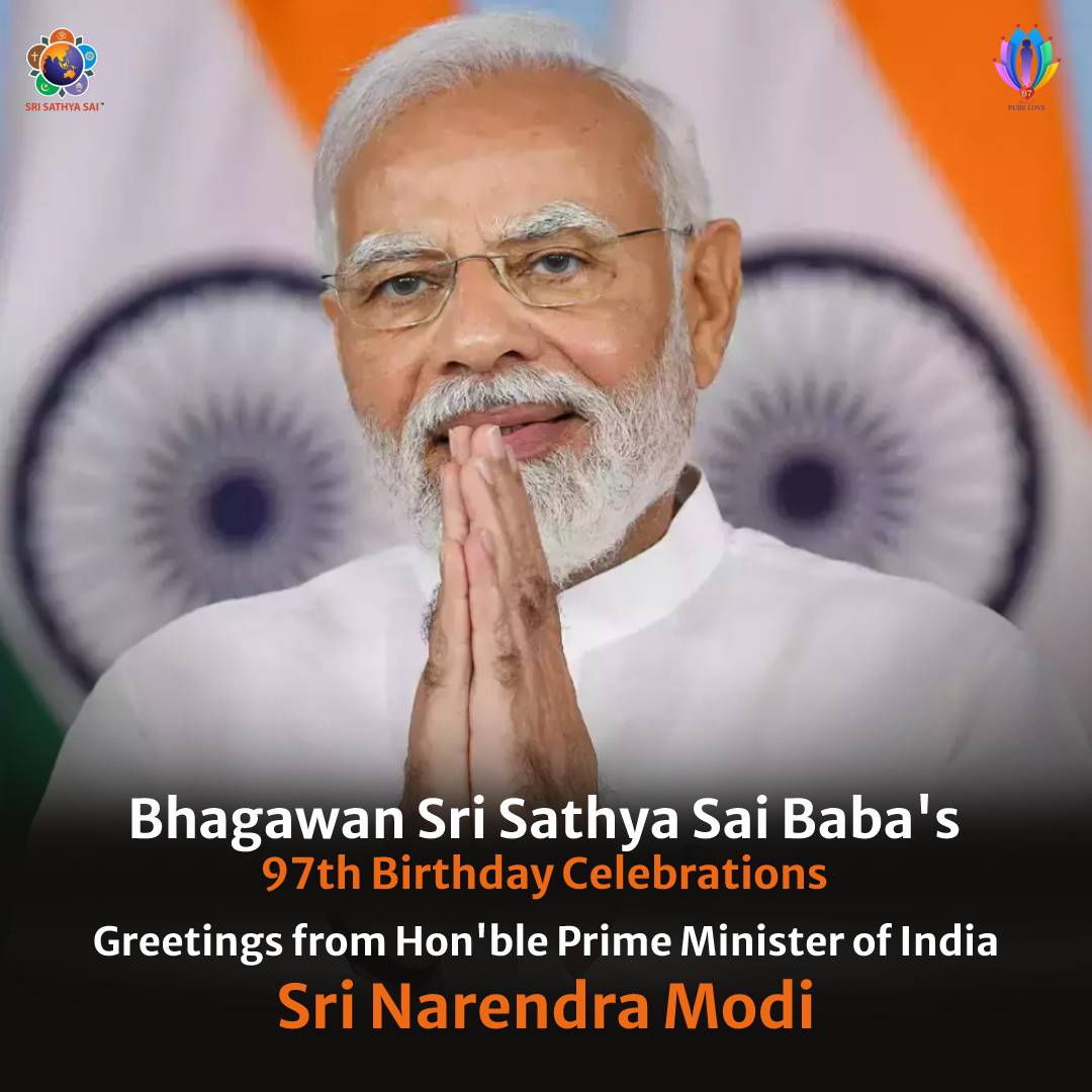 Bhagawan Sri Sathya Sai Baba's 97th Birthday Celebrations | Greetings from Hon'ble Prime Minister of India Sri Narendra Modi On the momentous occasion of our beloved Lord's 97th Jayanthi Celebrations, we are immensely pleased to share with everyone the greetings and wishes of our Hon'ble Prime Minister Sri Narendra Modi. We express our heartfelt thanks to the Prime Minister for joining all of us in celebrating the Divine Advent. Let's together invoke Bhagawan's blessings with the prayer 'Samasta Lokah Sukhino Bhavantu'.