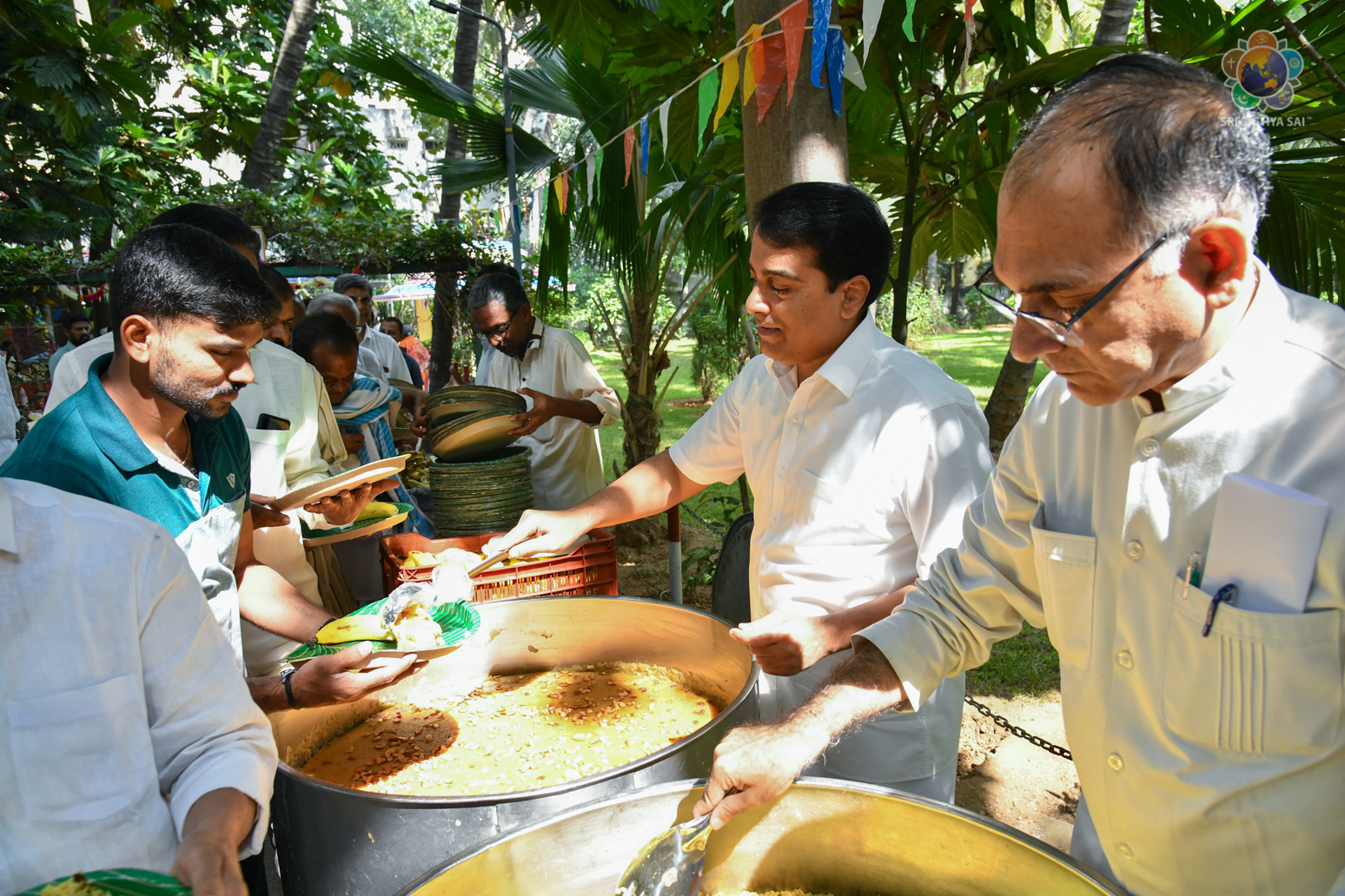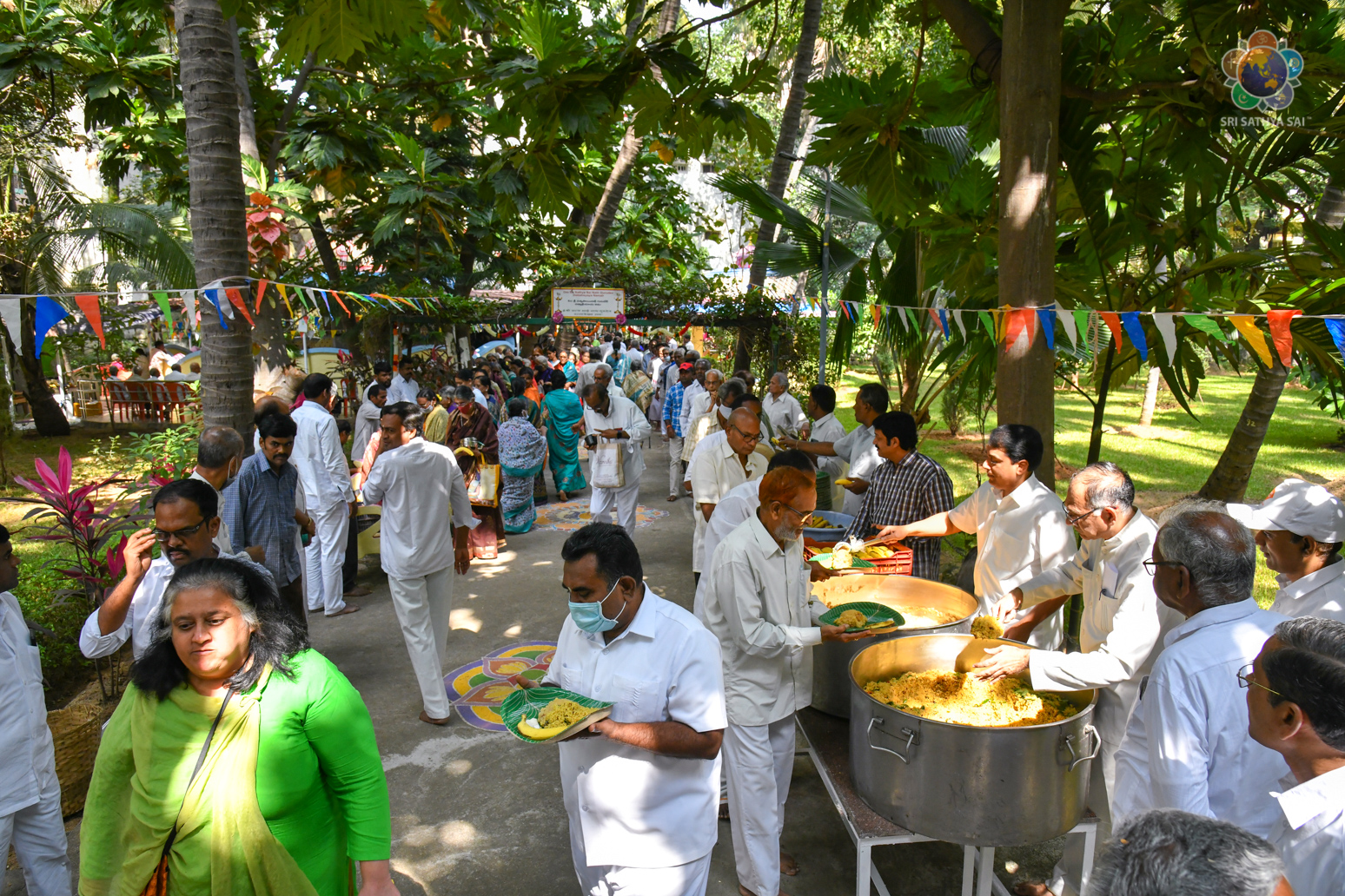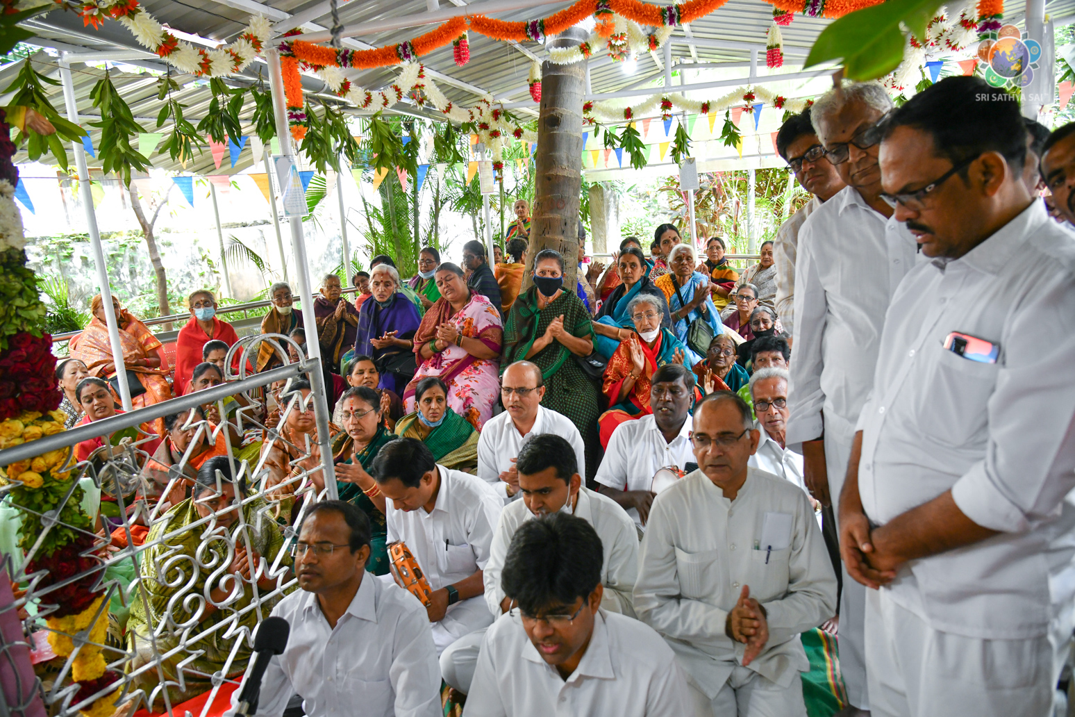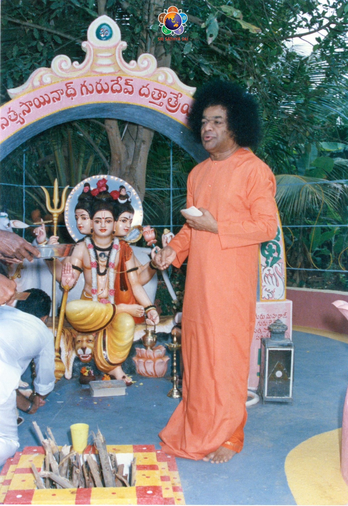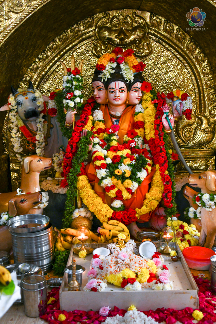 Prasanthi Nilayam celebrated Dattatreya Jayanthi with ritualistic worship and vibrant bhajans at the Dattatreya Shrine located in the sylvan environment of Bhagawan's Parents' Samadhi. Many years ago Bhagawan Himself had physically consecrated this sacred shrine. Lord Dattatreya represents the Divine Trinity of Brahma (Creator), Vishnu (Preserver) and Shiva (Destroyer) in a single enigmatic form. His birth anniversary is observed on the full moon day of the lunar month of Margaseersha every year.