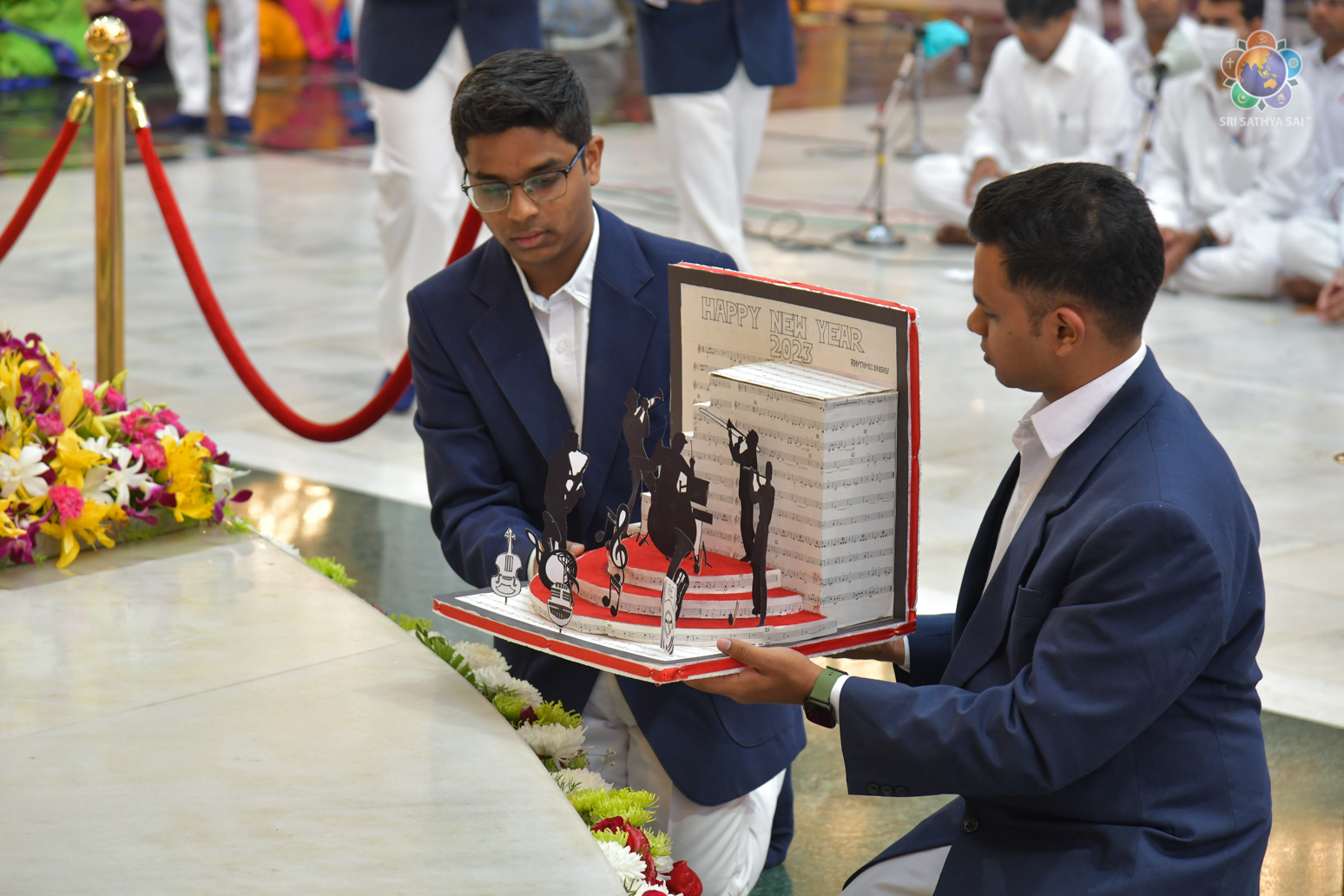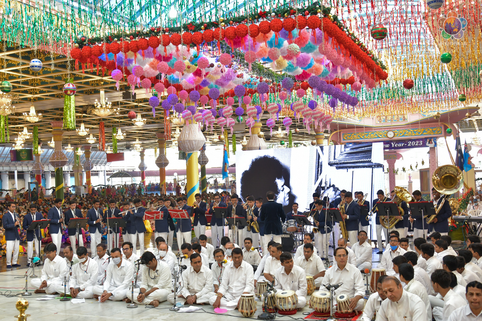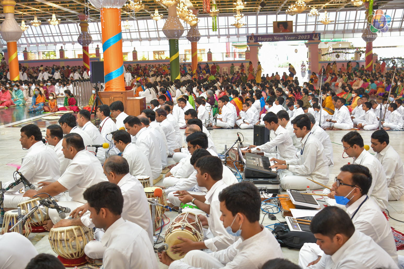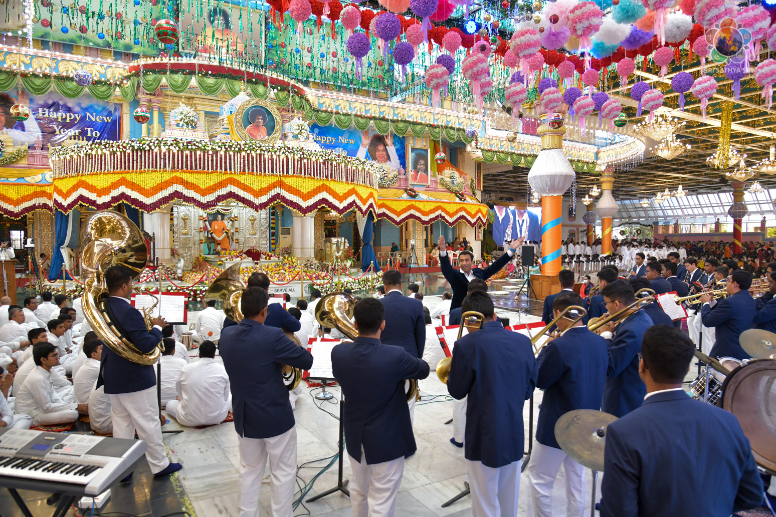 Loving Sai Ram and New Year Greetings from Prasanthi Nilayam. The New Year was ringed in today with music, love, and joyful reminiscences this morning at the Sai Kulwant Hall. The program began with the Institute Brass Band from the Prasanthi Nilayam Campus offering a delightful collection of musical renditions. This was followed by a program by the Prasanthi Bhajan Group where the importance of singing the Divine Name through the day and through one's life's journey was reiterated through a medley of bhajans suitable for different times of the day. As January 1st also marks the Premabandham meet, the reunion of the alumni of Swami's institutions, there was talk by Sr Ravi Bhamidipati, an alumnus who studied at Brindavan between 1978-83. As a grand finale for this morning's program, the logo for the 98th Year of Advent was unveiled this morning and offered at Bhagawan's Sannidhi. We are sharing a few glimpses from the program this morning.