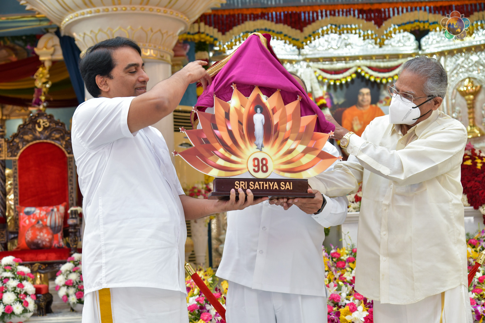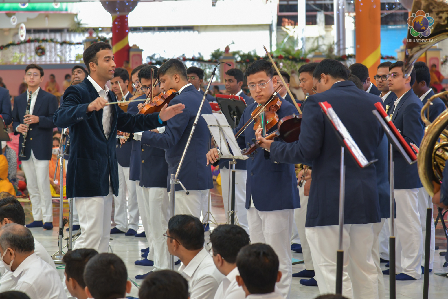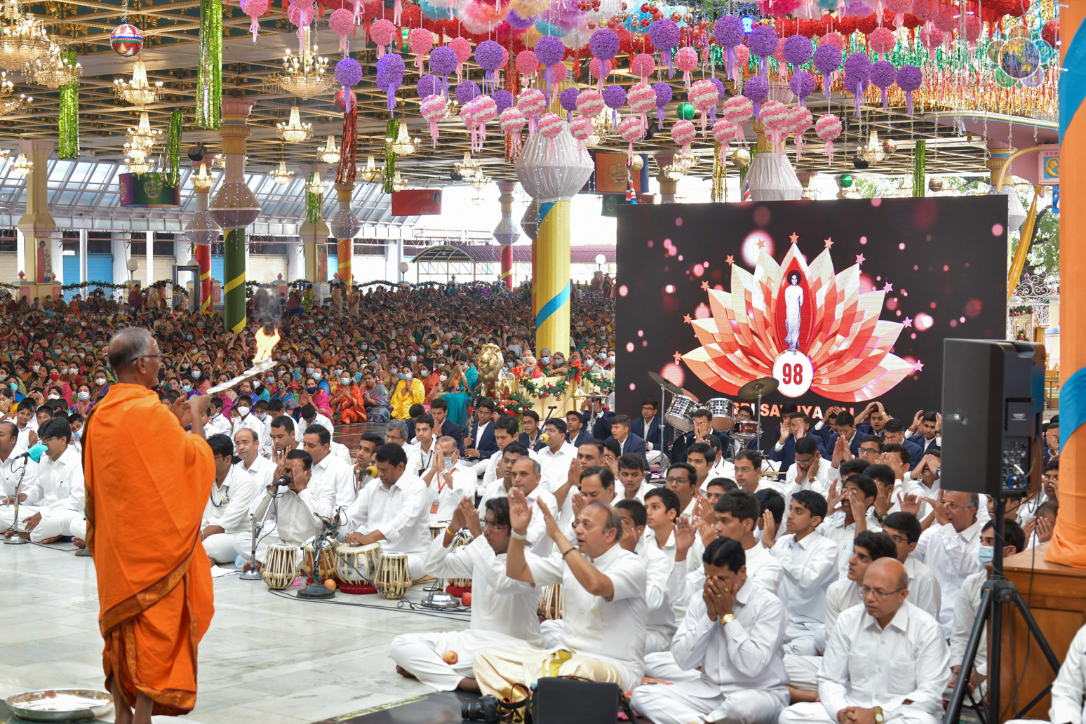 Loving Sai Ram and New Year Greetings from Prasanthi Nilayam. The New Year was ringed in today with music, love, and joyful reminiscences this morning at the Sai Kulwant Hall. The program began with the Institute Brass Band from the Prasanthi Nilayam Campus offering a delightful collection of musical renditions. This was followed by a program by the Prasanthi Bhajan Group where the importance of singing the Divine Name through the day and through one's life's journey was reiterated through a medley of bhajans suitable for different times of the day. As January 1st also marks the Premabandham meet, the reunion of the alumni of Swami's institutions, there was talk by Sr Ravi Bhamidipati, an alumnus who studied at Brindavan between 1978-83. As a grand finale for this morning's program, the logo for the 98th Year of Advent was unveiled this morning and offered at Bhagawan's Sannidhi. We are sharing a few glimpses from the program this morning.