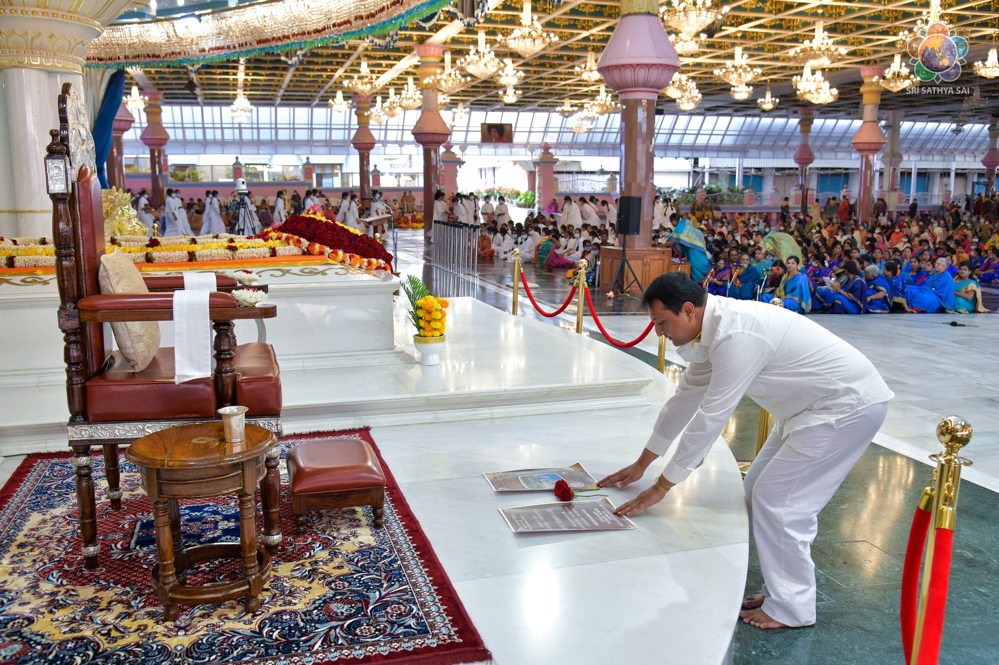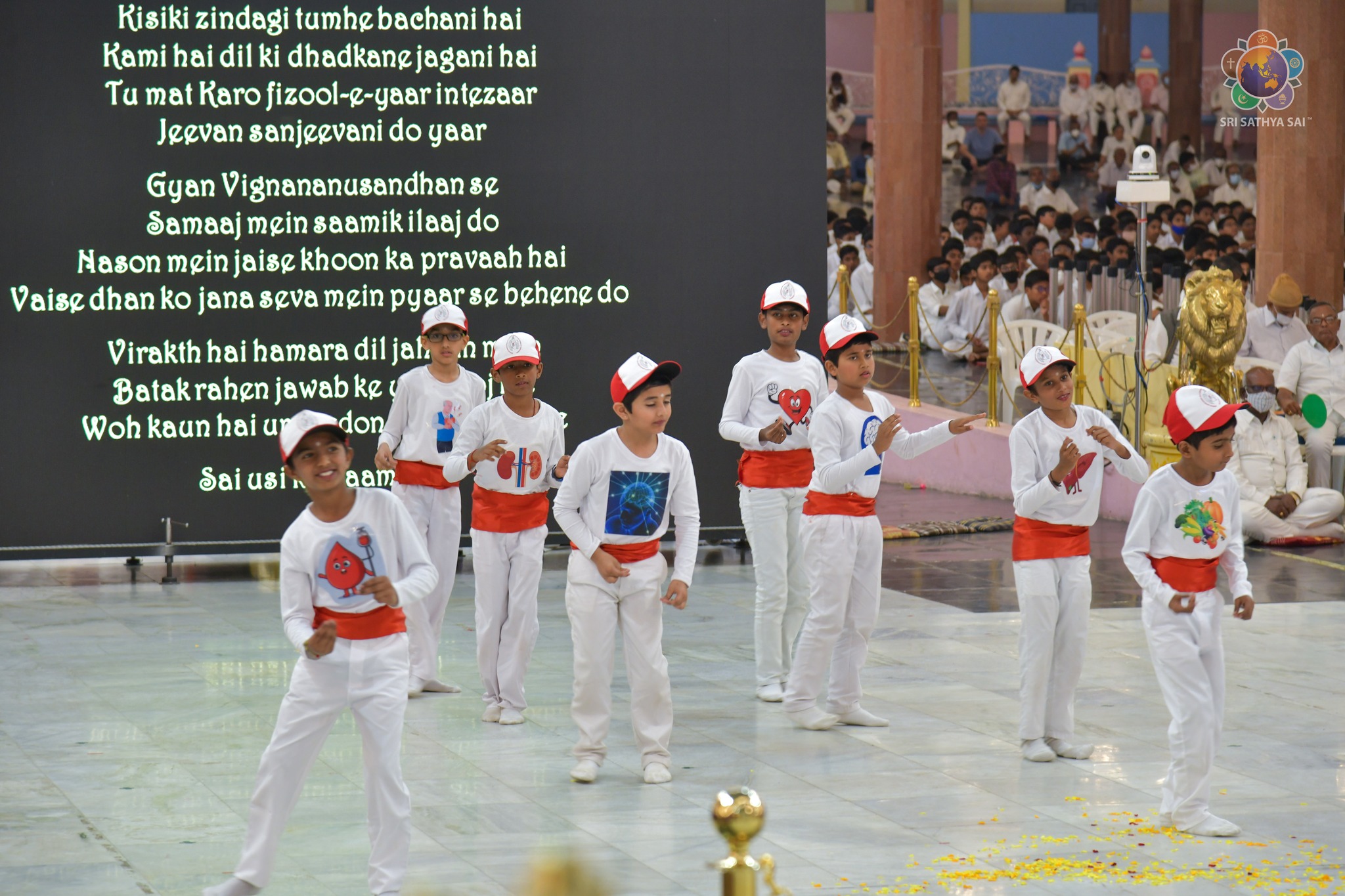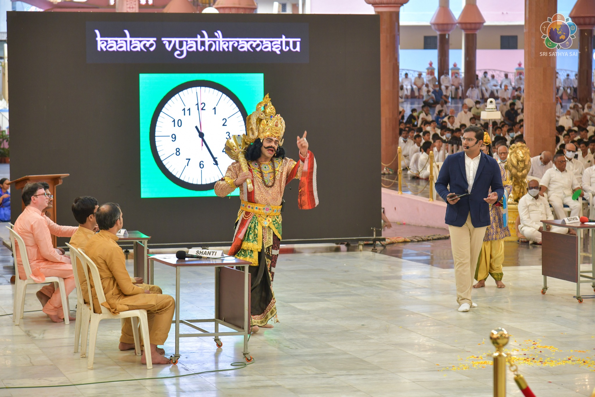 Loving Sai Ram and greetings from Prasanthi Nilayam The evening proceedings began with an invocatory vedam chanting by the staff members (ladies) of Sri Sathya Sai Institute of Higher Medical Sciences, Whitefield, Bengaluru. An annual newsletter titled ‘Mano-Hriday’ was offered to Bhagawan by the revered Trustees of Sri Sathya Sai Central Trust. Dr Sundaresh Dabir (Director, SSSIHMS - WFD) then presented some of the highlights of the hospital’s performance in the year gone by. He mentioned how the commercial value of all the treatments offered at the hospital free of charge with love to all patients in the last 12 months is over 250 crores. After this the students and staff of the hospital offered to Bhagawan a creatively crafted and reinvigorating drama entitled ‘Saiyushman Bhava’. Through the insightful interaction between Lord Yama (The God of Time, Righteousness and Death) and a modern doctor of allopathy serving in Bhagawan’s hospital, the drama interestingly brought out the true principles of Sai Ideal Healthcare which if practiced world over could resurrect the sorry state of the healthcare scenario that we see all around us today. The drama powerfully conveyed how what we need today to revive man and his health is not CPCR (Cardio Pulmonary Cerebral Resuscitation) but Compassion, Purity, Character and Righteousness. Don’t miss watching this truly enlightening drama in our channel Prasanthi Mandir Live.