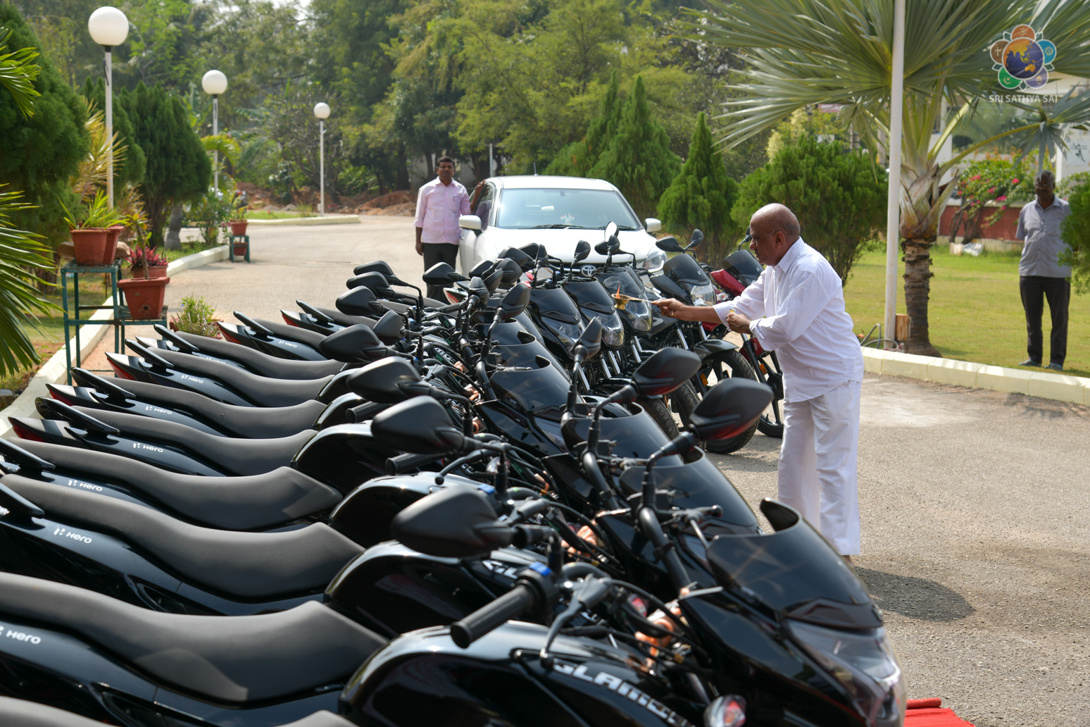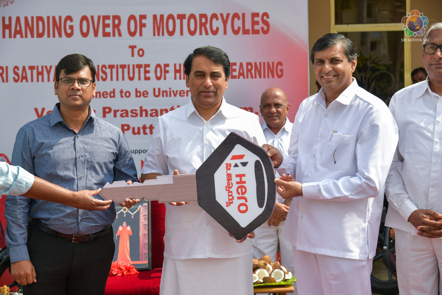 Loving Sai Ram and greetings from Prasanthi Nilayam. With the Divine Blessings of Bhagawan Sri Sathya Sai Baba, 35 Motorcycles were handed over to Sri Sathya Sai Institute of Higher Learning by Hero MotoCorp Limited this morning at the Sri Sathya Sai International Centre for Sports. These motorbikes are being offered as part of their Corporate Social Responsibility program. Marketing Manager of Hero MotoCorp. Limited, Sri Tyagarajan ceremonially handed over the keys to Sri RJ Rathnakar (Managing Trustee, SSSCT) in the presence of Prof B Sai Giridhar (Interim Vice Chancellor, SSSIHL), Prof Pallav Kumar Baruah (Registrar, SSSIHL), Sri Sanjay Sahani (Controller, SSSIHL) and Dr Raghavendra Raju (Director, SSSIHL, PSN campus). As part of the Annual Sports and Cultural Meet on January 11 every year the students display adventure-filled extravaganza presentations. One such offering includes demonstrations of skilful riding, manoeuvring obstacles, and dare devil stunts on motorbikes trained by coaches from the Indian Defence Forces. This is to showcase the educational training in the Institution which helps the students to develop a strong mind and body along with a focussed intellect and a caring heart. The Sri Sathya Sai Central Trust offers its gratitude to Bhagawan for His eternal support through His chosen instruments.