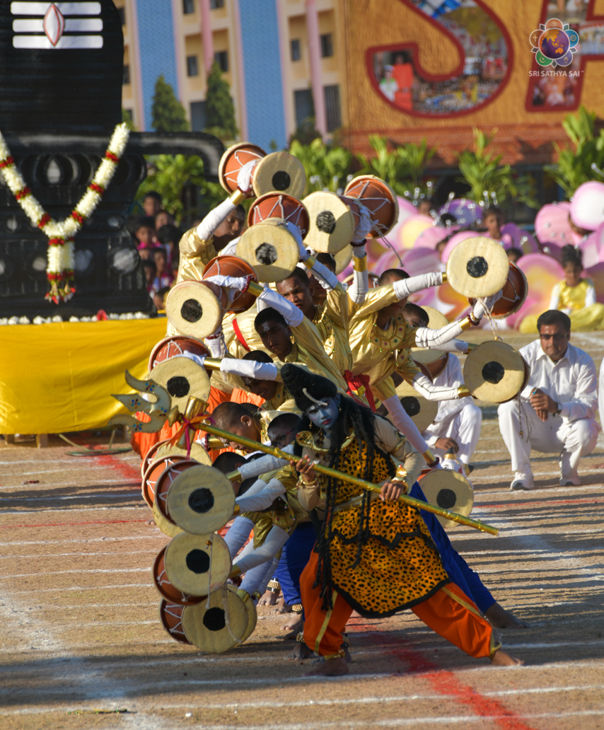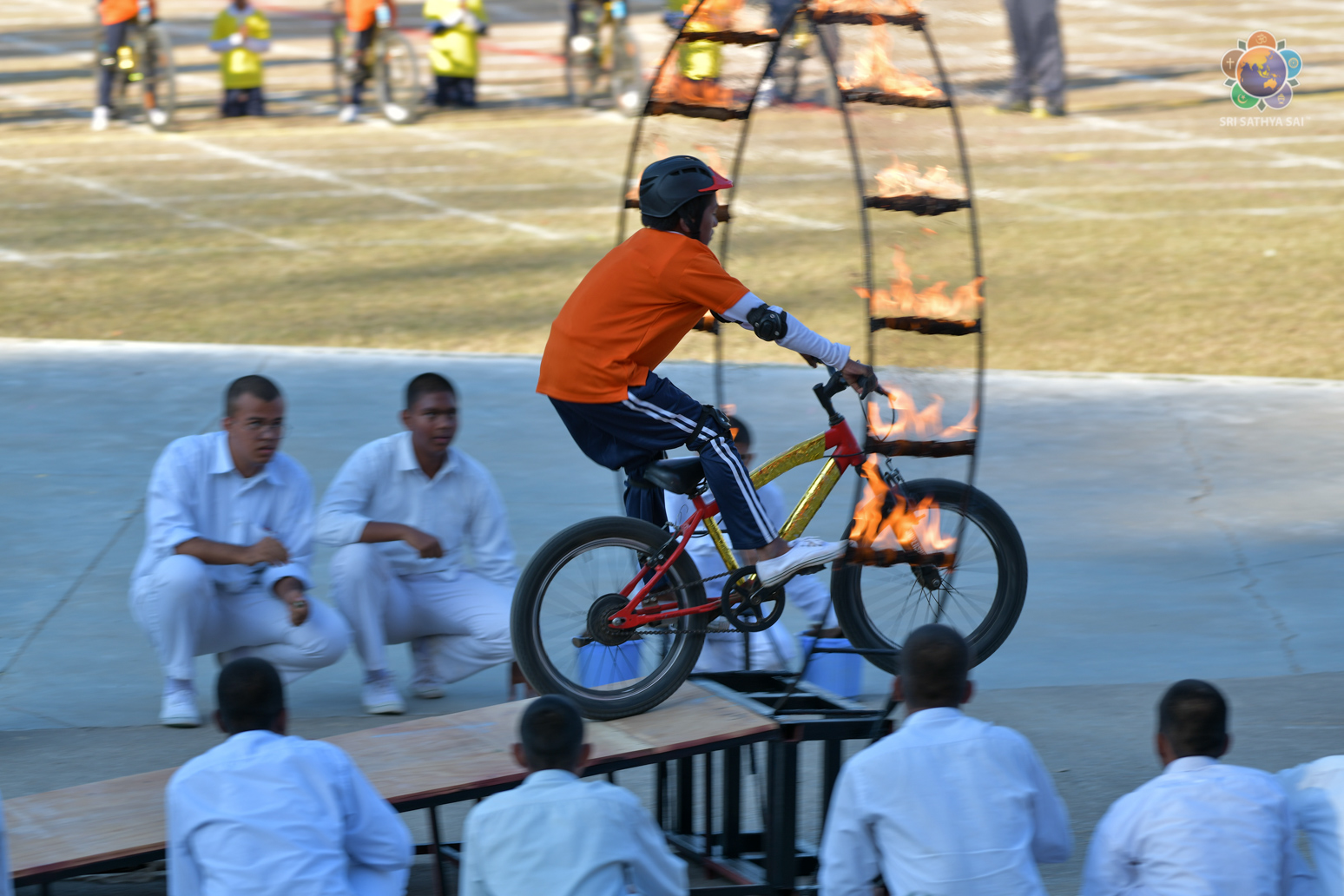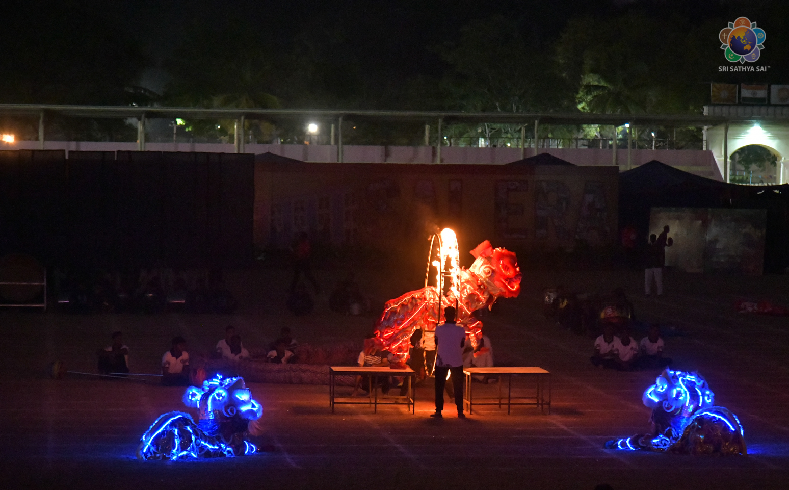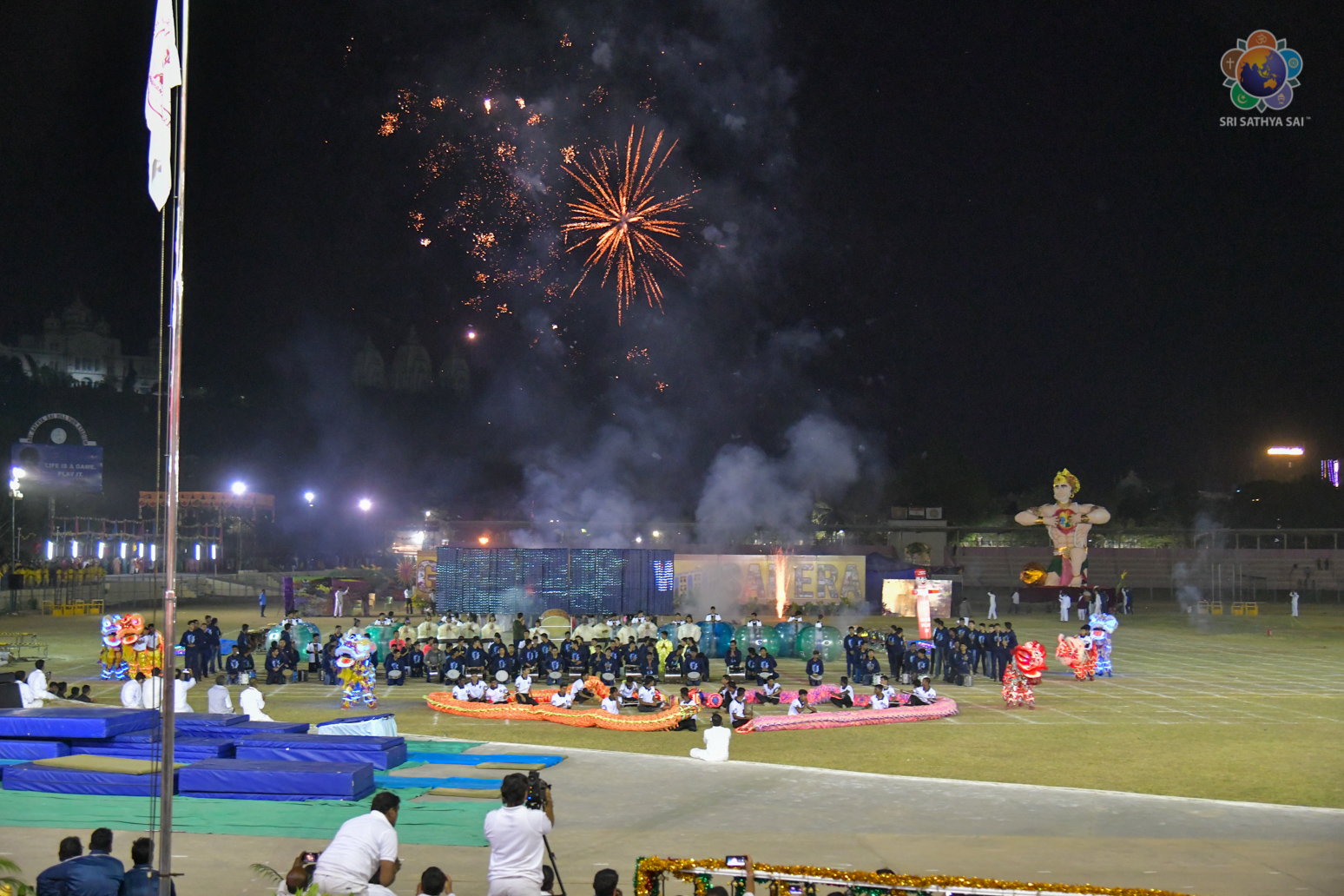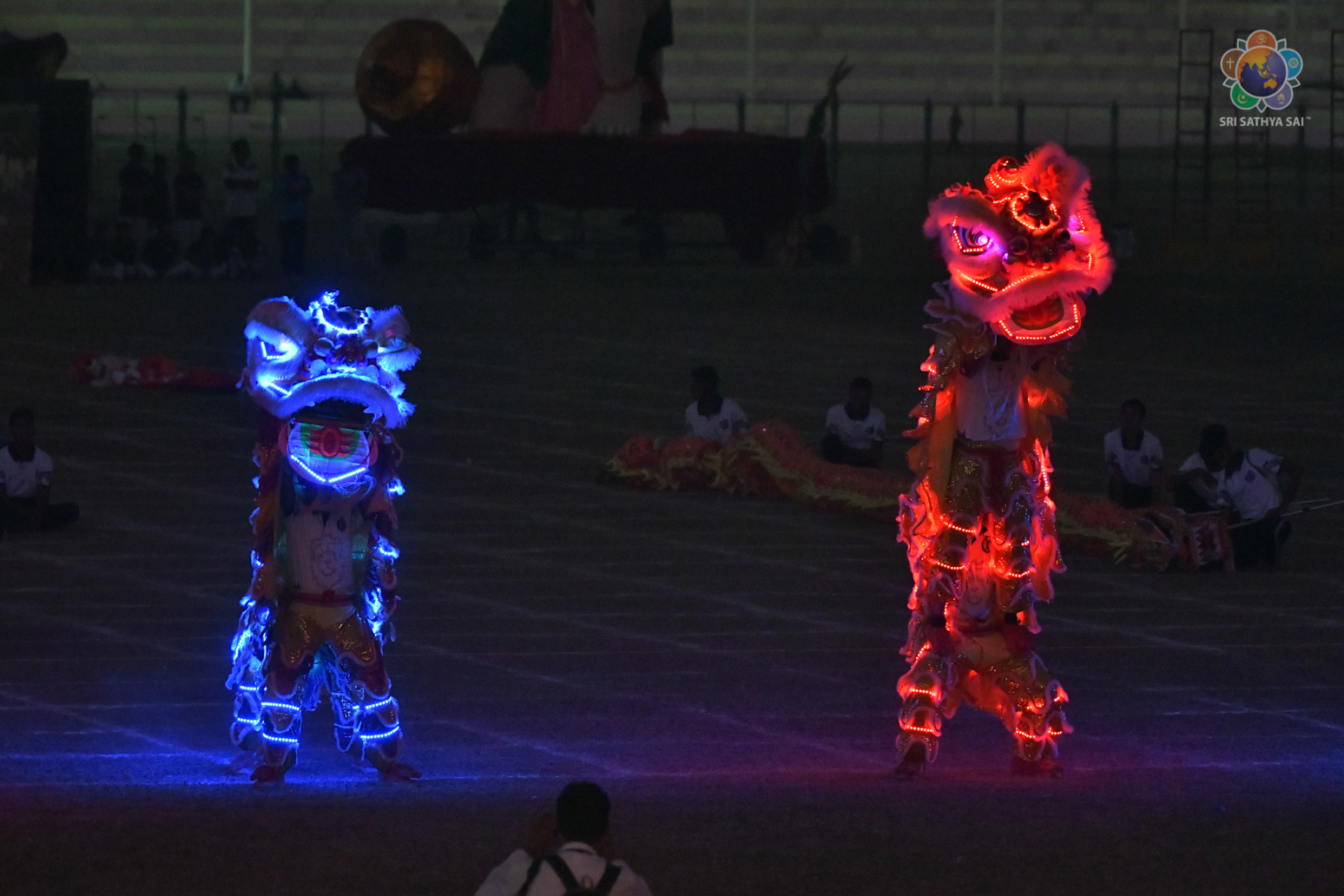 The evening proceedings of this year's Annual Sports and Cultural Meet were as colourful, and heartening as the morning's. Swami was welcomed to the stadium in a procession led by the Brindavan brass band. The proceedings began with a presentation by the children from the Easwaramma School. Energetic dances, stunts on bicycles, skipping routines and so on were part of the presentation by the school that just celebrated the Golden Jubilee. This was followed by the offerings from the Primary School which were laced with melodious music, colourful costumes and graceful gymnastics. The Nursing College students who followed, presented a Yogasanas drill and a graceful dance of Rasaleela. The final offering of the day was made by the Brindavan Campus, and in the backdrop of the fading daylight, they lit the ground with their glowing Lions and Dragons. A unique percussion ensemble followed, which was synchronised with pulsating lights. The Annual Sports and Cultural meet came to a glittering end with fireworks lighting up the skies in the Hill View stadium.