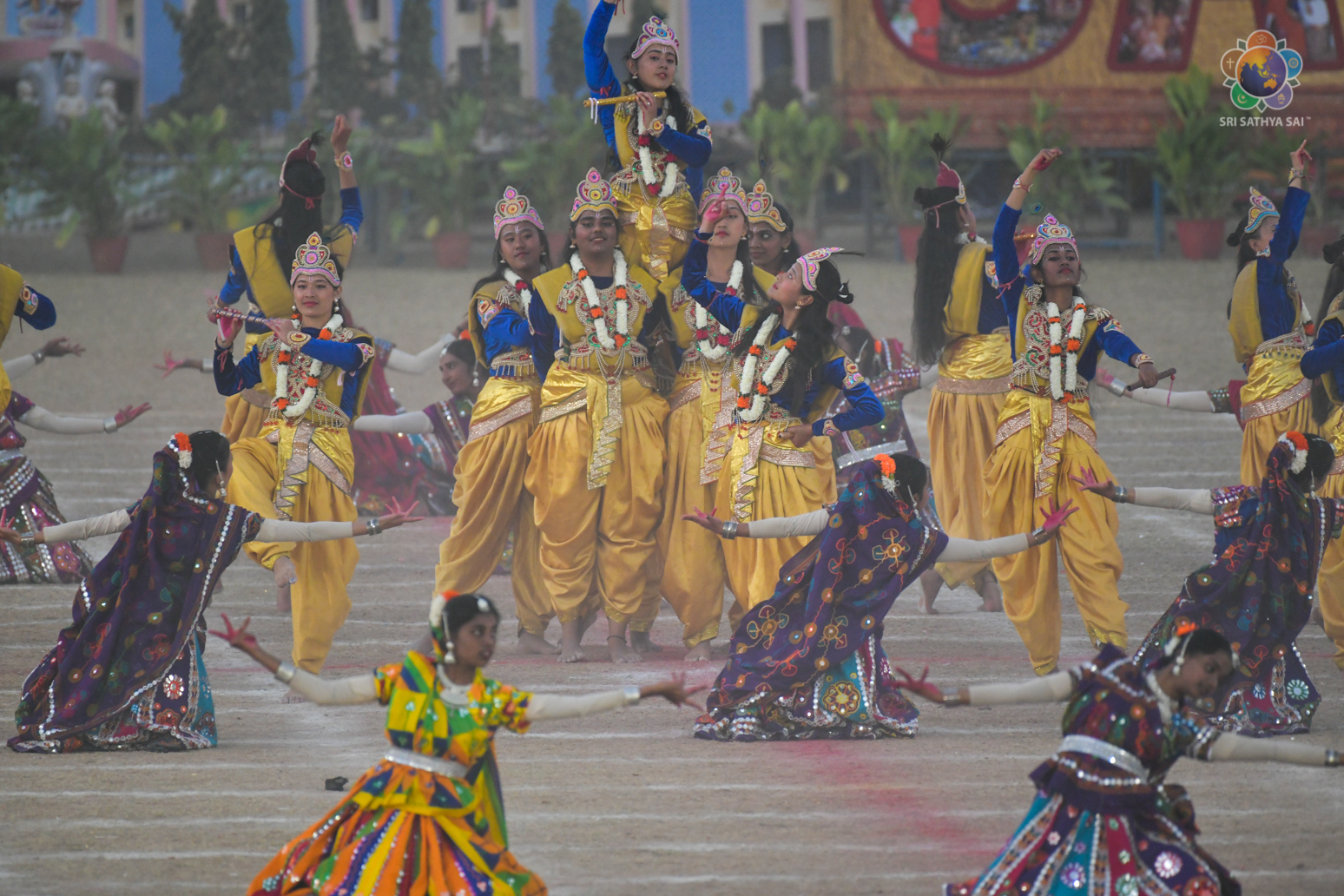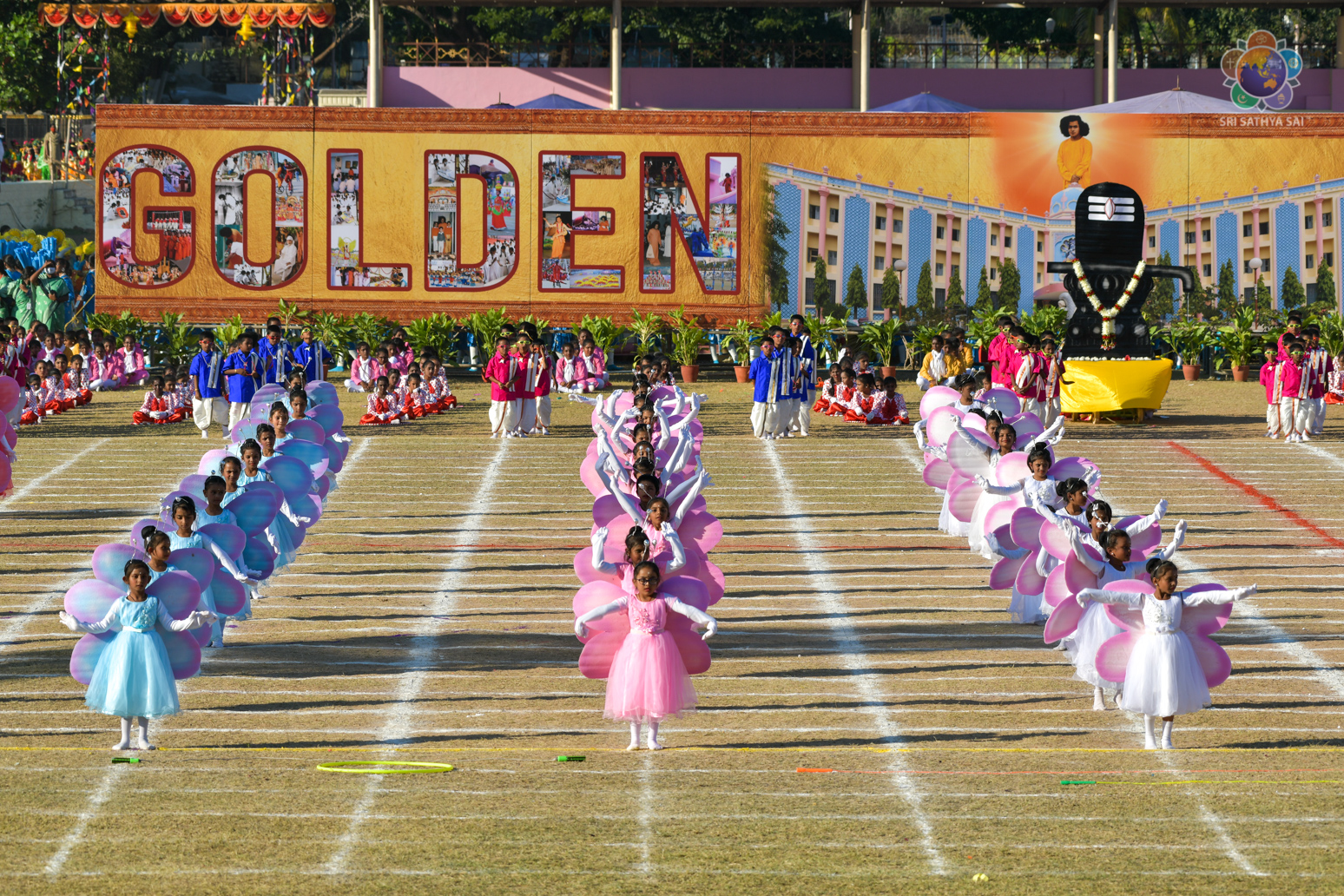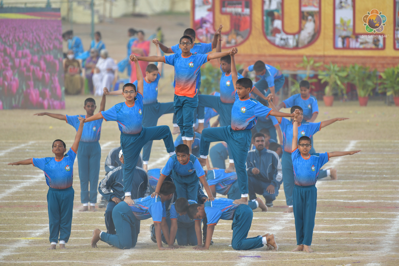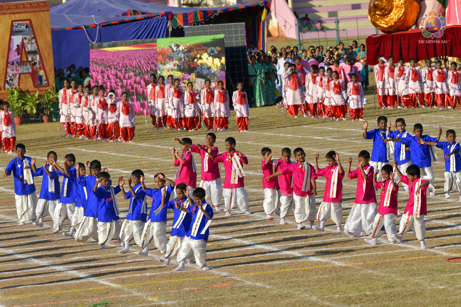 The evening proceedings of this year's Annual Sports and Cultural Meet were as colourful, and heartening as the morning's. Swami was welcomed to the stadium in a procession led by the Brindavan brass band. The proceedings began with a presentation by the children from the Easwaramma School. Energetic dances, stunts on bicycles, skipping routines and so on were part of the presentation by the school that just celebrated the Golden Jubilee. This was followed by the offerings from the Primary School which were laced with melodious music, colourful costumes and graceful gymnastics. The Nursing College students who followed, presented a Yogasanas drill and a graceful dance of Rasaleela. The final offering of the day was made by the Brindavan Campus, and in the backdrop of the fading daylight, they lit the ground with their glowing Lions and Dragons. A unique percussion ensemble followed, which was synchronised with pulsating lights. The Annual Sports and Cultural meet came to a glittering end with fireworks lighting up the skies in the Hill View stadium.