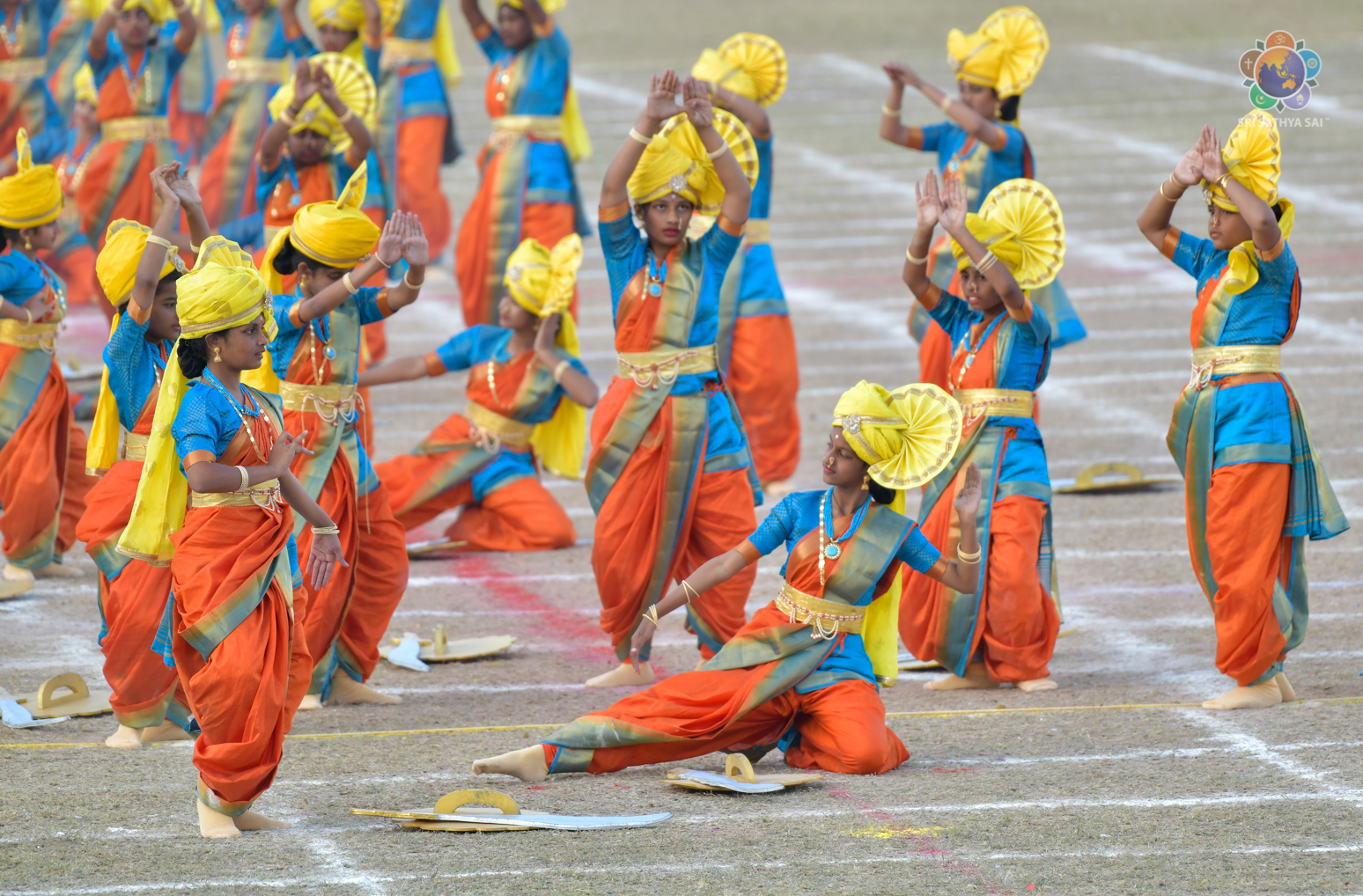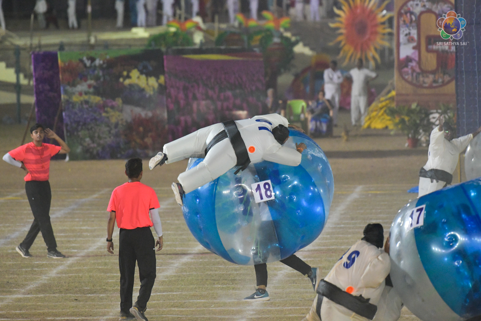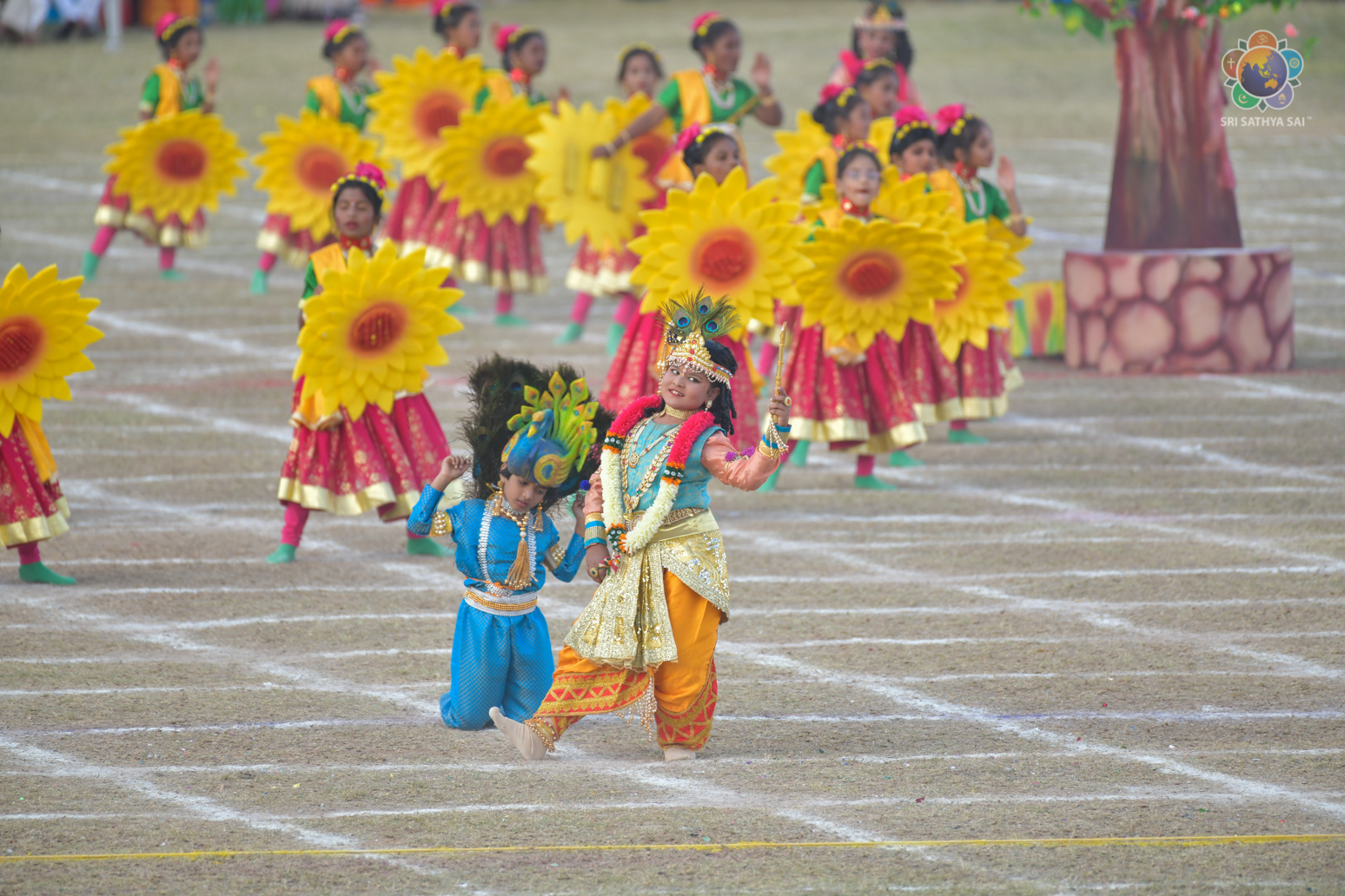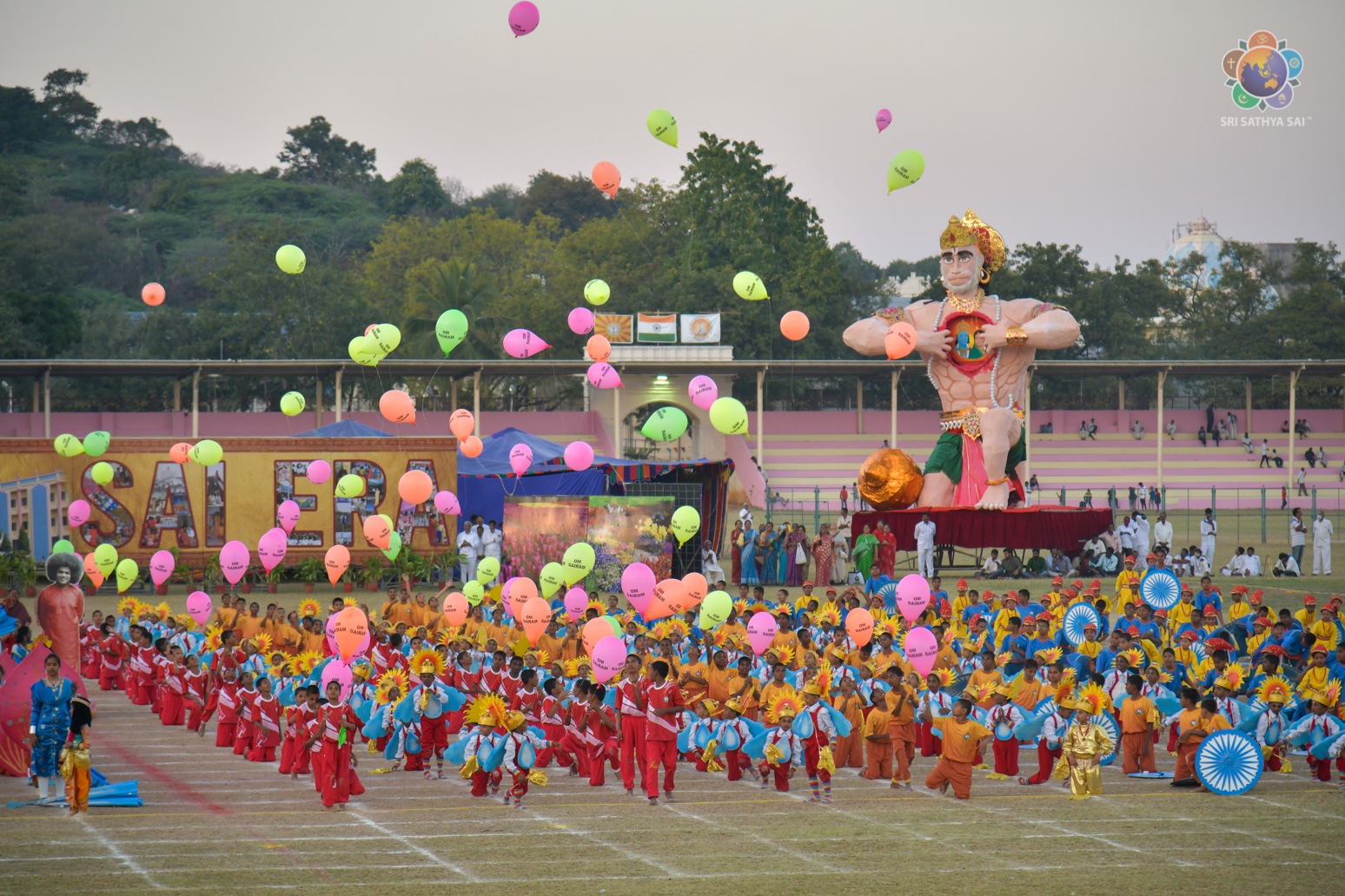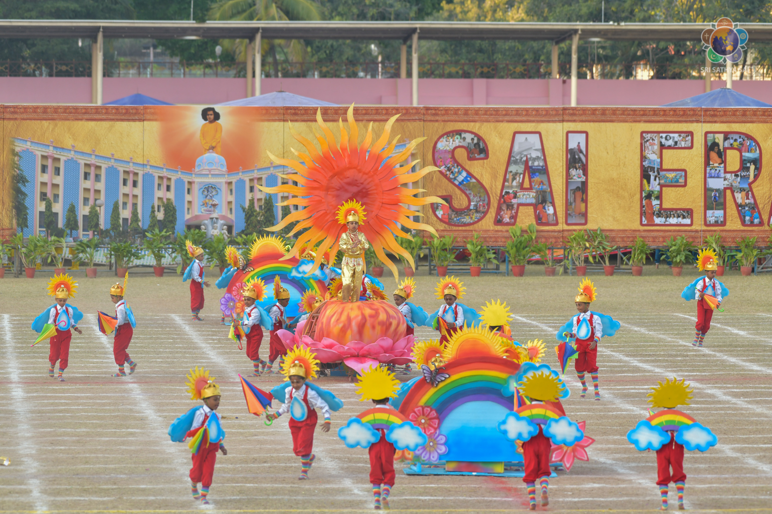The evening proceedings of this year's Annual Sports and Cultural Meet were as colourful, and heartening as the morning's. Swami was welcomed to the stadium in a procession led by the Brindavan brass band. The proceedings began with a presentation by the children from the Easwaramma School. Energetic dances, stunts on bicycles, skipping routines and so on were part of the presentation by the school that just celebrated the Golden Jubilee. This was followed by the offerings from the Primary School which were laced with melodious music, colourful costumes and graceful gymnastics. The Nursing College students who followed, presented a Yogasanas drill and a graceful dance of Rasaleela. The final offering of the day was made by the Brindavan Campus, and in the backdrop of the fading daylight, they lit the ground with their glowing Lions and Dragons. A unique percussion ensemble followed, which was synchronised with pulsating lights. The Annual Sports and Cultural meet came to a glittering end with fireworks lighting up the skies in the Hill View stadium.
