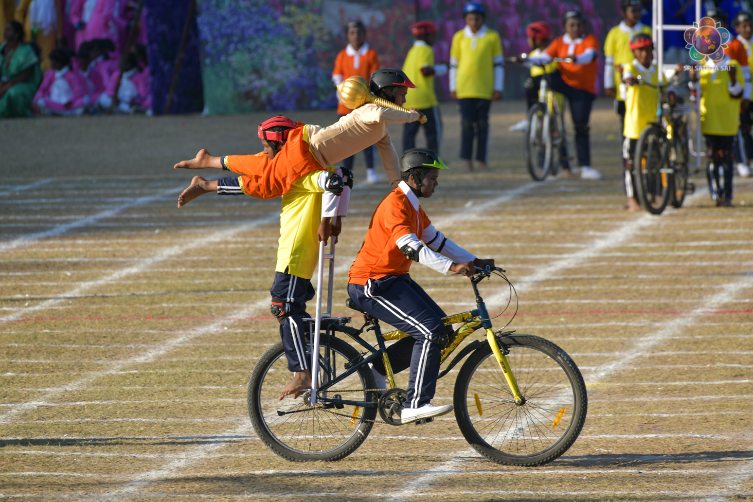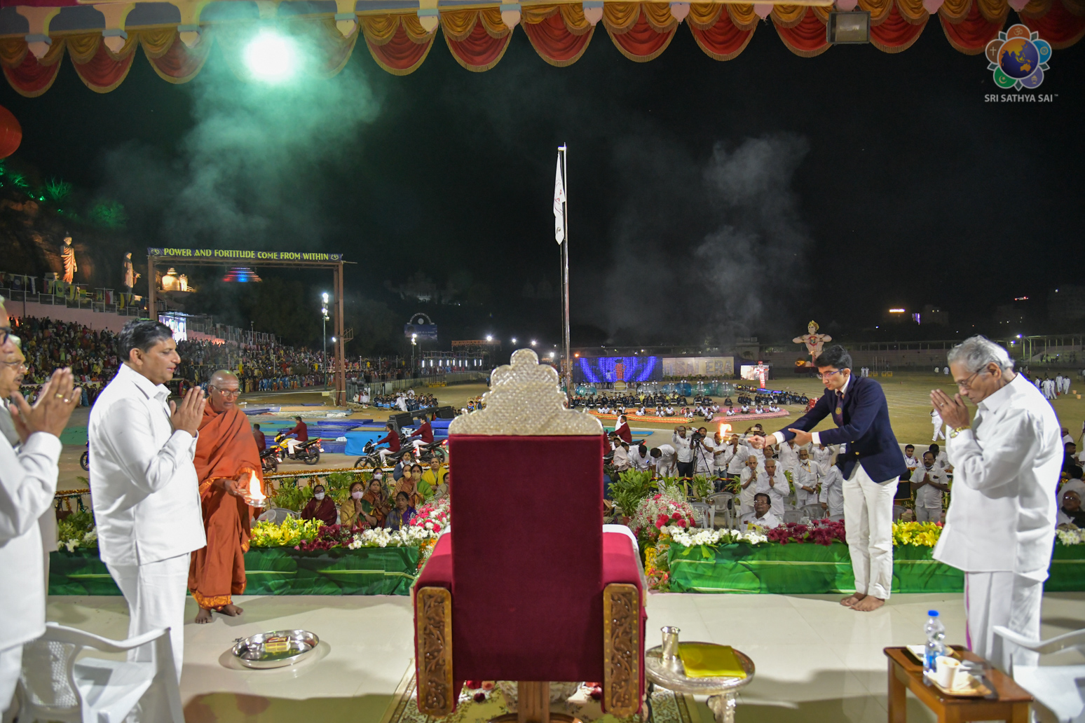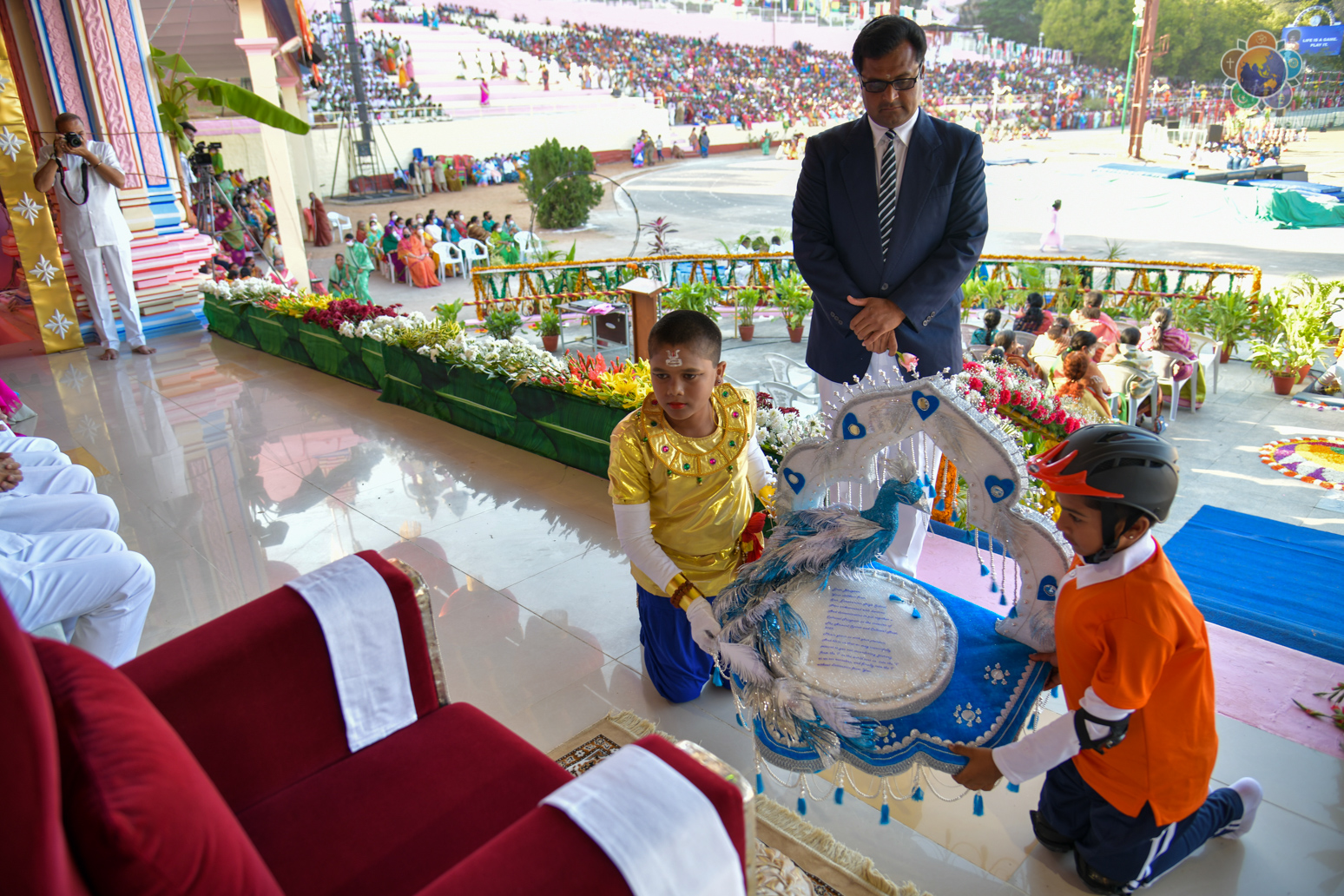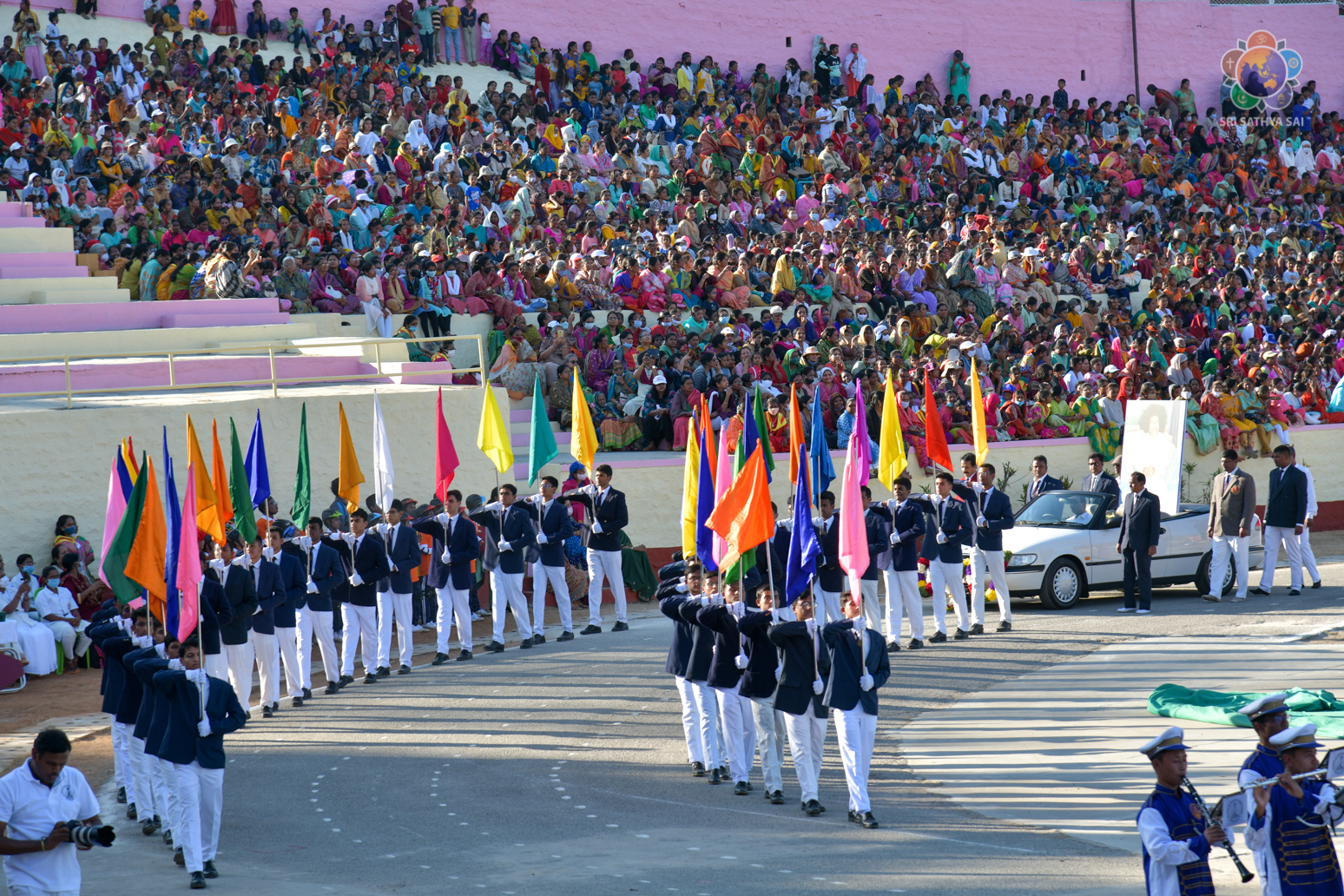 The evening proceedings of this year's Annual Sports and Cultural Meet were as colourful, and heartening as the morning's. Swami was welcomed to the stadium in a procession led by the Brindavan brass band. The proceedings began with a presentation by the children from the Easwaramma School. Energetic dances, stunts on bicycles, skipping routines and so on were part of the presentation by the school that just celebrated the Golden Jubilee. This was followed by the offerings from the Primary School which were laced with melodious music, colourful costumes and graceful gymnastics. The Nursing College students who followed, presented a Yogasanas drill and a graceful dance of Rasaleela. The final offering of the day was made by the Brindavan Campus, and in the backdrop of the fading daylight, they lit the ground with their glowing Lions and Dragons. A unique percussion ensemble followed, which was synchronised with pulsating lights. The Annual Sports and Cultural meet came to a glittering end with fireworks lighting up the skies in the Hill View stadium.