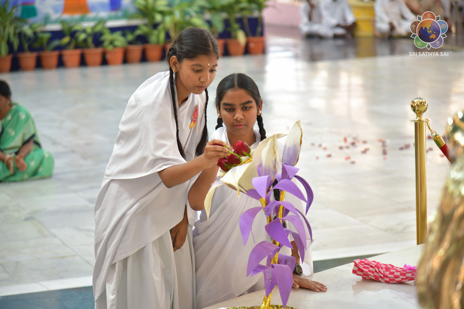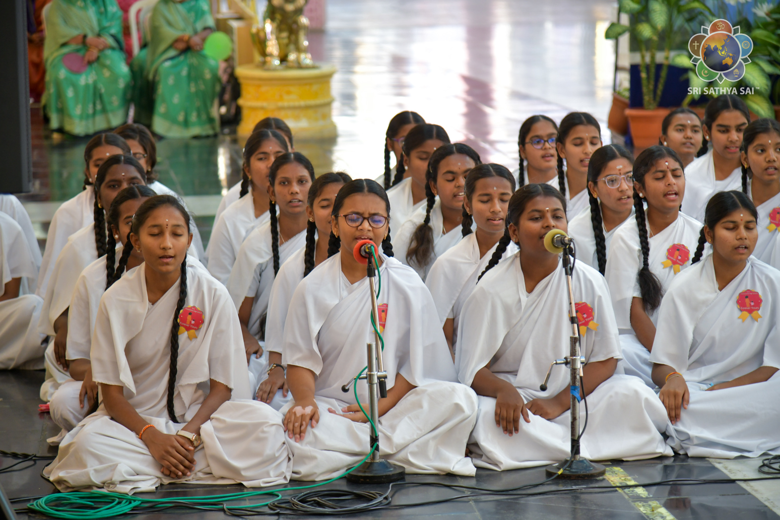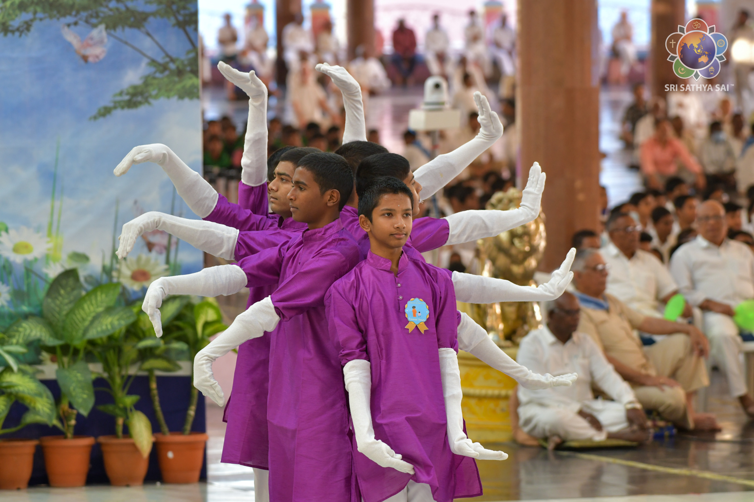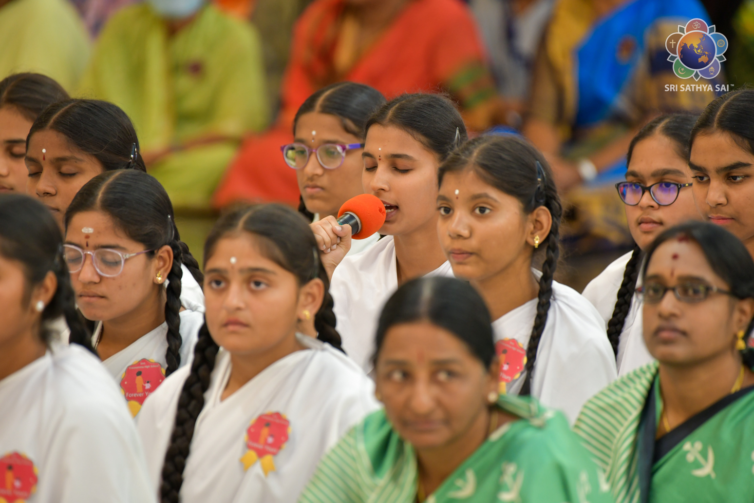 Loving Sai Ram and Greetings from Prasanthi Nilayam The 10th class students from Smt Eswaramma High School offered their collective gratitude to Bhagawan in the form of a Devotional Music Program interspersed with skit, dance and short speeches.