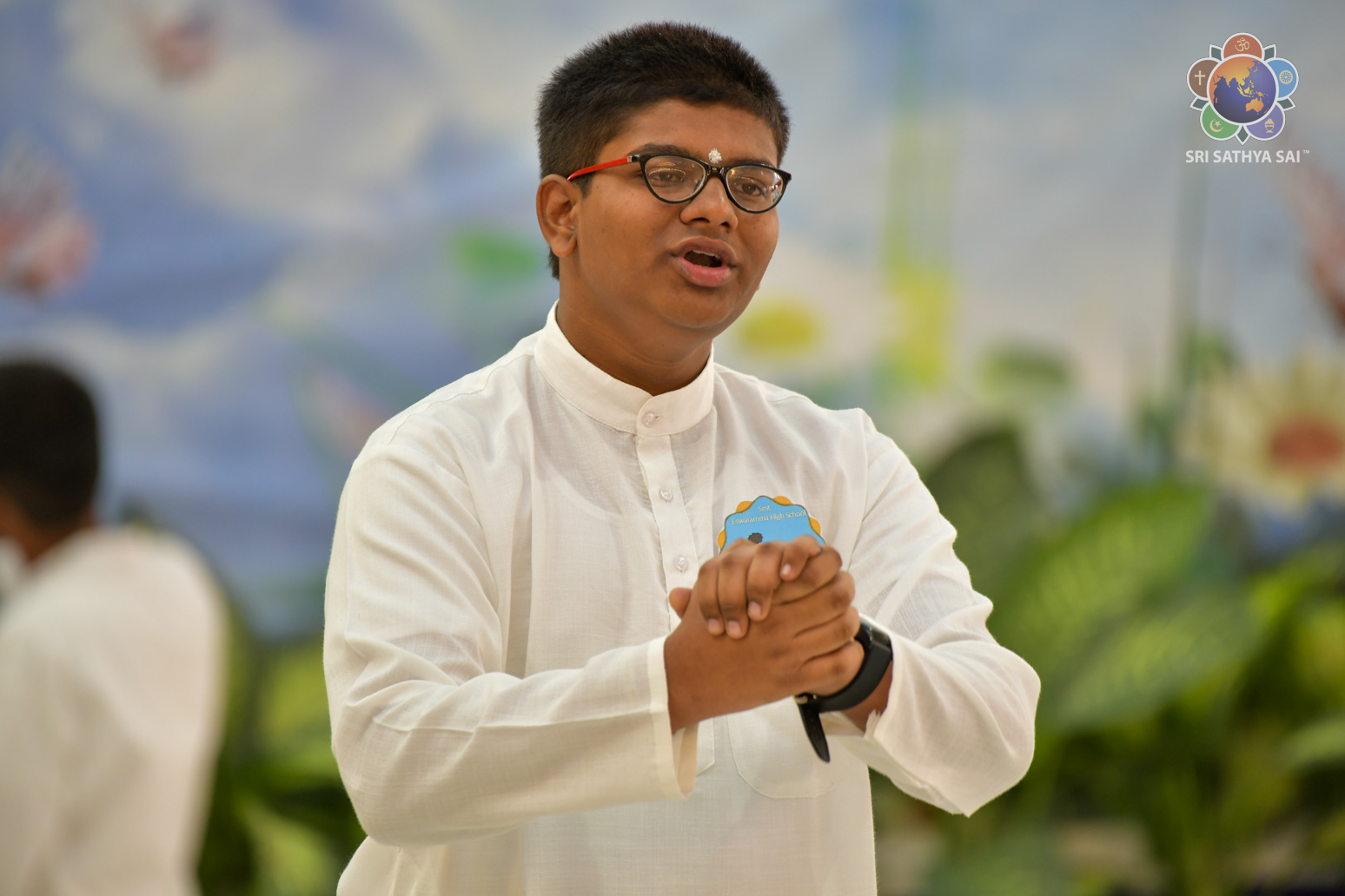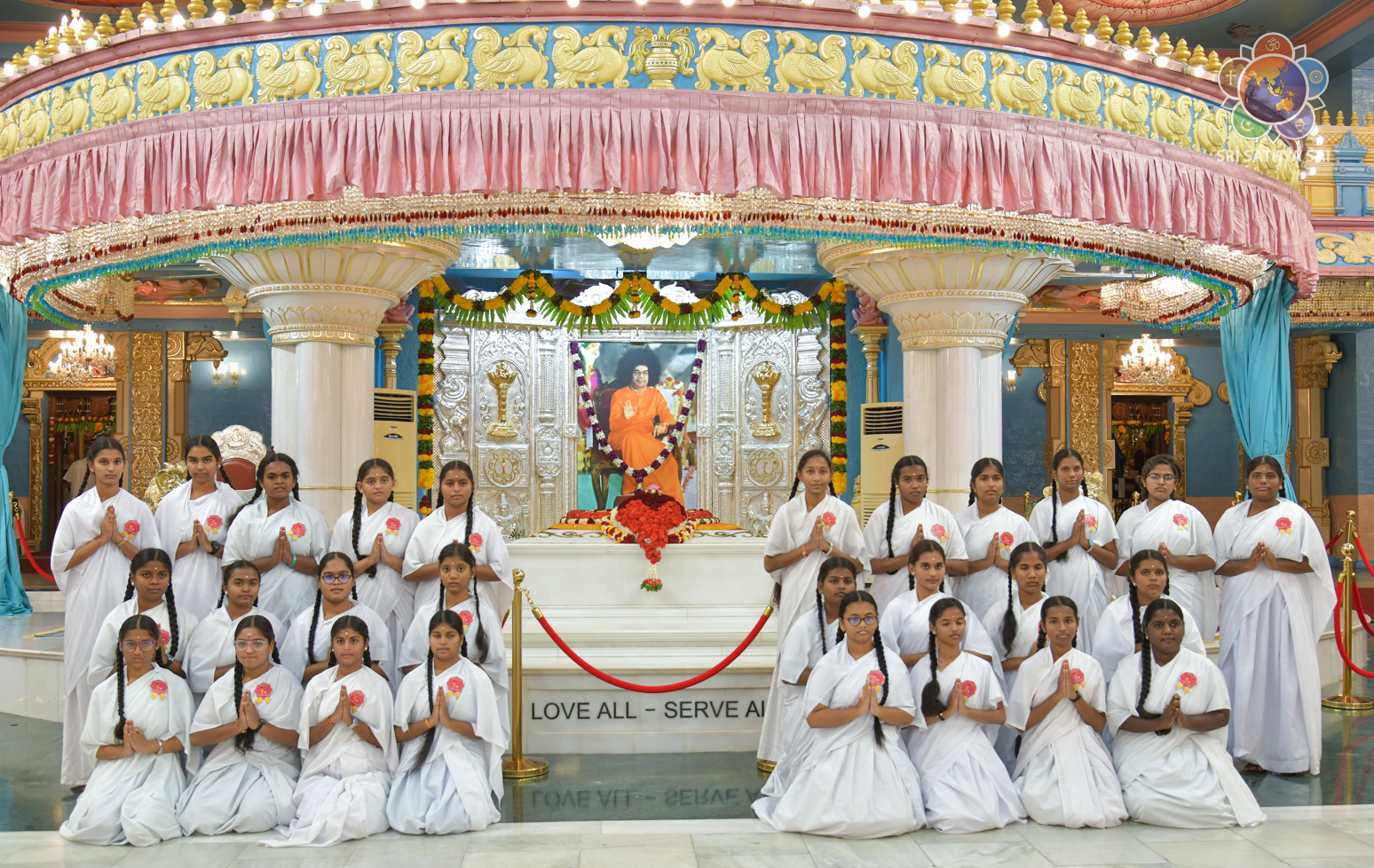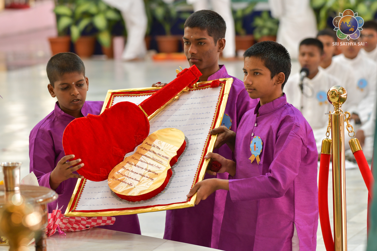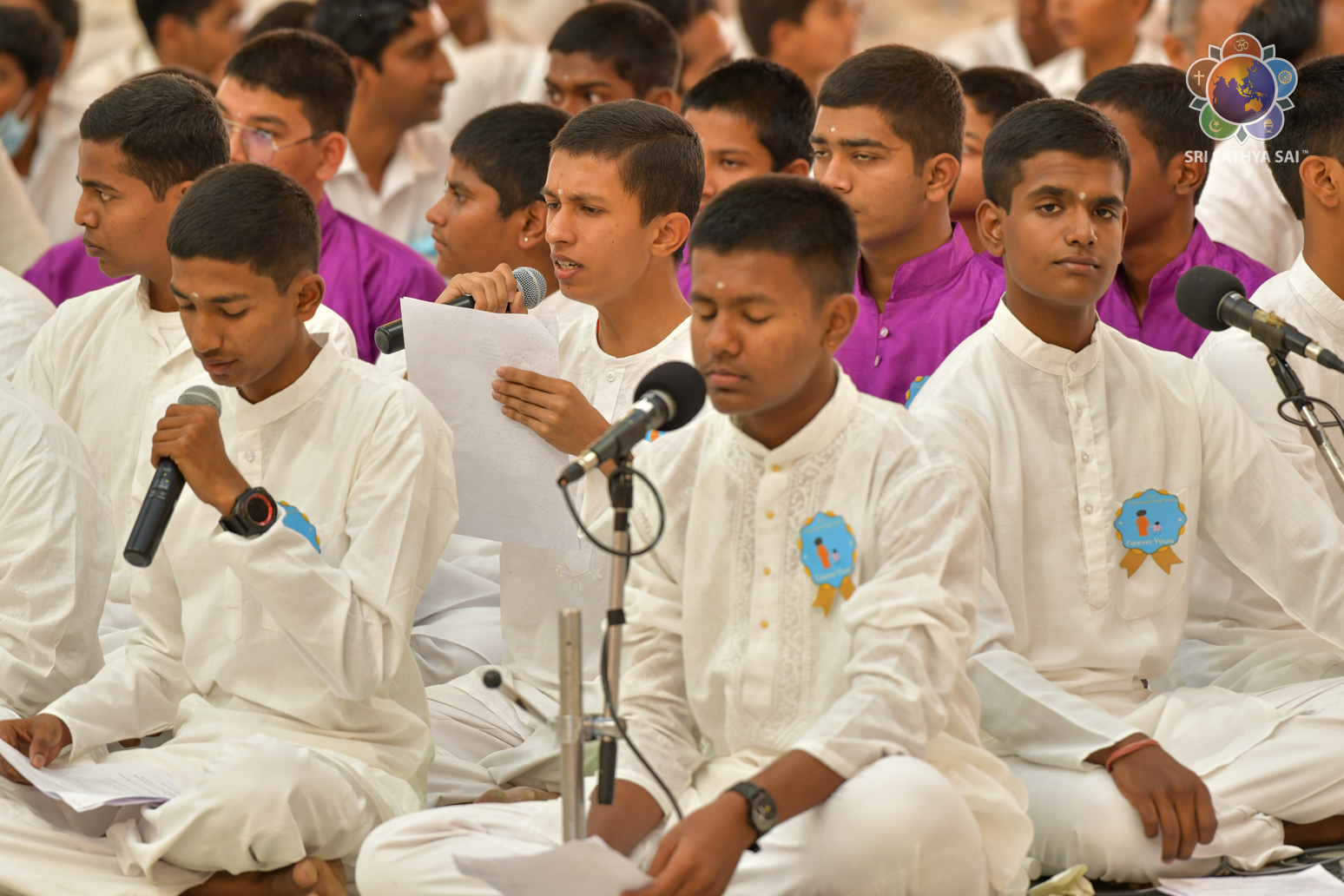 Loving Sai Ram and Greetings from Prasanthi Nilayam The 10th class students from Smt Eswaramma High School offered their collective gratitude to Bhagawan in the form of a Devotional Music Program interspersed with skit, dance and short speeches.