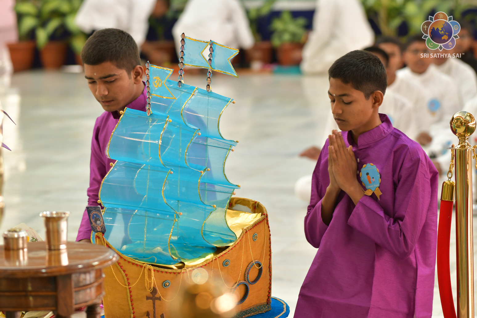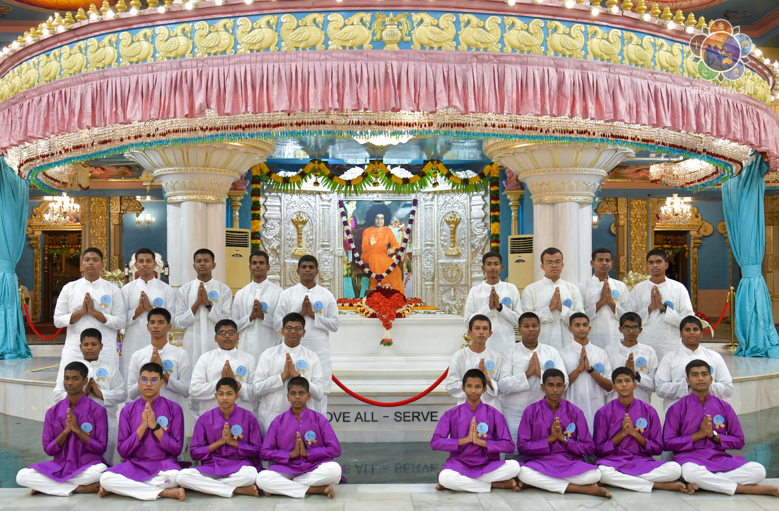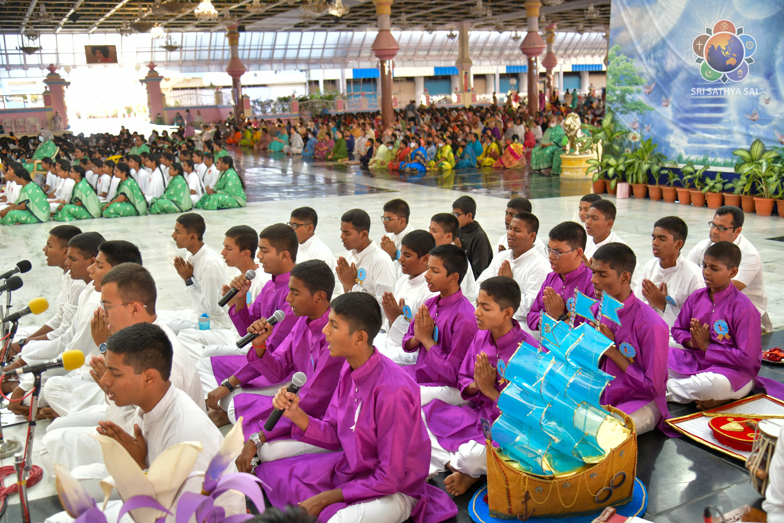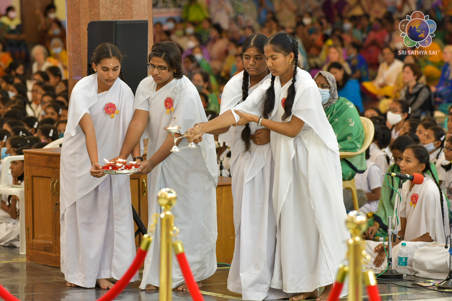 Loving Sai Ram and Greetings from Prasanthi Nilayam The 10th class students from Smt Eswaramma High School offered their collective gratitude to Bhagawan in the form of a Devotional Music Program interspersed with skit, dance and short speeches.