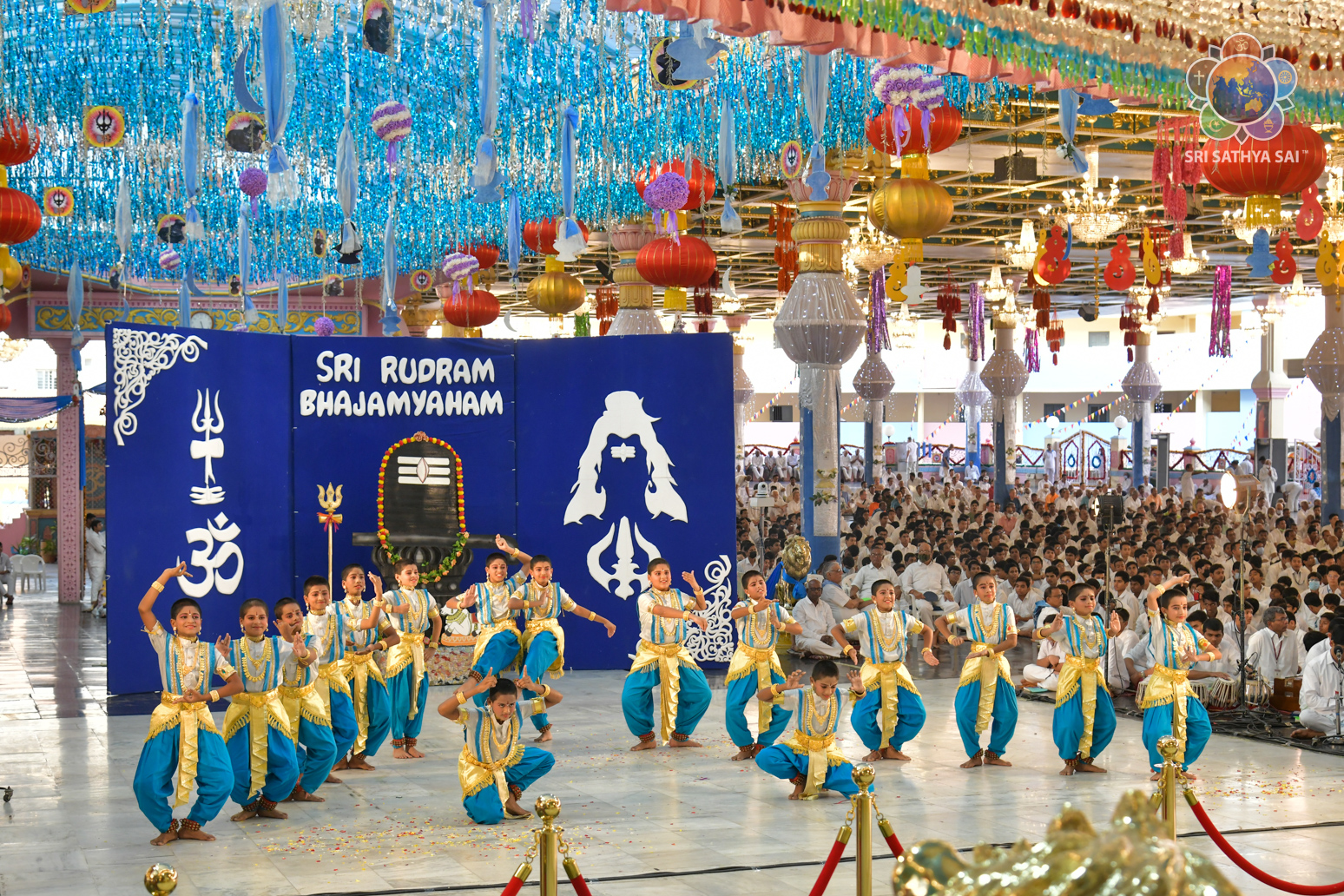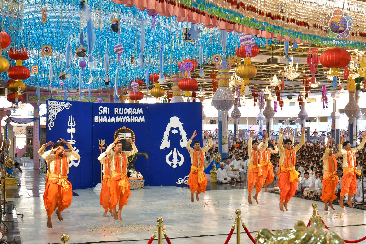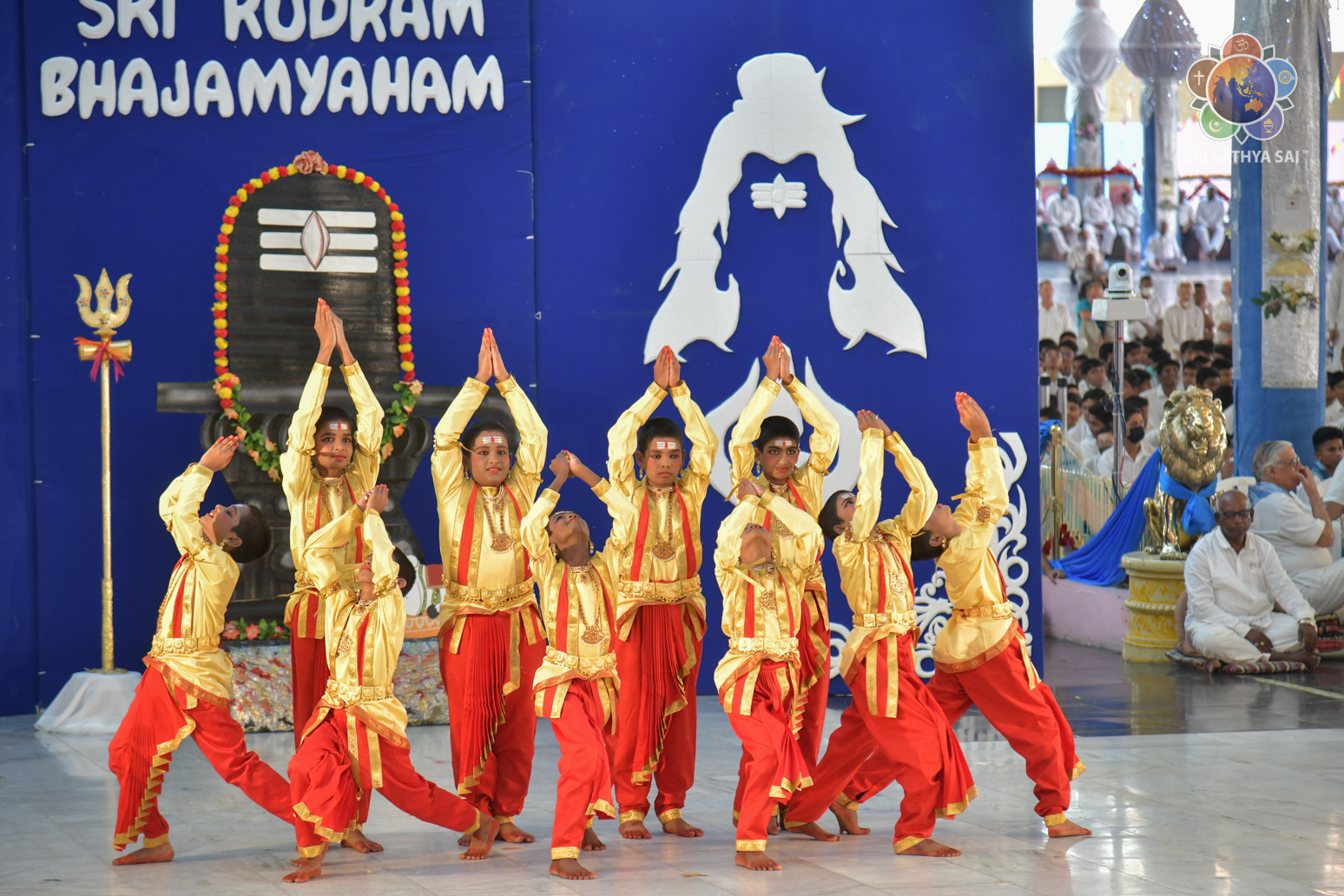 Loving Sai Ram and greetings from Prasanthi Nilayam. On the auspicious eve of Maha Shivaratri, the Prasanthi Dance Group (comprising students from Bhagawan's Educational Institutions) offered a beautiful dance presentation titled 'Sri Rudram Bhajamyaham'.