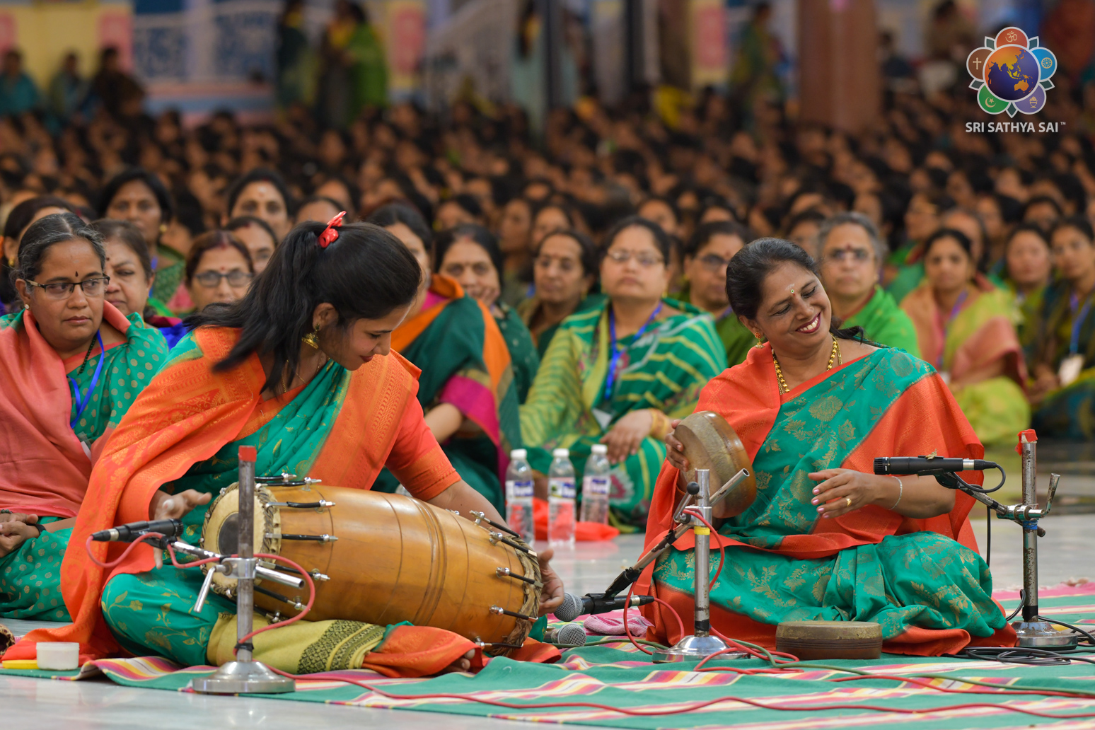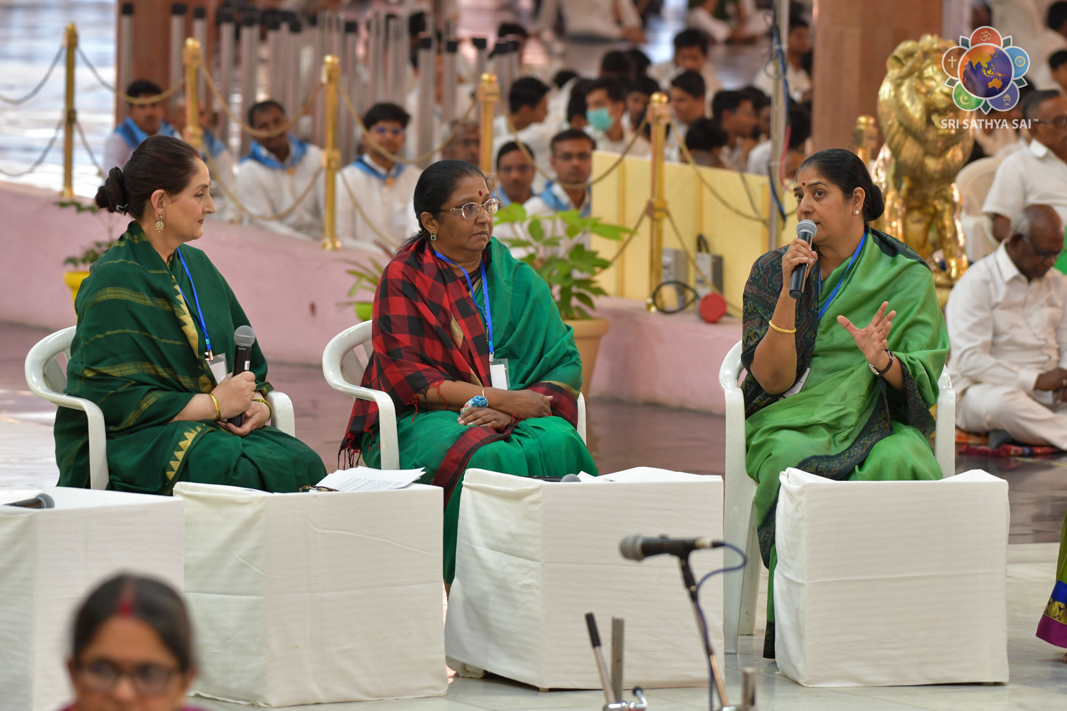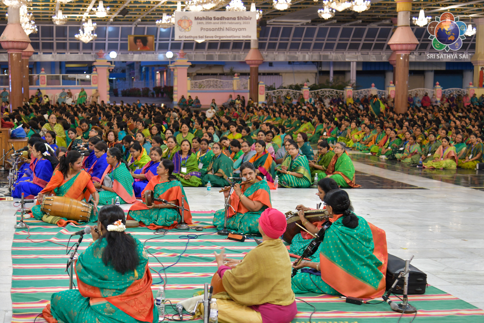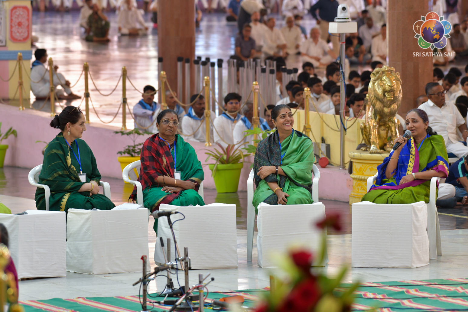 The evening session of the second day of the Mahila Sadhana Shibir began with vedam chanting by Sai women of Odisha. This was followed by an insightful and engaging panel discussion on the topic - Swami Mandate for Women in the Sai Mission. This discussion was moderated by Ms Karuna Munshi, Director, Sri Sathya Sai Vidya Vahini and consisted of five senior women from Bhagawan's institutions - Dr Rajeshwari C Patel, Dr Neelam Desai, Ms Sai Sudha Narayanan, Dr U Suma Rao, and Dr Akhila Indurthi. The cultural programme this evening was by the Mahilas from the state of Karnataka and it was a scintillating instrumental music performance by an all-women ensemble consisting of Veena, Flute, Morsing, Ghatam, Violin, and Kanjira. The session ended with bhajans by Brindavan Mahila Bhajan group.