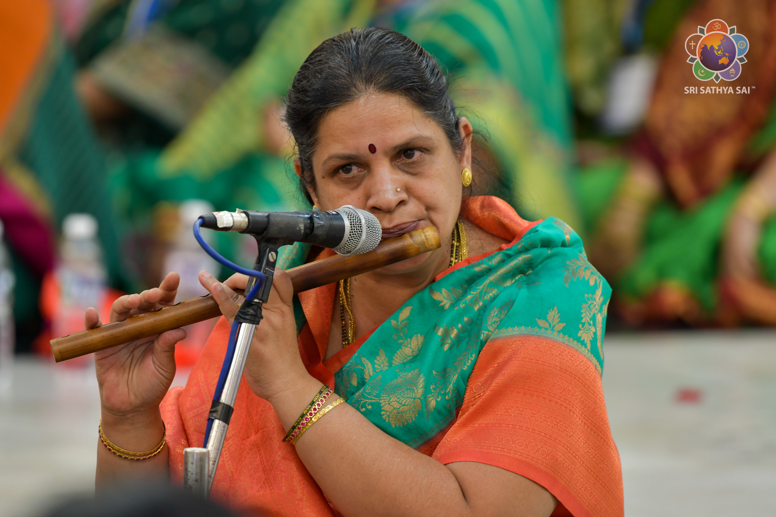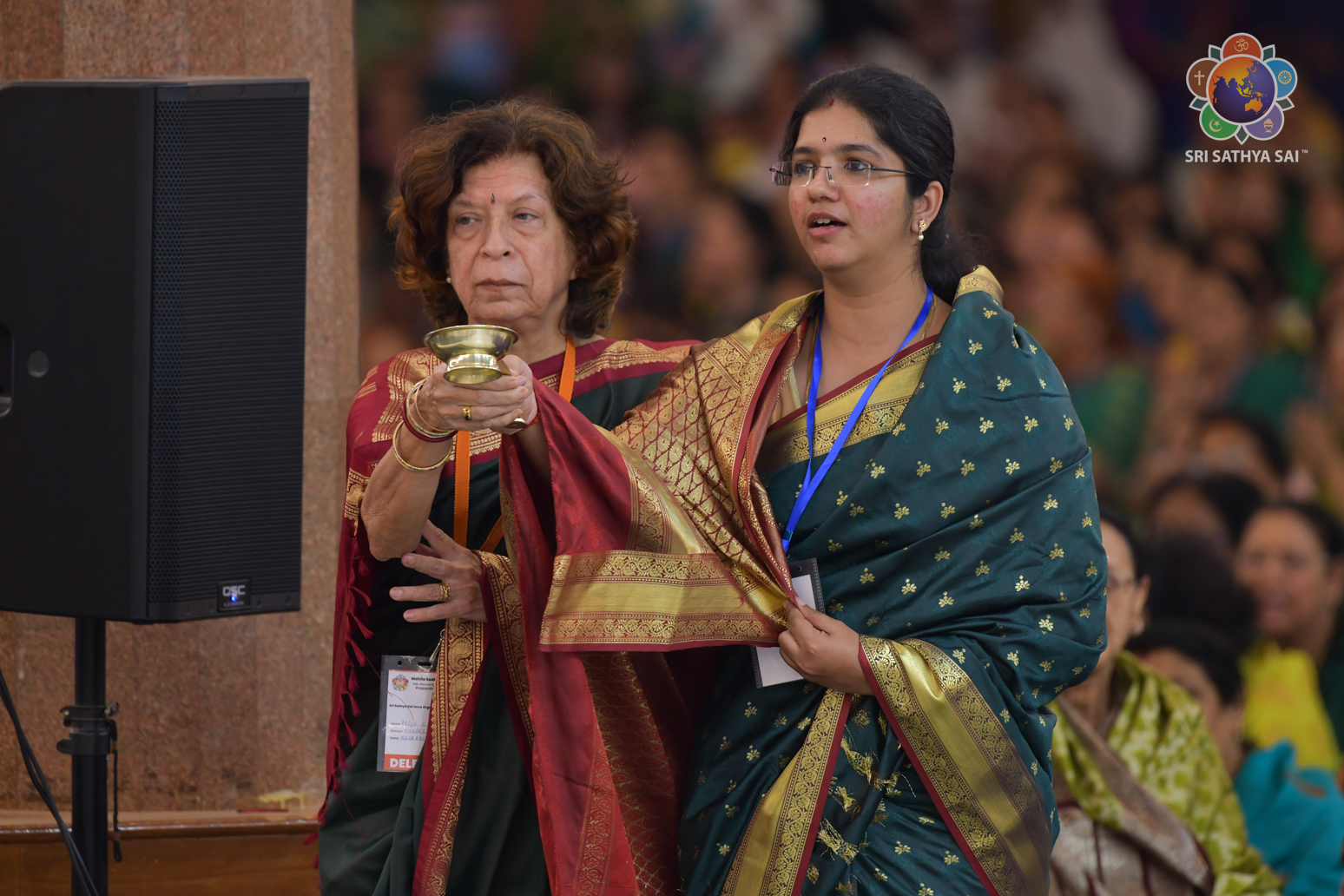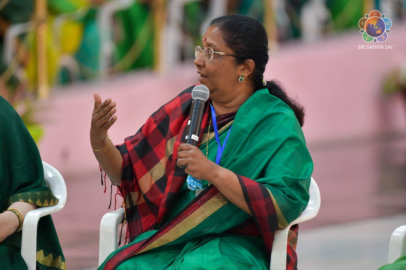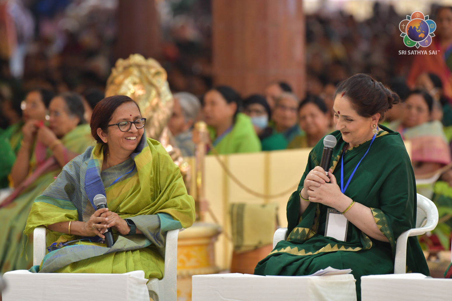 The evening session of the second day of the Mahila Sadhana Shibir began with vedam chanting by Sai women of Odisha. This was followed by an insightful and engaging panel discussion on the topic - Swami Mandate for Women in the Sai Mission. This discussion was moderated by Ms Karuna Munshi, Director, Sri Sathya Sai Vidya Vahini and consisted of five senior women from Bhagawan's institutions - Dr Rajeshwari C Patel, Dr Neelam Desai, Ms Sai Sudha Narayanan, Dr U Suma Rao, and Dr Akhila Indurthi. The cultural programme this evening was by the Mahilas from the state of Karnataka and it was a scintillating instrumental music performance by an all-women ensemble consisting of Veena, Flute, Morsing, Ghatam, Violin, and Kanjira. The session ended with bhajans by Brindavan Mahila Bhajan group.