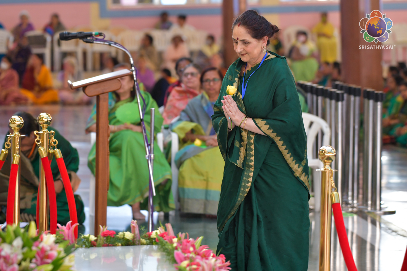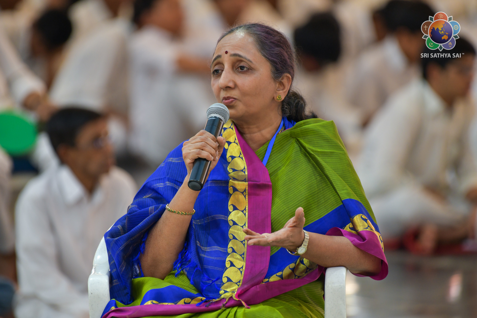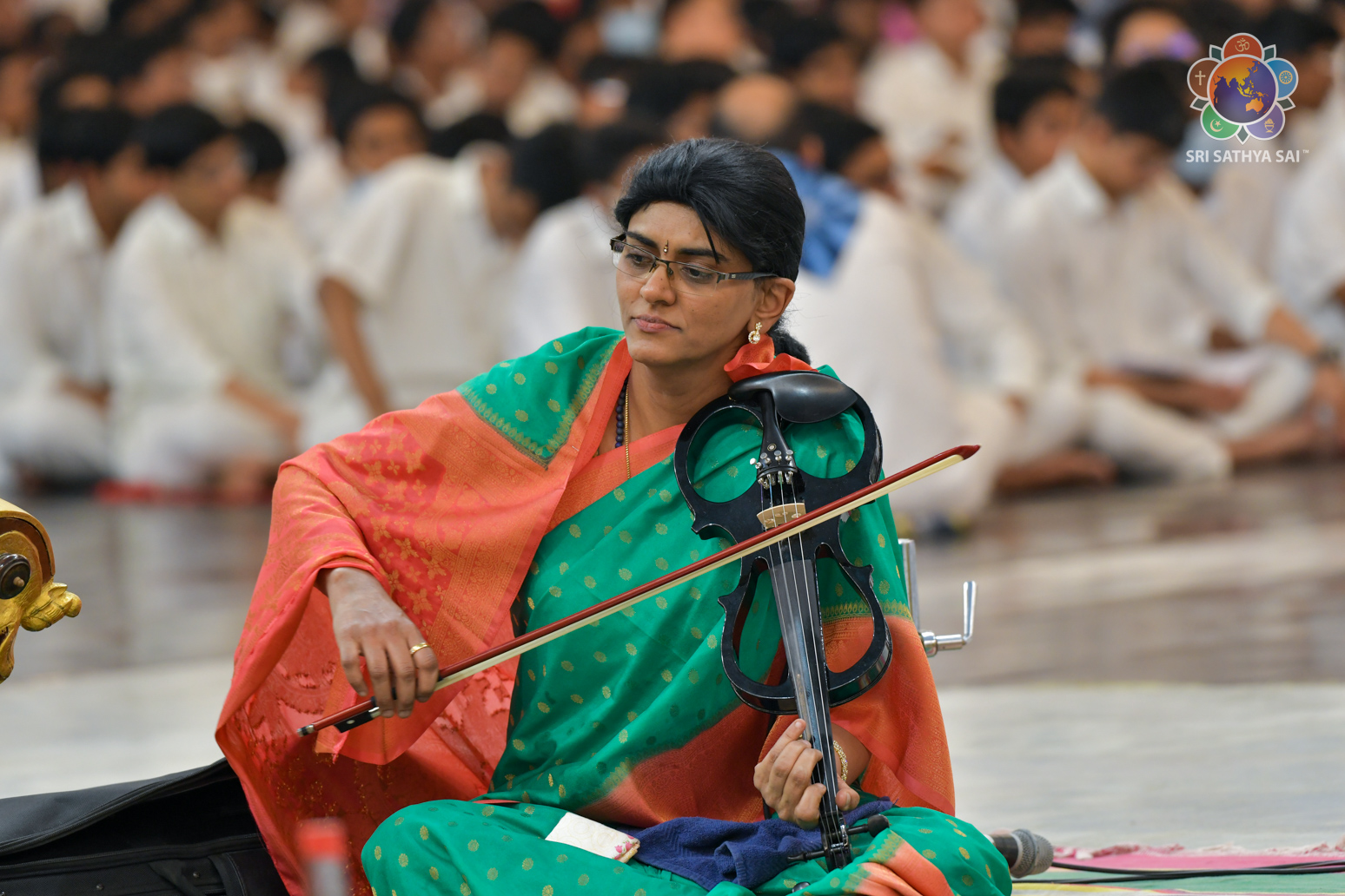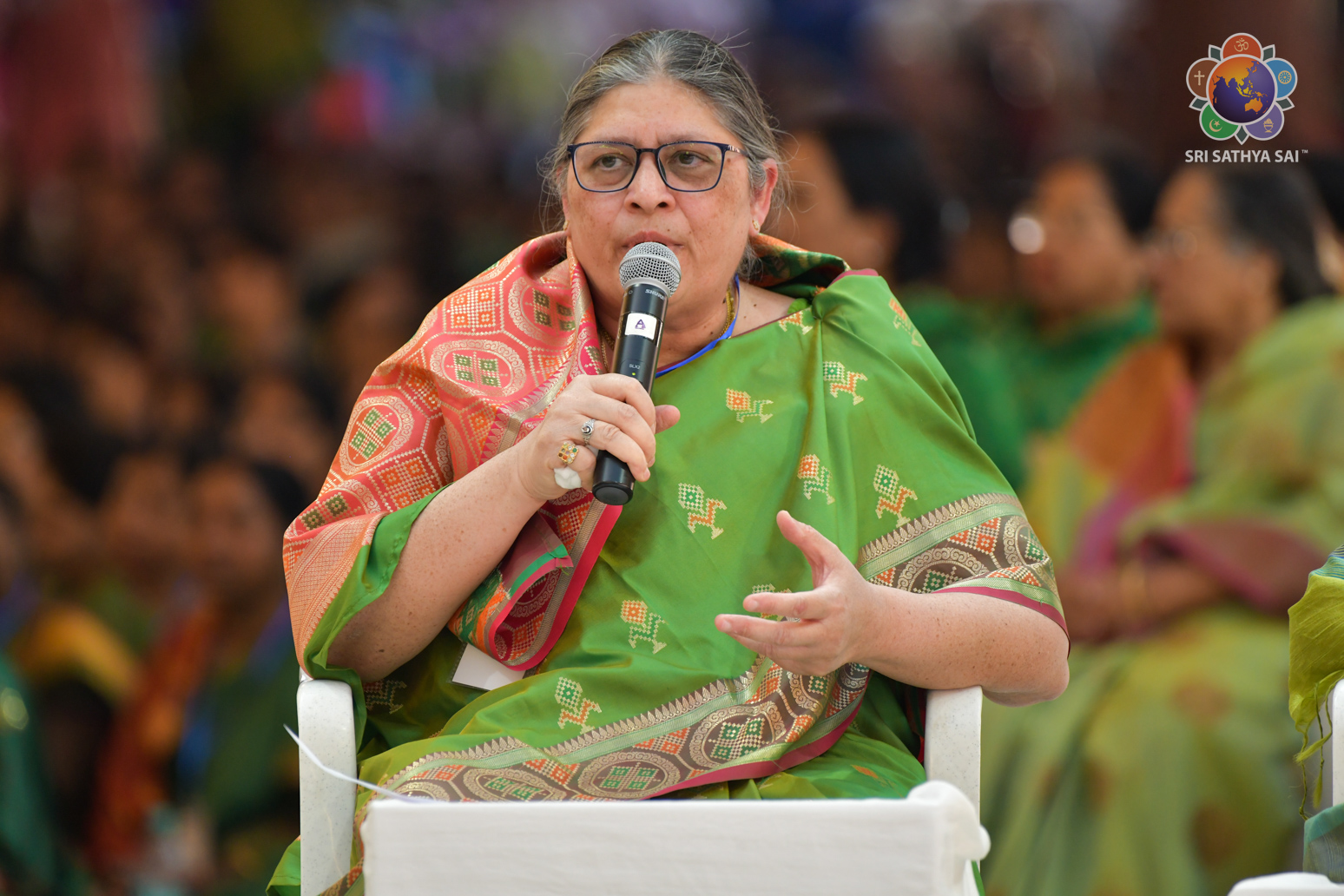 The evening session of the second day of the Mahila Sadhana Shibir began with vedam chanting by Sai women of Odisha. This was followed by an insightful and engaging panel discussion on the topic - Swami Mandate for Women in the Sai Mission. This discussion was moderated by Ms Karuna Munshi, Director, Sri Sathya Sai Vidya Vahini and consisted of five senior women from Bhagawan's institutions - Dr Rajeshwari C Patel, Dr Neelam Desai, Ms Sai Sudha Narayanan, Dr U Suma Rao, and Dr Akhila Indurthi. The cultural programme this evening was by the Mahilas from the state of Karnataka and it was a scintillating instrumental music performance by an all-women ensemble consisting of Veena, Flute, Morsing, Ghatam, Violin, and Kanjira. The session ended with bhajans by Brindavan Mahila Bhajan group.