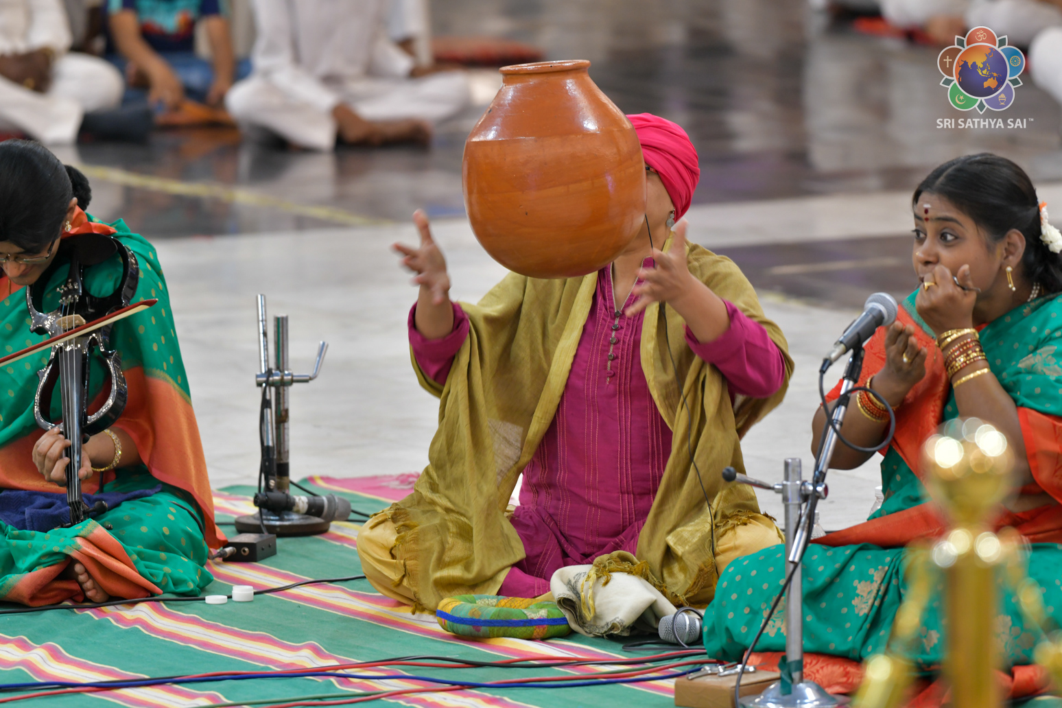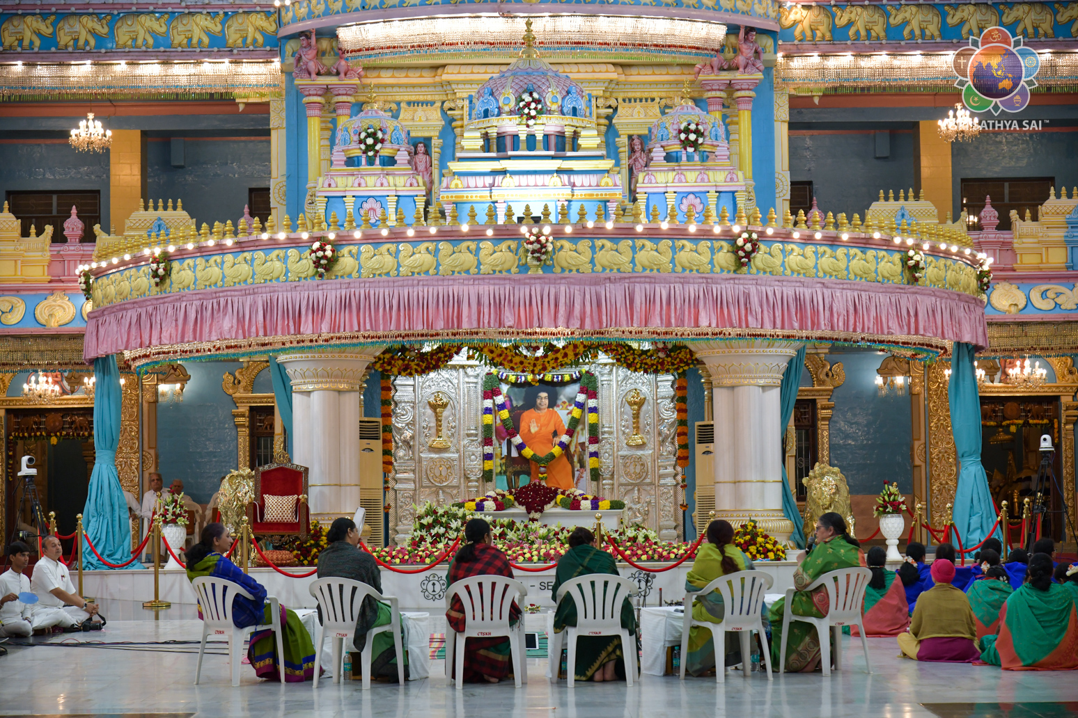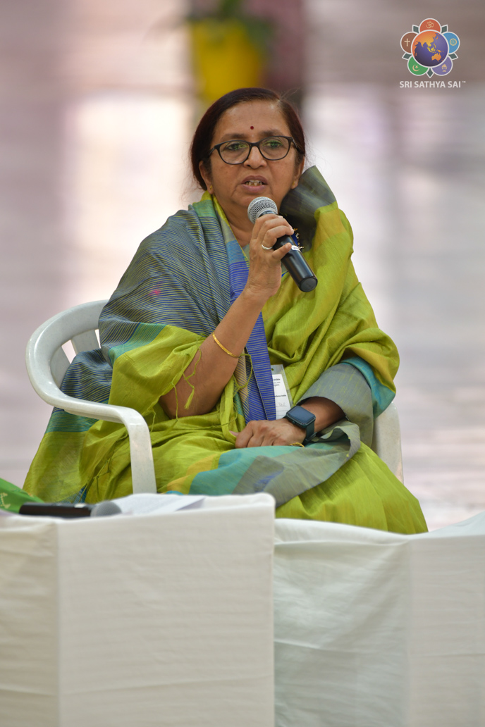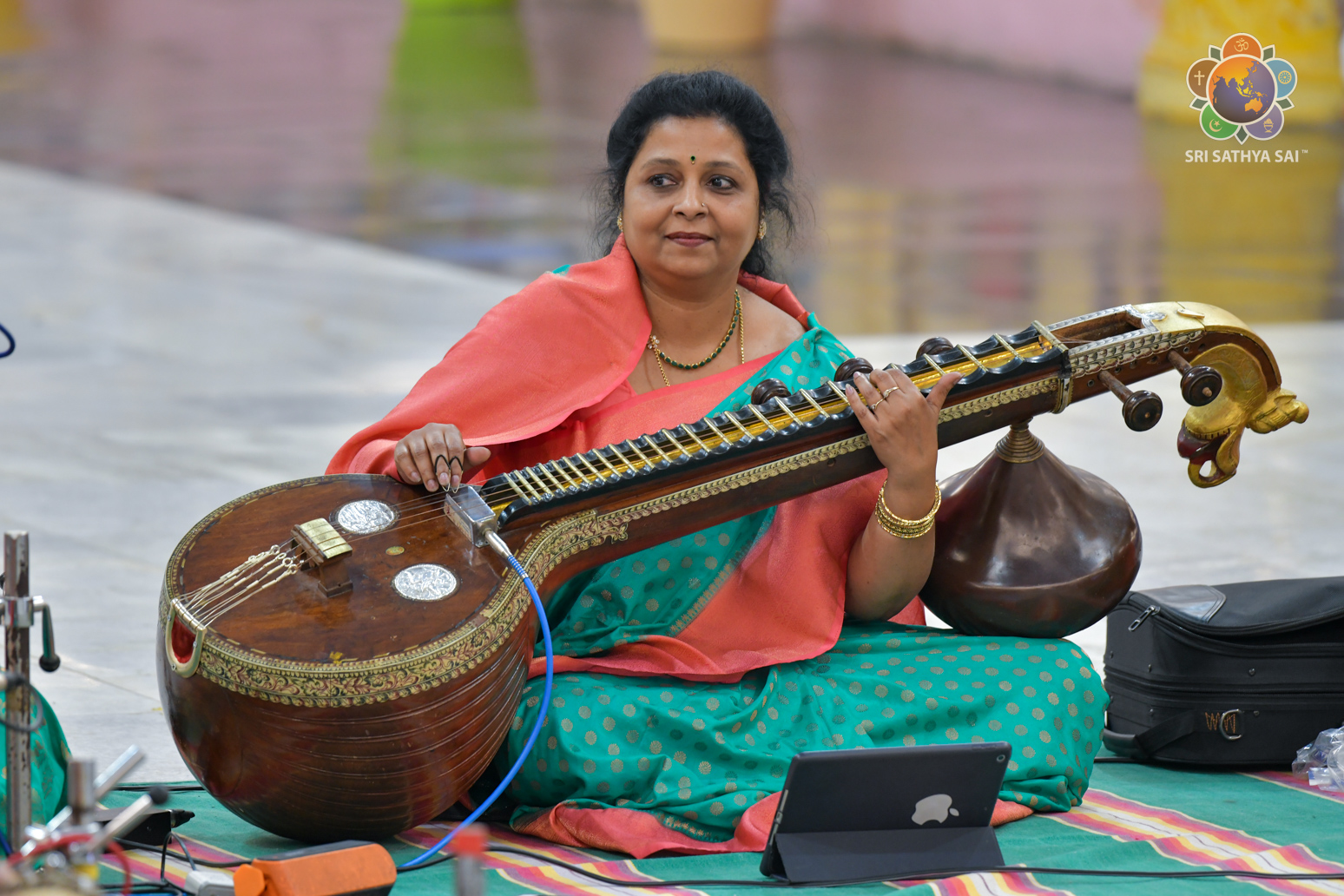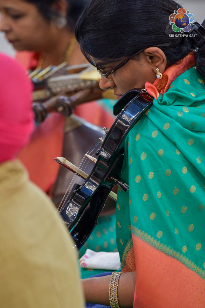 The evening session of the second day of the Mahila Sadhana Shibir began with vedam chanting by Sai women of Odisha. This was followed by an insightful and engaging panel discussion on the topic - Swami Mandate for Women in the Sai Mission. This discussion was moderated by Ms Karuna Munshi, Director, Sri Sathya Sai Vidya Vahini and consisted of five senior women from Bhagawan's institutions - Dr Rajeshwari C Patel, Dr Neelam Desai, Ms Sai Sudha Narayanan, Dr U Suma Rao, and Dr Akhila Indurthi. The cultural programme this evening was by the Mahilas from the state of Karnataka and it was a scintillating instrumental music performance by an all-women ensemble consisting of Veena, Flute, Morsing, Ghatam, Violin, and Kanjira. The session ended with bhajans by Brindavan Mahila Bhajan group.