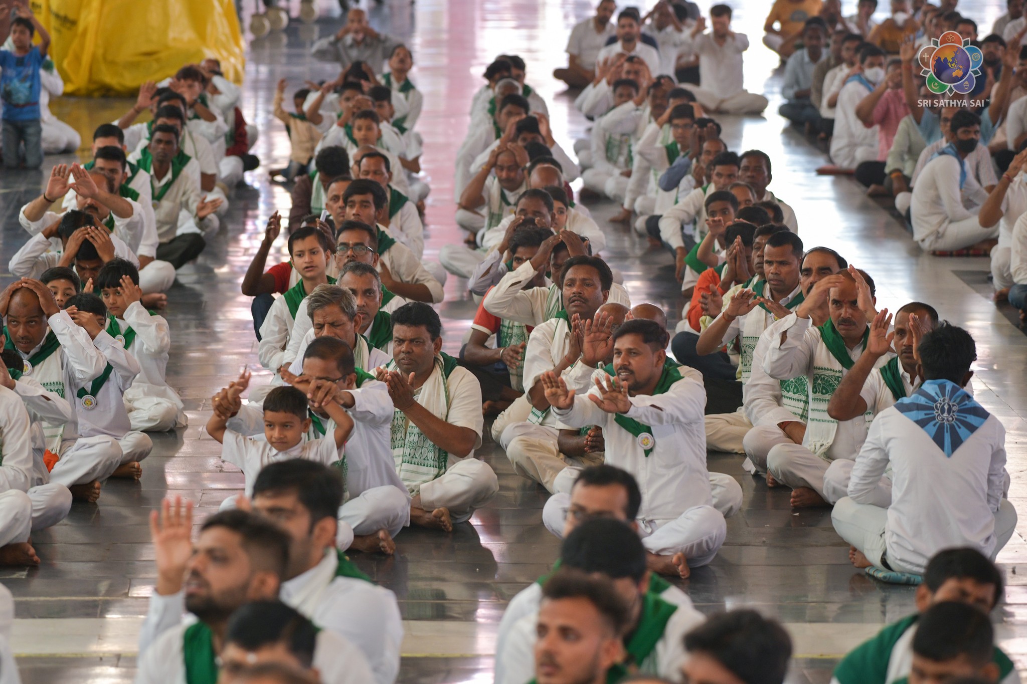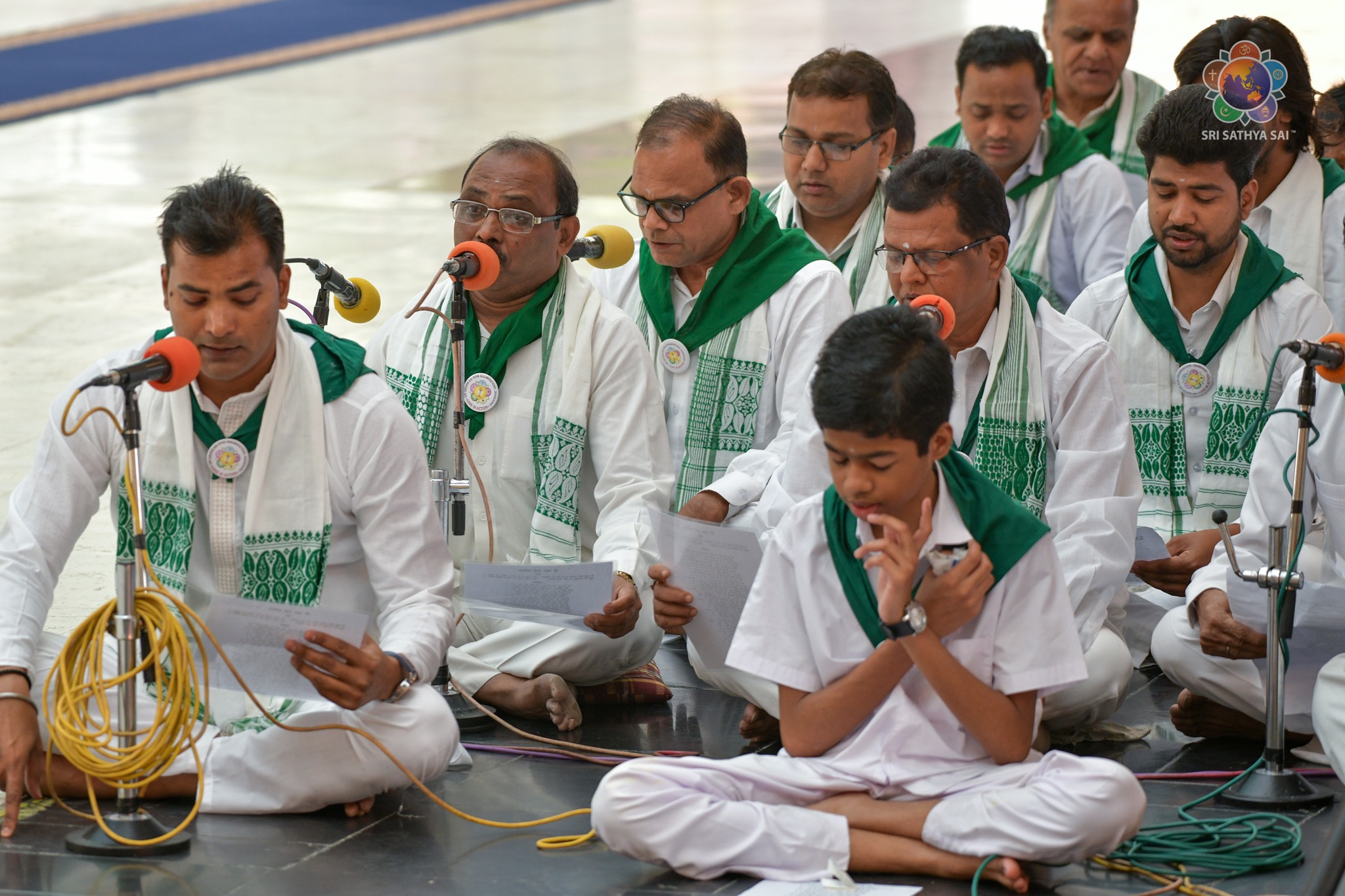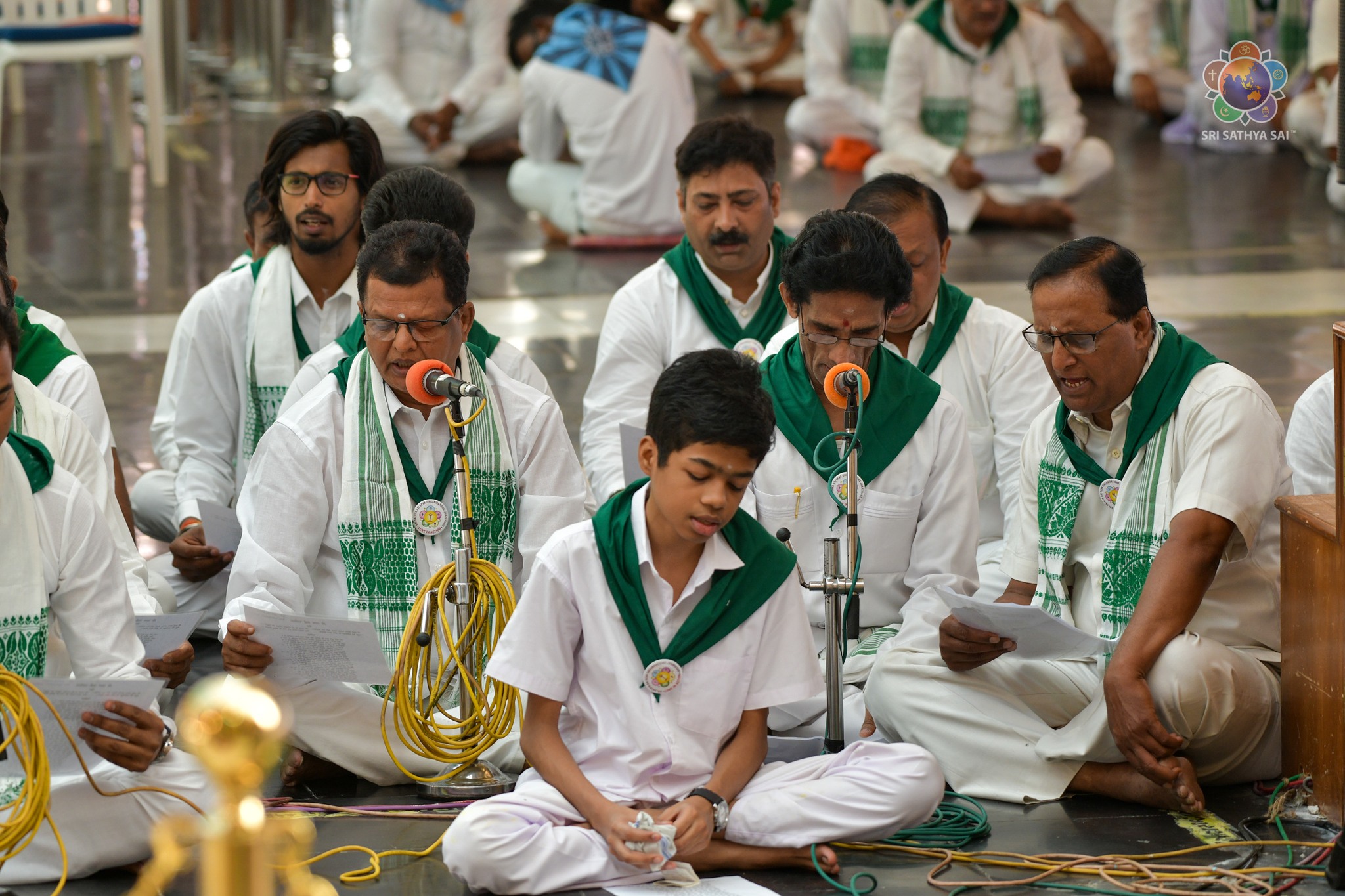 Loving Sai Ram and greetings from Prasanthi Nilayam. As part of the ongoing Jharkhand Devotees' Parthi Yatra, this morning they recited shlokas from Chapter 12, Srimad Bhagawad Gita along with explanation centred around Bhakti Yoga. The devotees then chanted Sri Sathya Sai Chalisa in unison.