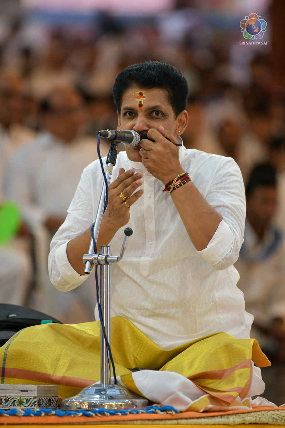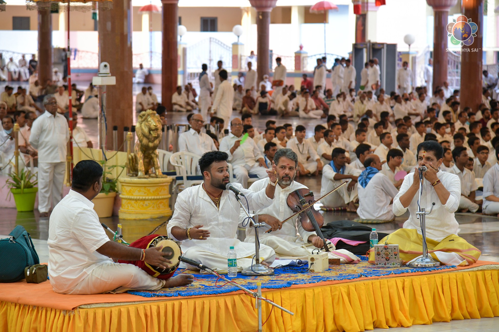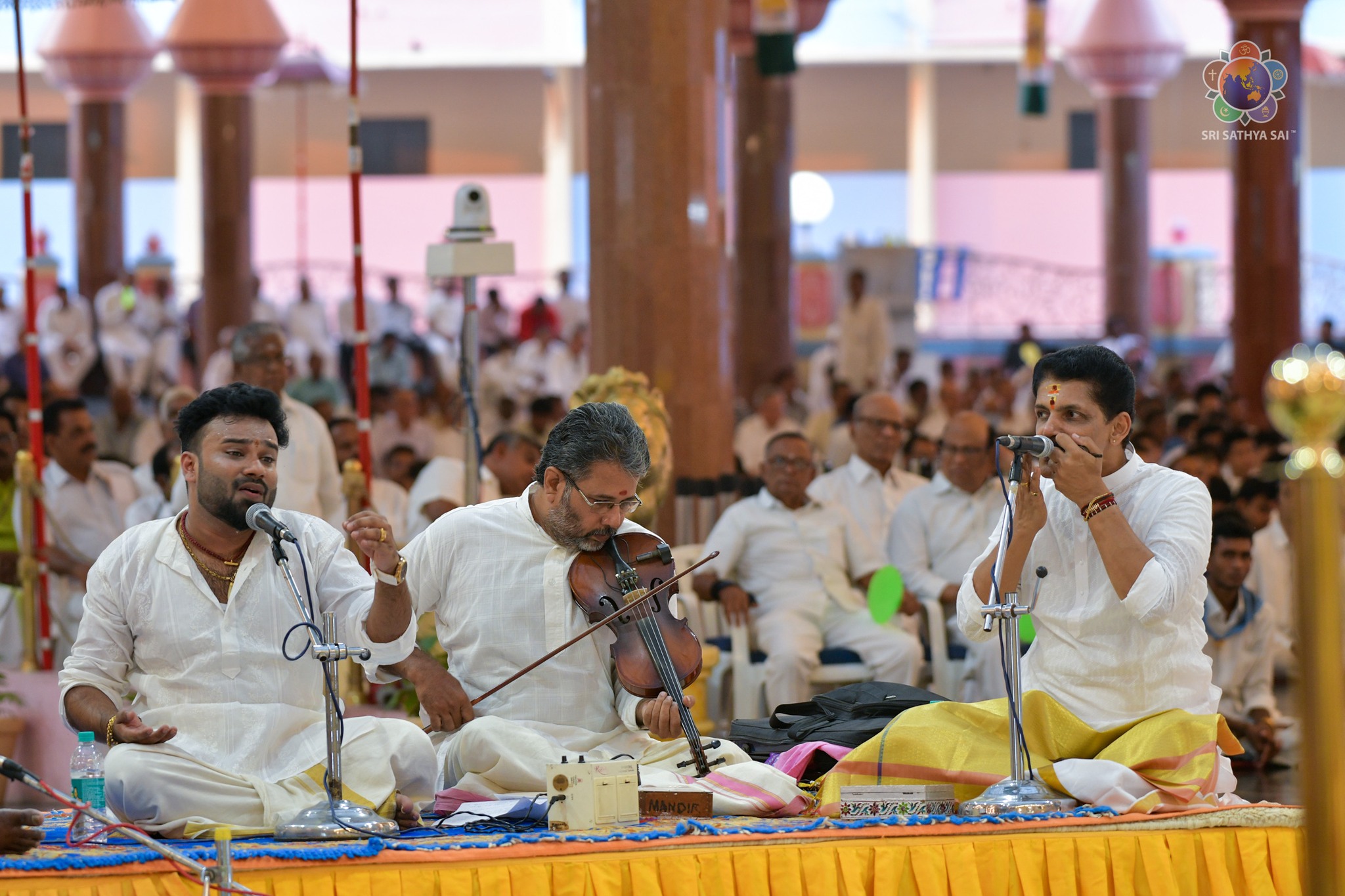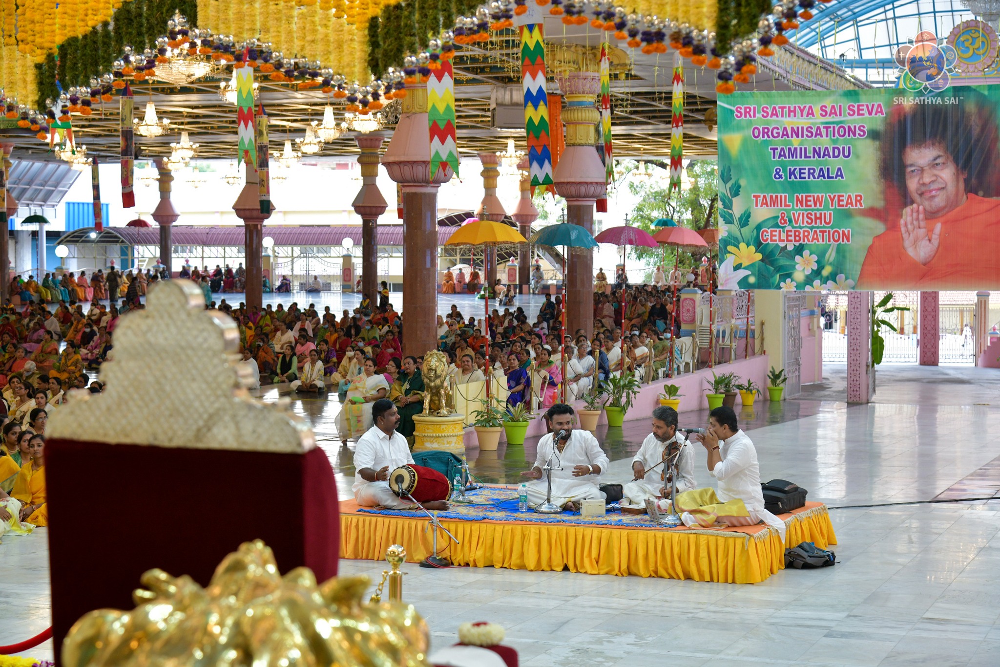 As part of the Vishu celebrations at Prasanthi Nilayam, Sri Vishnudas Kallekulangara along with fellow musicians offered a devotional music concert. Earlier this evening, Sri Suman Billa, IAS, Principal Secretary (Industries & NORKA) Govt of Kerala addressed the gathering. Talking about how his life transformed after coming into Bhagawan's fold, Sri Billa shared how Swami cured him during the Covid pandemic.