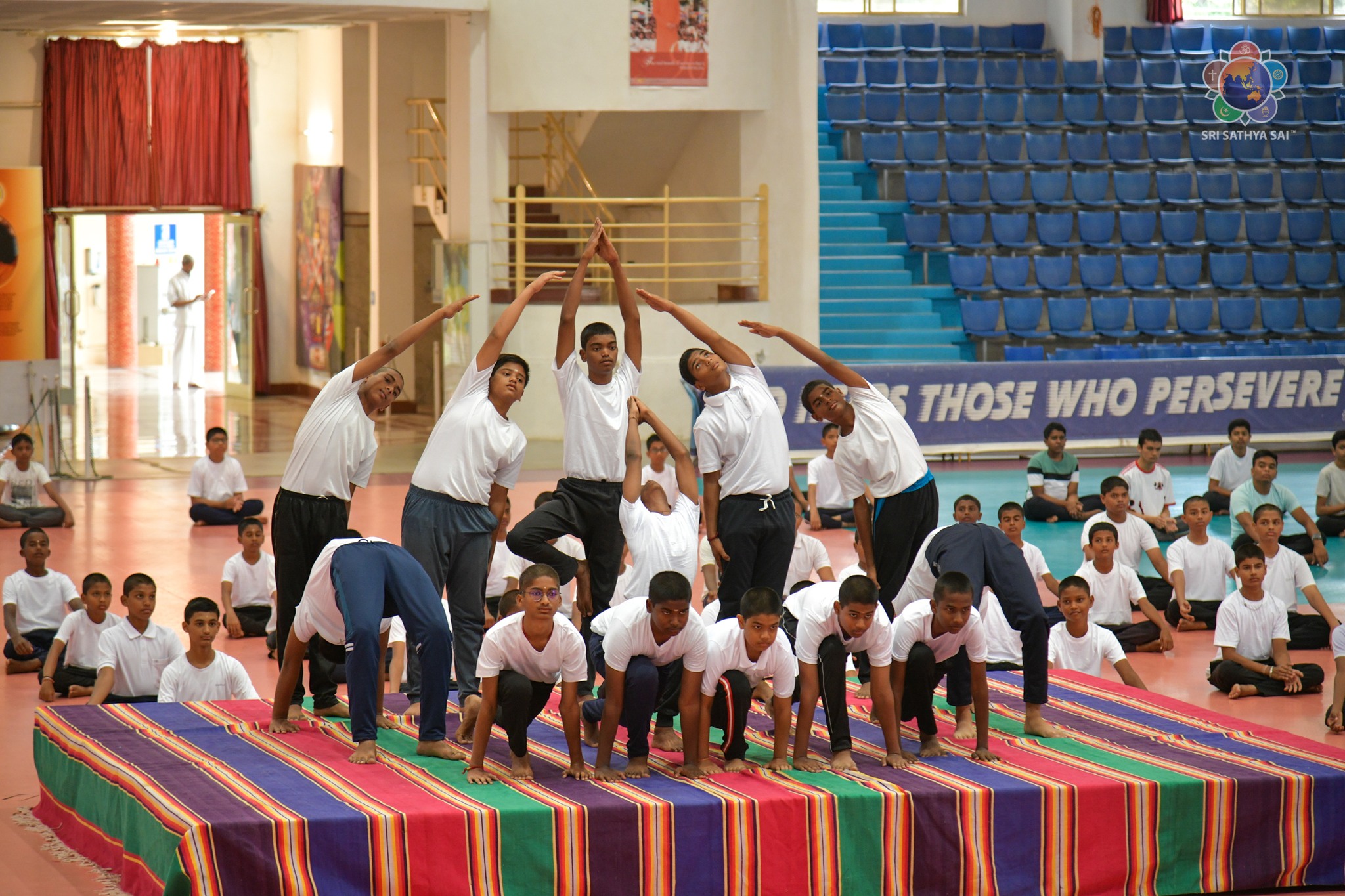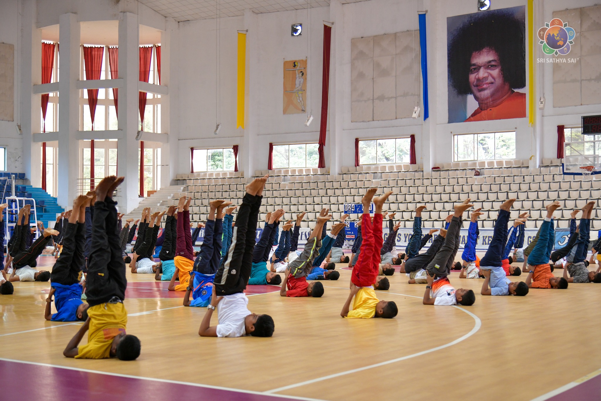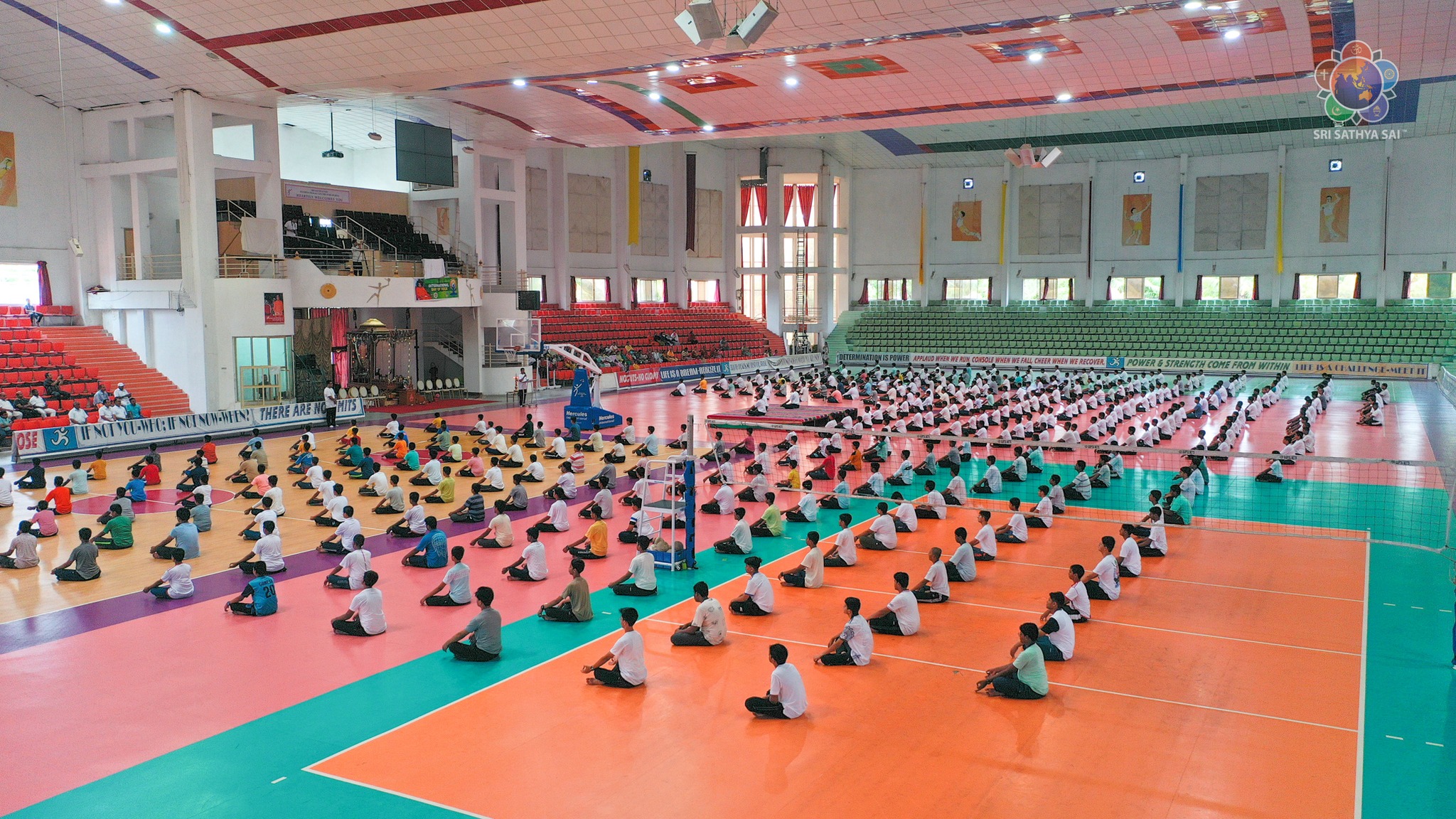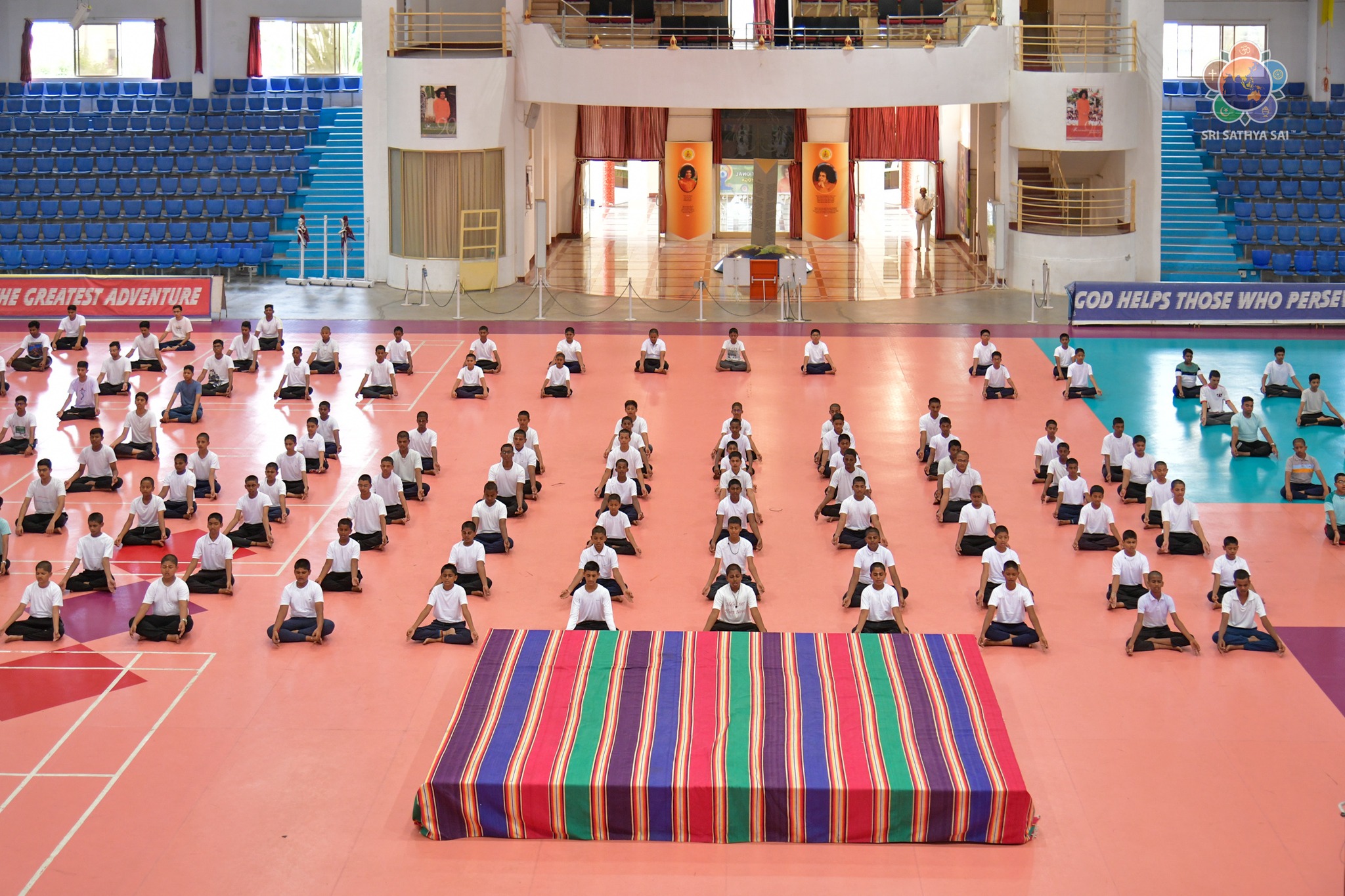 Loving Sairam and greetings from Prasanthi Nilayam. On December 11, 2014, the United Nations General Assembly declared 21 June International Yoga Day. Ever since, the day has been observed with much enthusiasm in Bhagawan's educational institutions. Around 400 students from the Sri Sathya Sai Higher Secondary School and the Smt Easwaramma High School at Prasanthi Nilayam put up a brilliant performance of asanas and formations this morning at the Indoor Stadium as their offering to Swami. Even though the academic year 2023-24 commenced just a couple of days ago, with minimal practice the students made a commendable offering along with the teachers and yoga instructors.