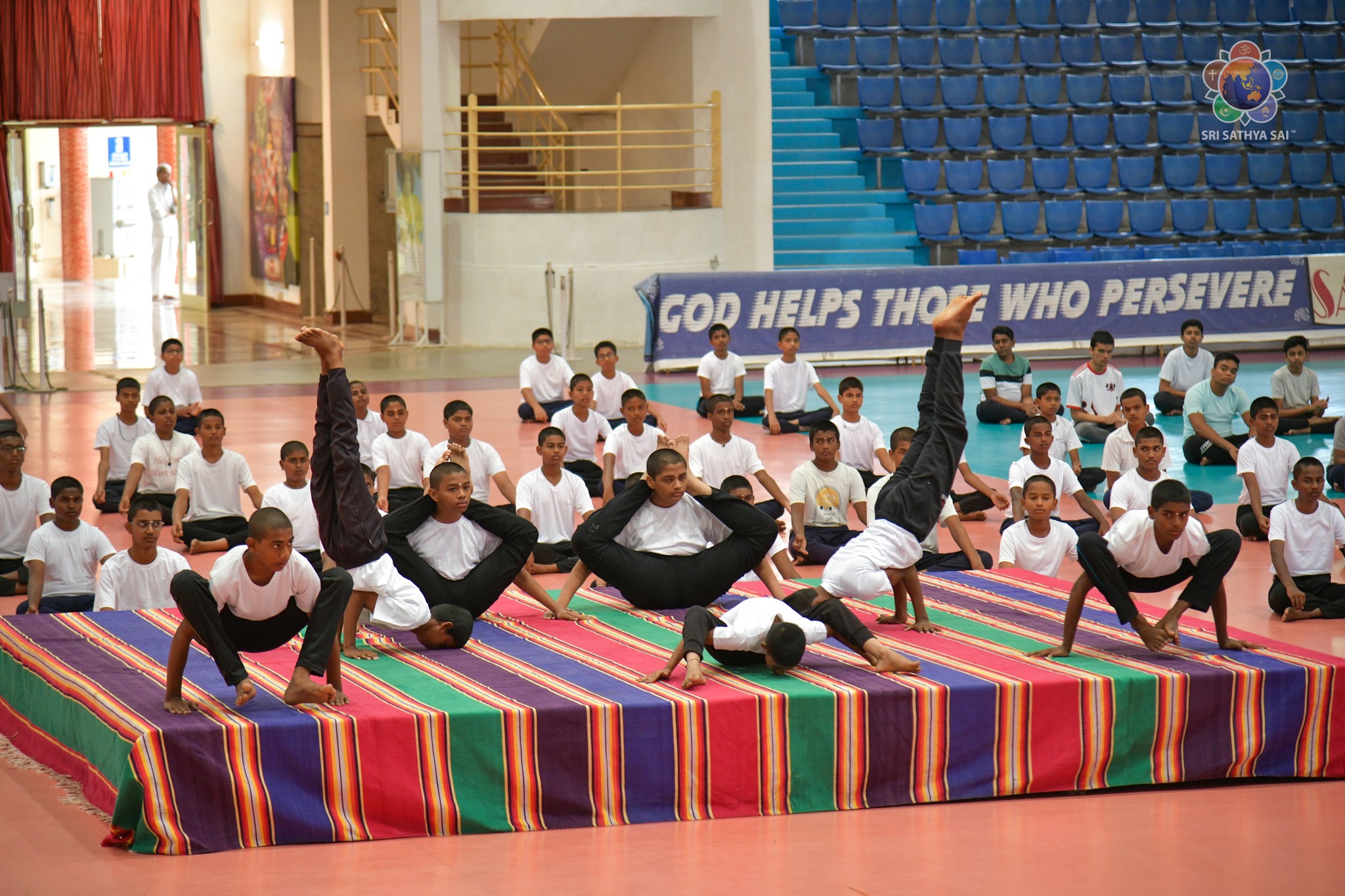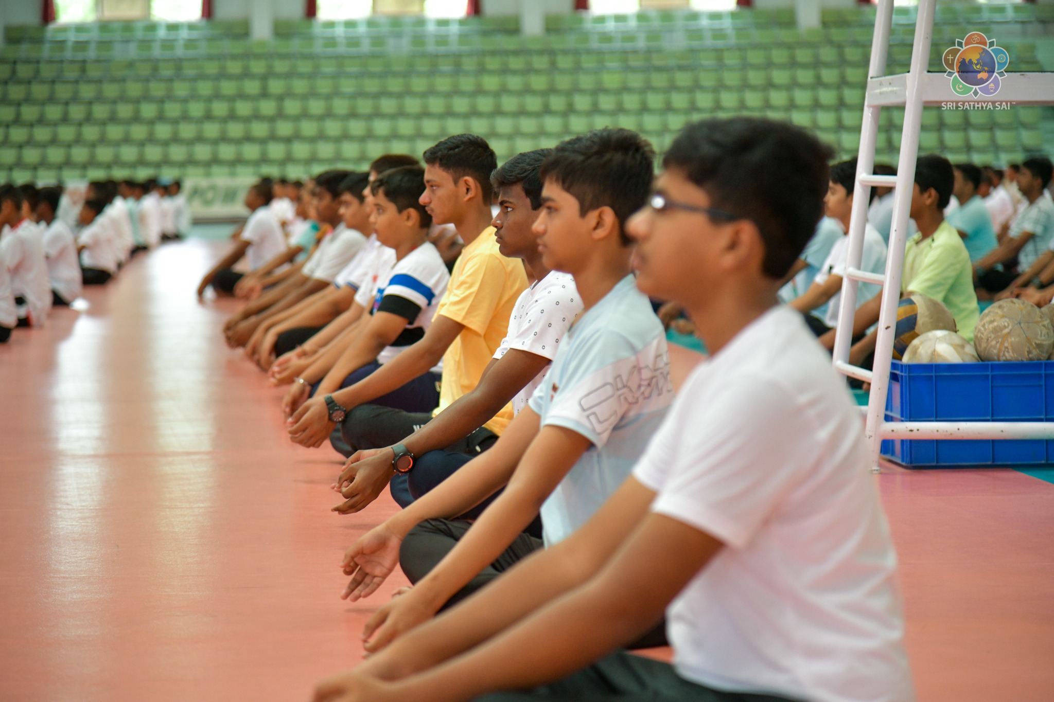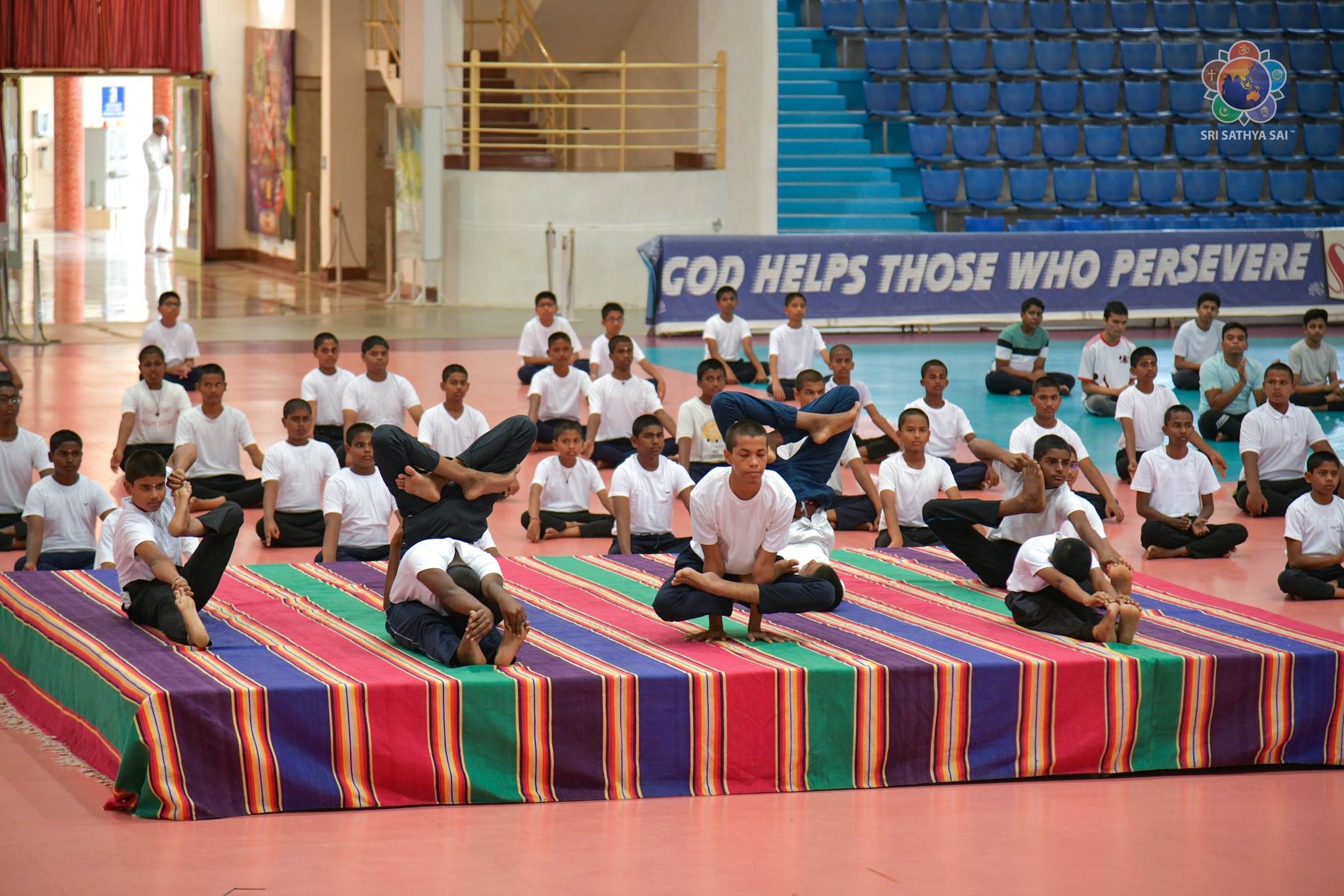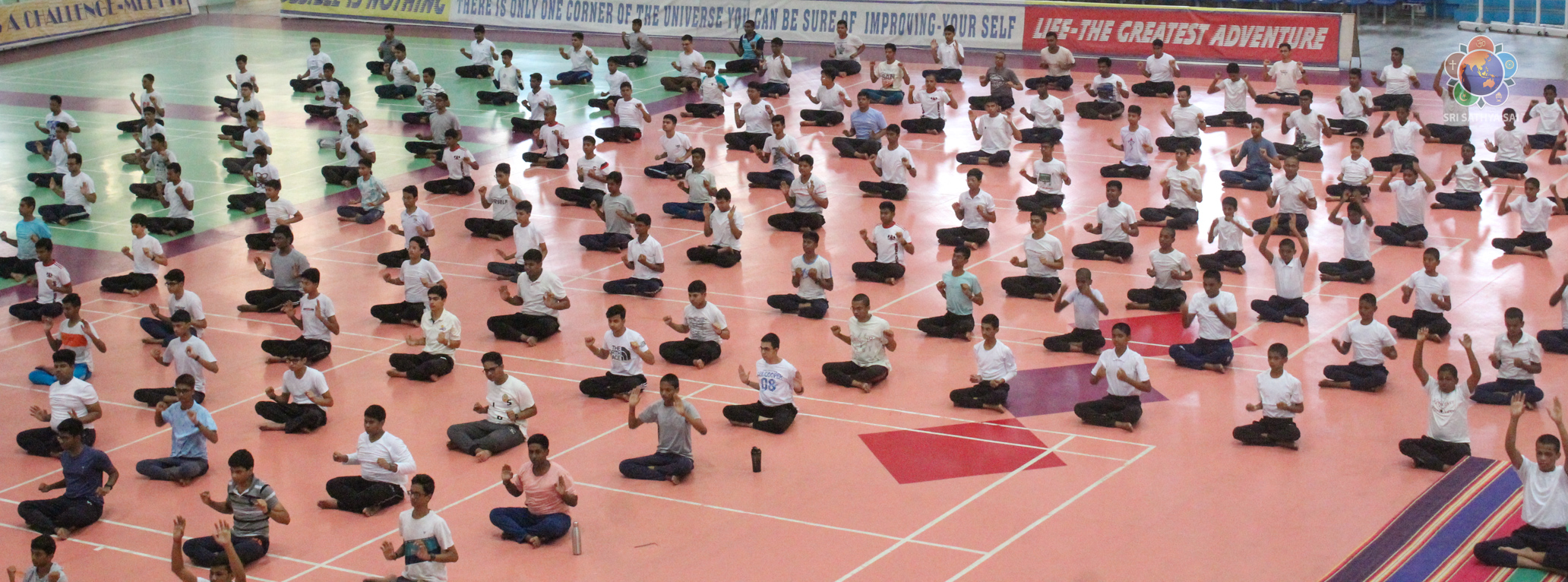 Loving Sairam and greetings from Prasanthi Nilayam. On December 11, 2014, the United Nations General Assembly declared 21 June International Yoga Day. Ever since, the day has been observed with much enthusiasm in Bhagawan's educational institutions. Around 400 students from the Sri Sathya Sai Higher Secondary School and the Smt Easwaramma High School at Prasanthi Nilayam put up a brilliant performance of asanas and formations this morning at the Indoor Stadium as their offering to Swami. Even though the academic year 2023-24 commenced just a couple of days ago, with minimal practice the students made a commendable offering along with the teachers and yoga instructors.