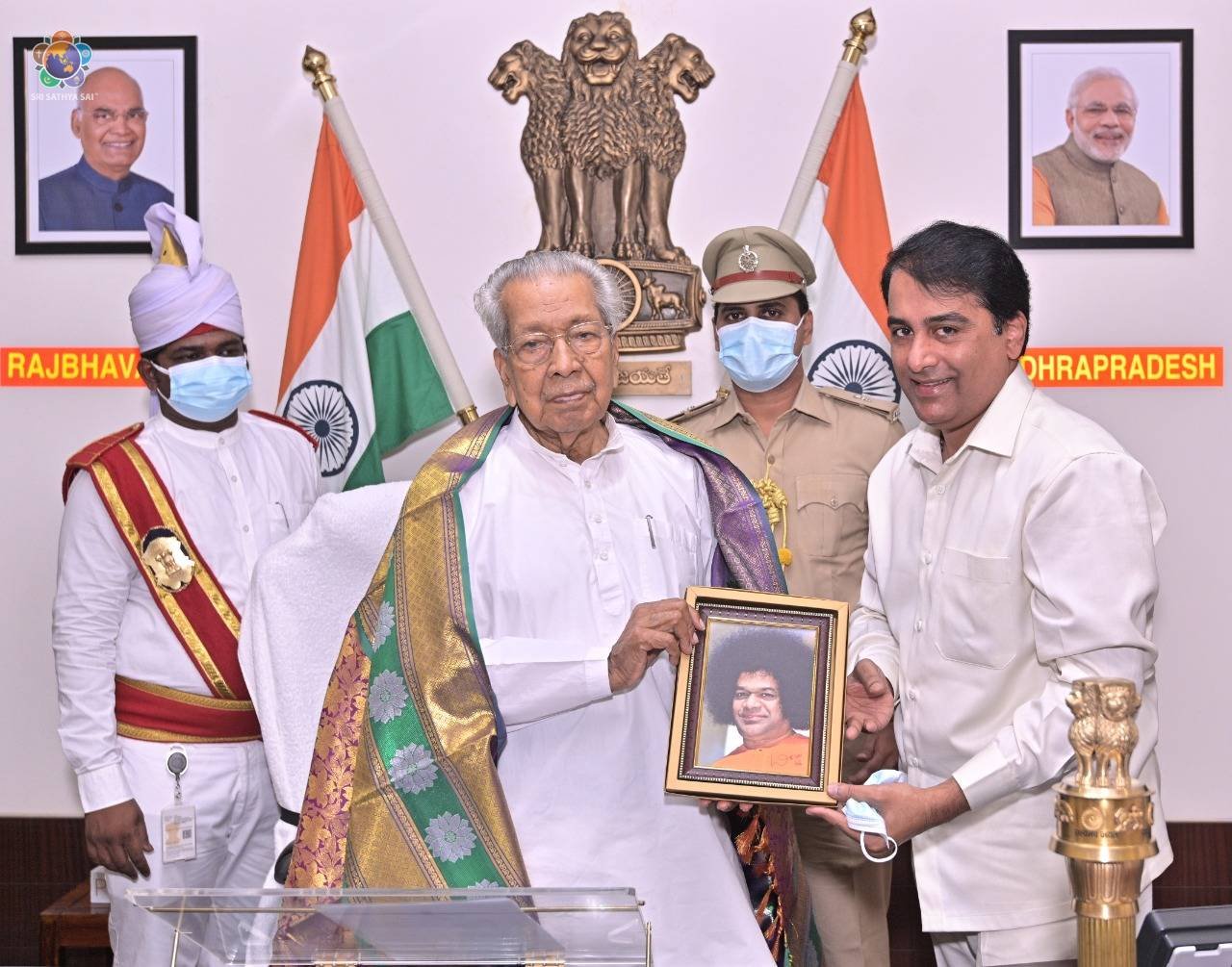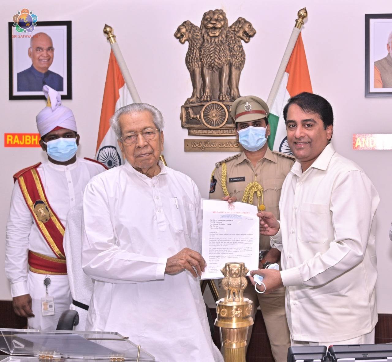 Sri RJ Rathnakar, Managing Trustee, Sri Sathya Sai Central Trust, Prasanthi Nilayam met Sri Biswa Bhusan Harichandan, Hon'ble Governor of Andhra Pradesh in the Raj Bhavan earlier today. The Hon'ble Governor, for about 20 minutes, enquired about the happenings at the Ashram and activities of the Sri Sathya Sai Central Trust. He very fondly recollected his last visit to Prasanthi Nilayam when Bhagawan was physically present.