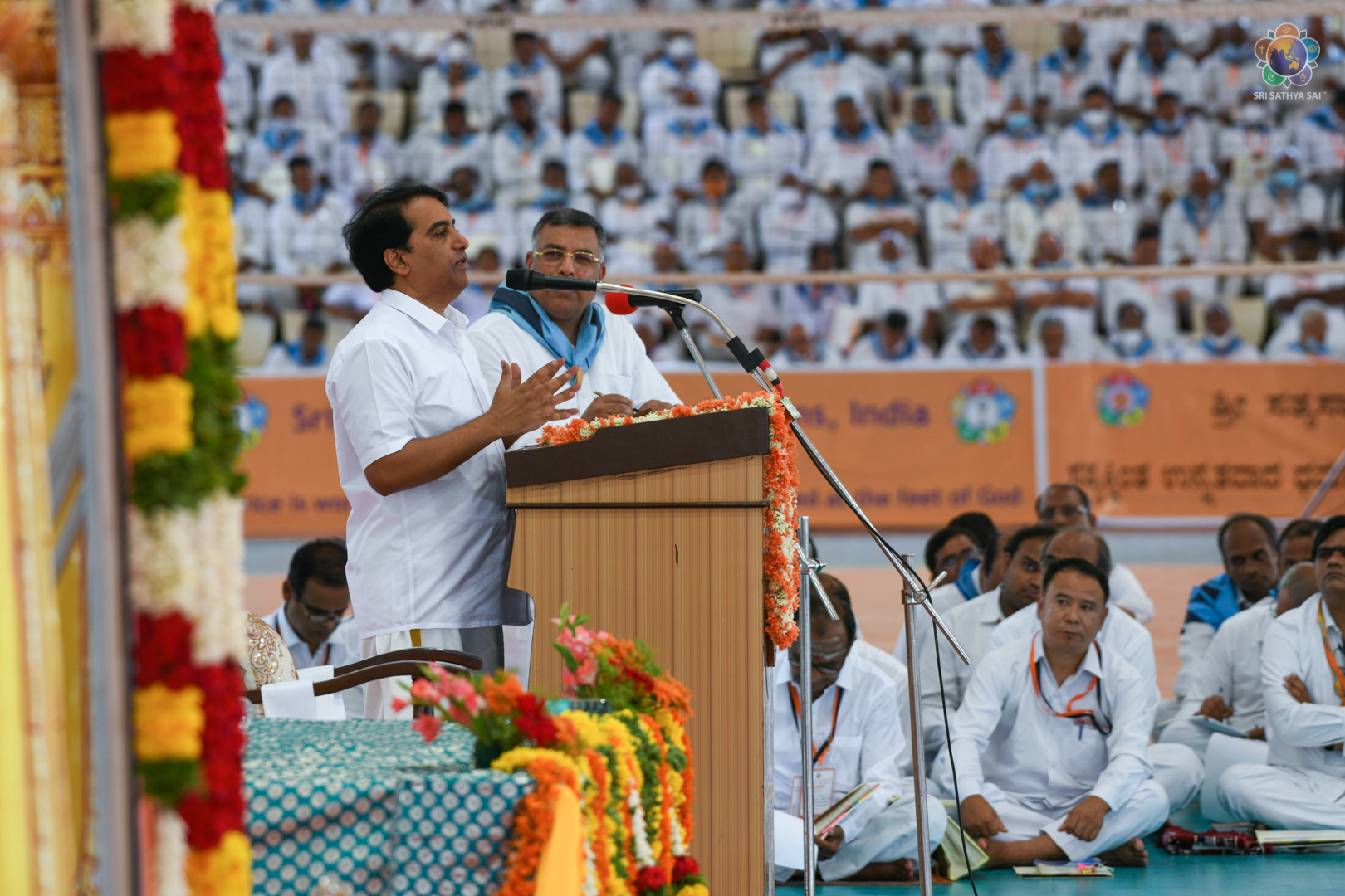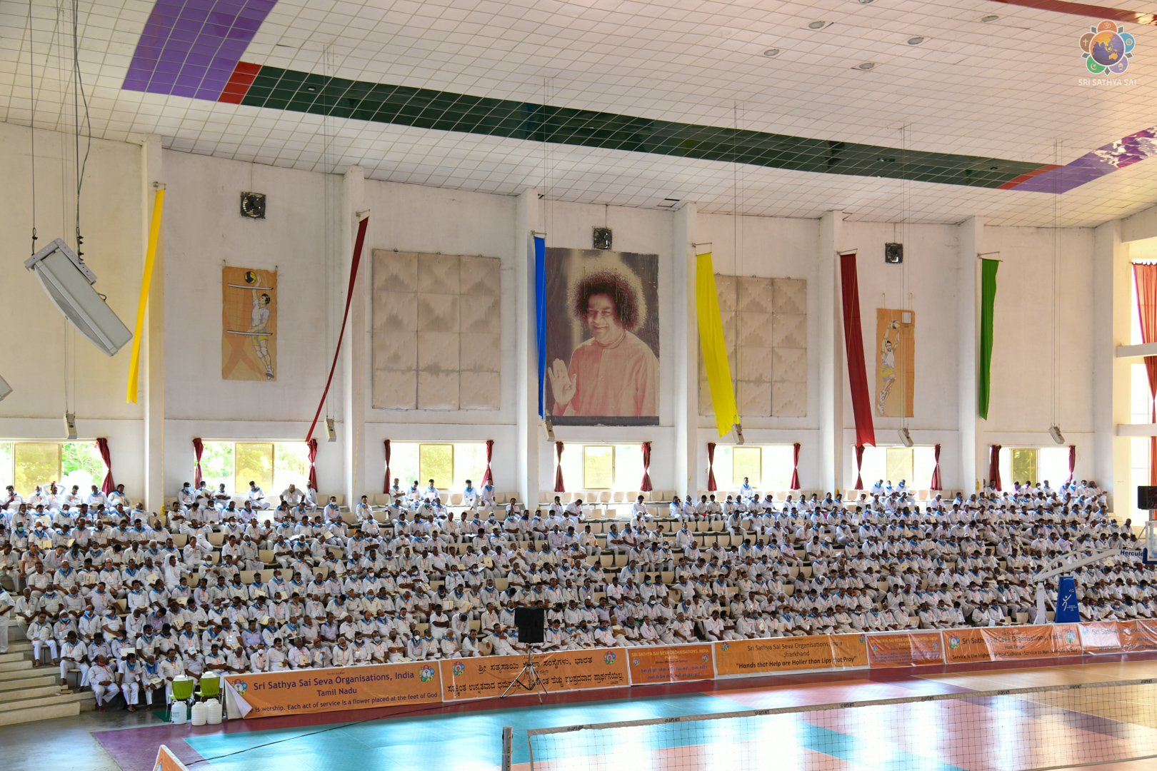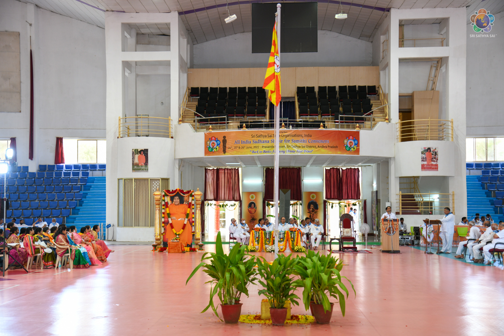 The Plenary Session was conducted in the Sri Sathya Sai International Centre for Sports (Indoor Stadium) later. After the Unfurling of the SSSSO Flag event, Sri Nimish Pandya elaborated on the purpose of this Sadhana Camp. Recalling the interactions with Bhagawan, he reiterated SSSSO is not any normal NGO, but GOD's Organisation.